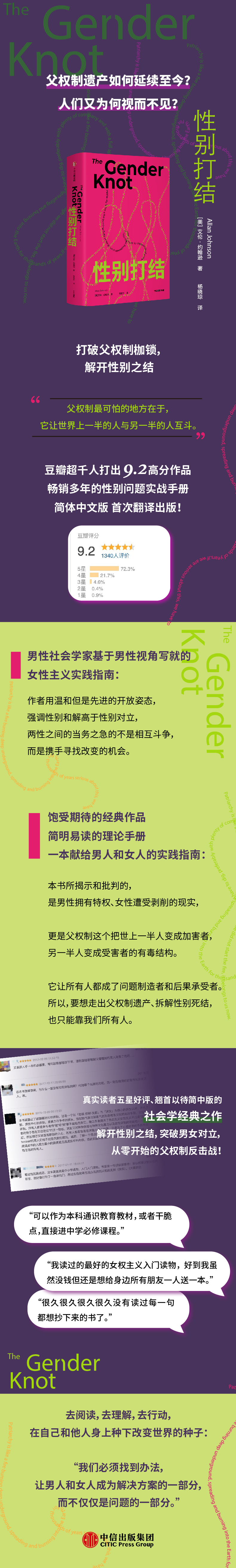 本书所揭示和批判的,是男性拥有特权、女性遭受剥削的现实,更是父权制这个把世上一半人变成加害者,另一半人变成受害者的有毒结构,它让有人都成了问题制造者和后果承受者。所以,同样的,要想拆解性别死结,也只能靠我们有人。