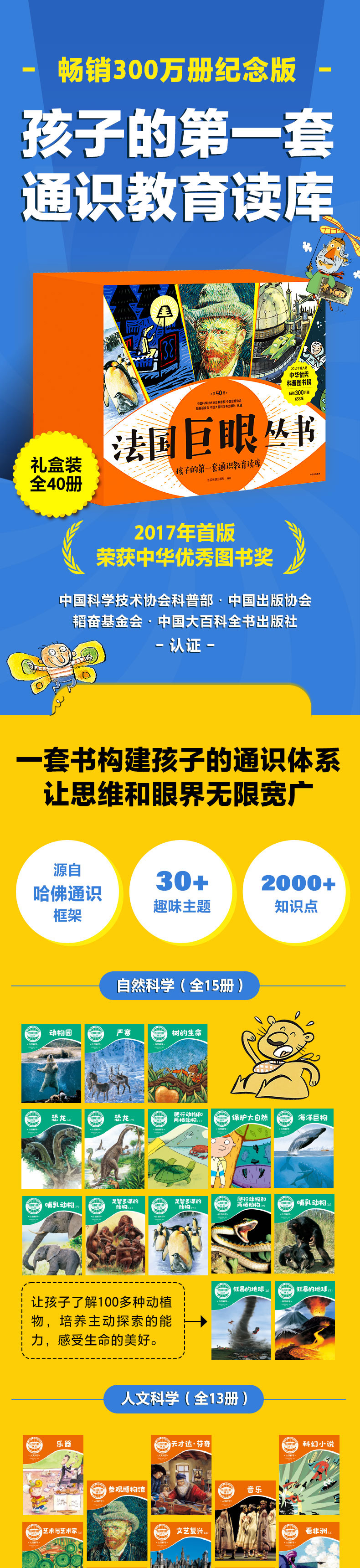 《法国巨眼丛书系列:孩子的第一套通识教育读库》(礼盒装全40册)下单赠送限量好礼: 赠品1 巨幅“知识拓展思维导图”3张 ,赠品2图文并茂《综合题库》。