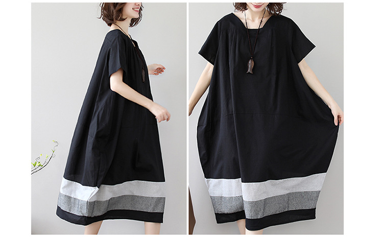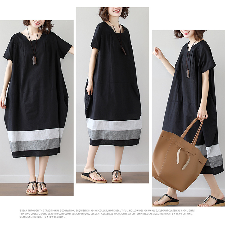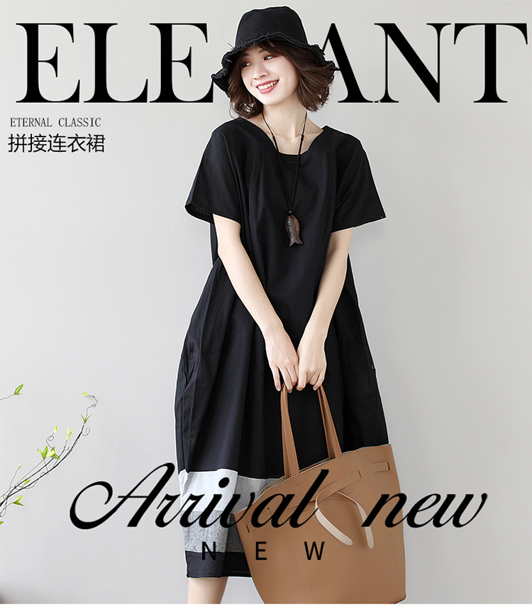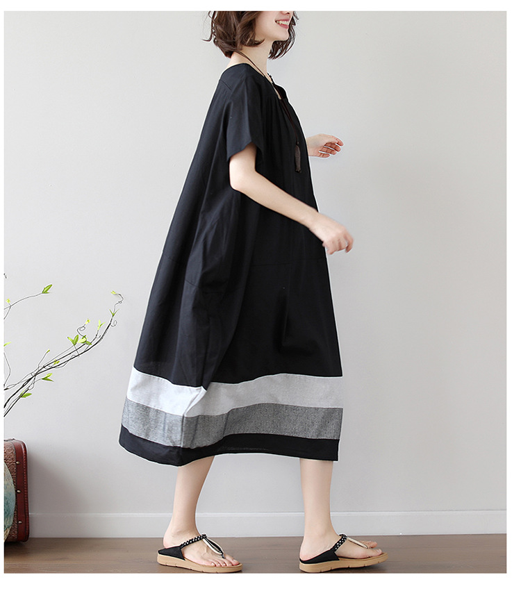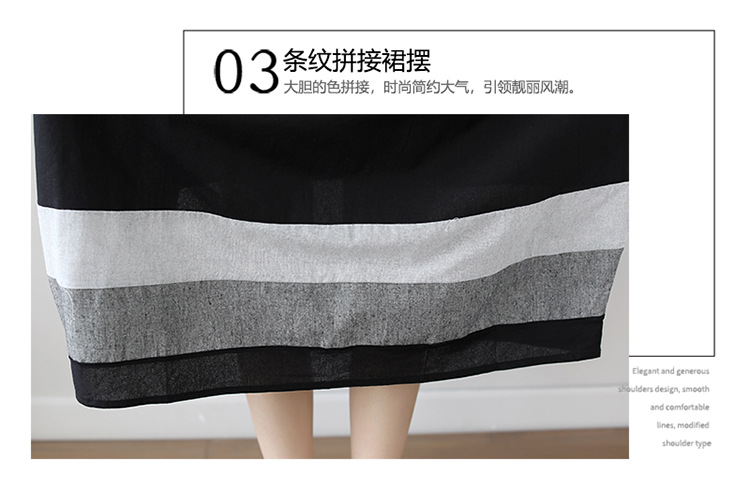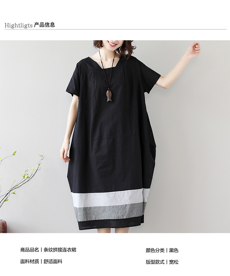 雀说新款韩版大码宽松拼接条纹棉麻短袖连衣裙女装中长款AL997