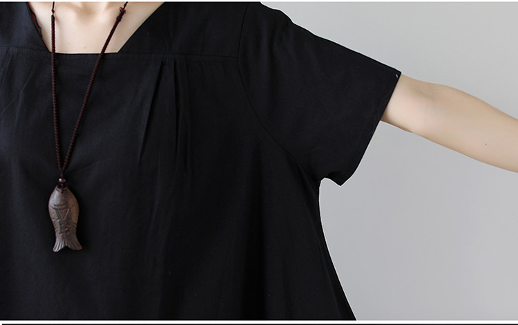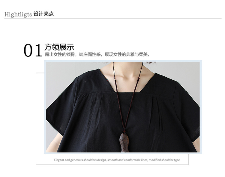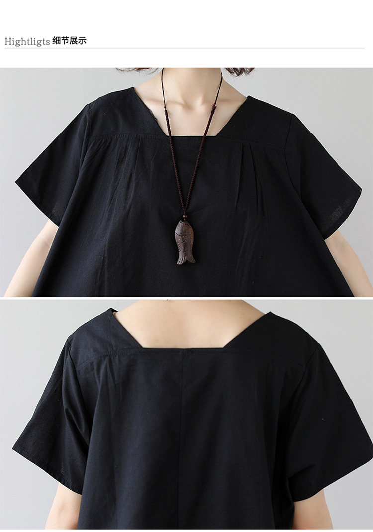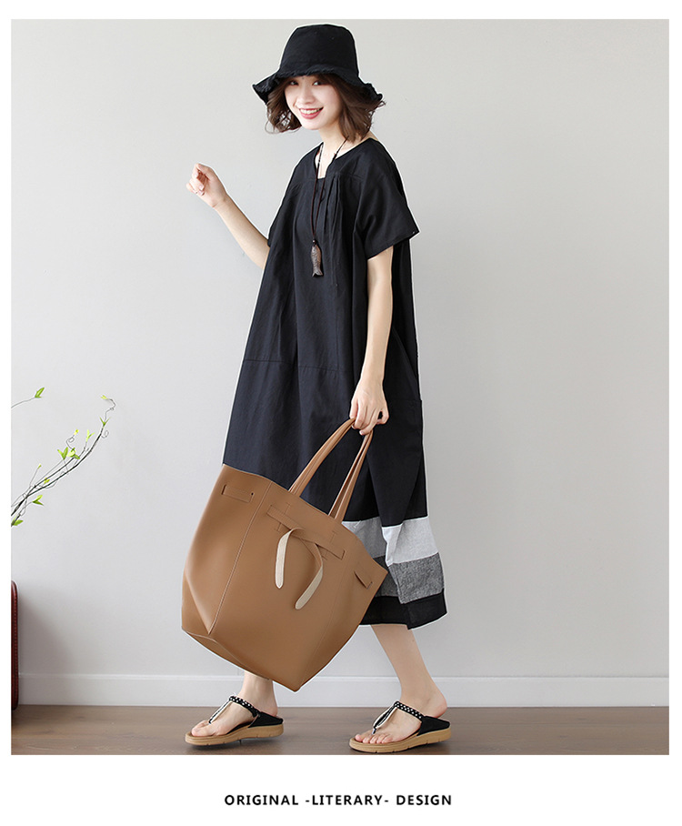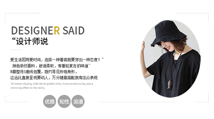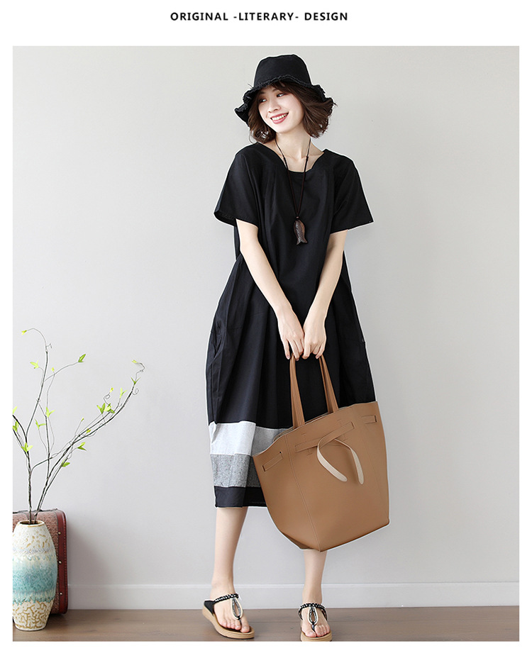 雀说新款韩版大码宽松拼接条纹棉麻短袖连衣裙女装中长款AL997