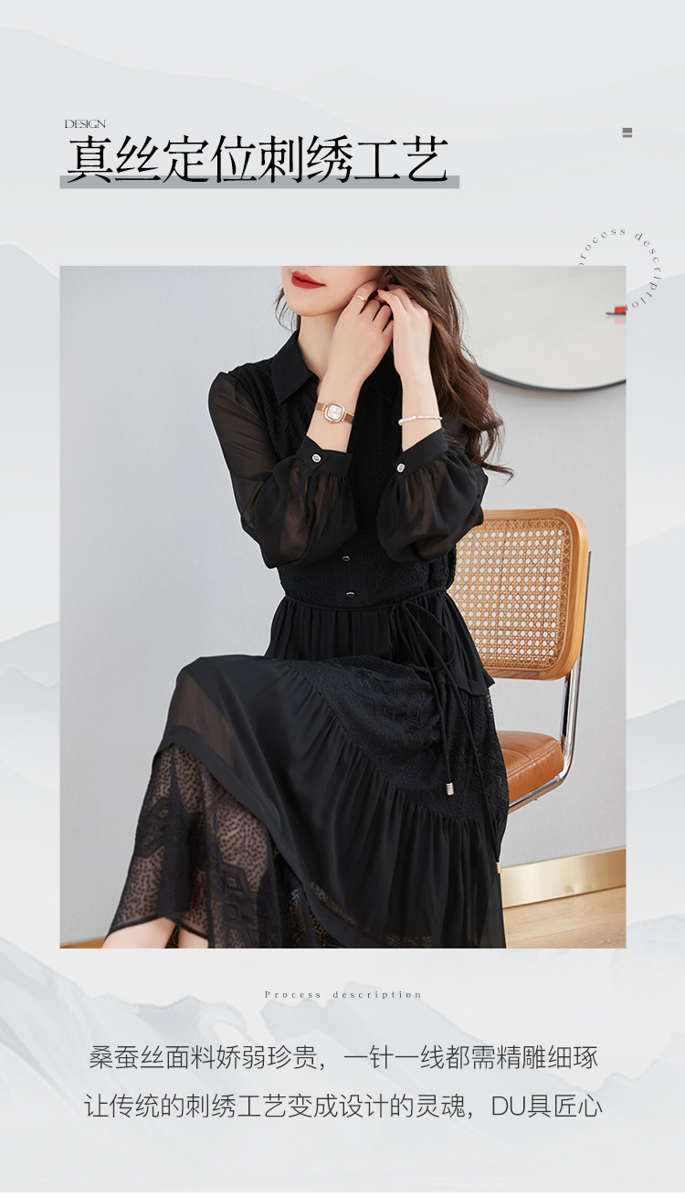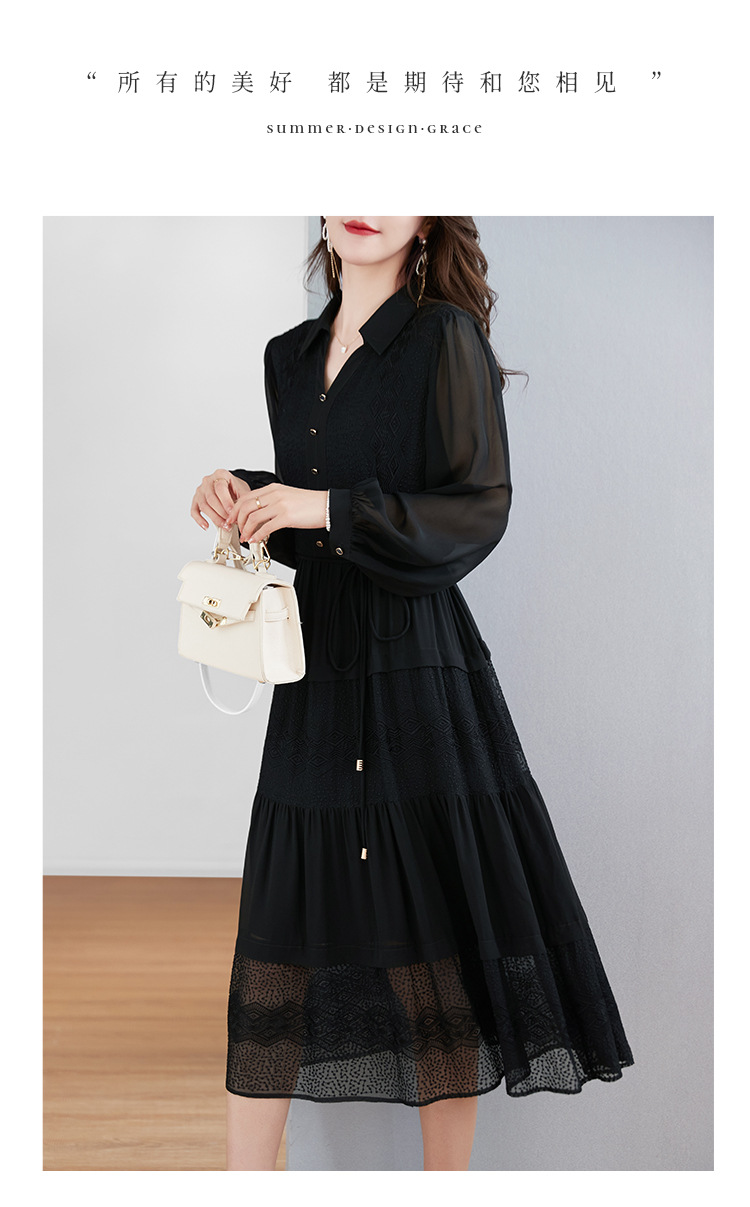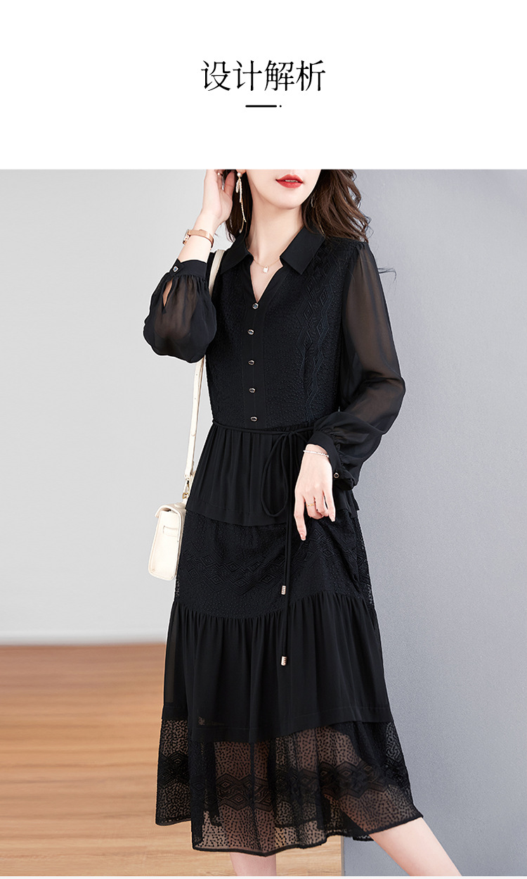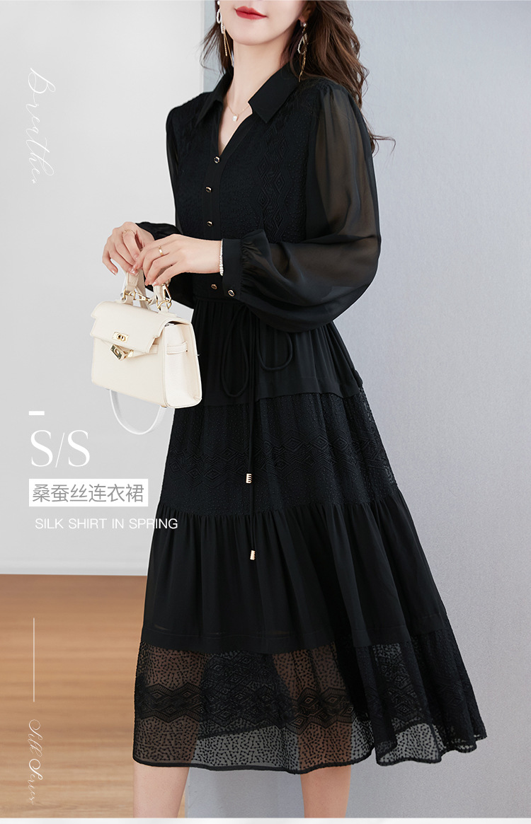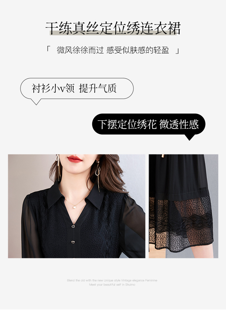 QS-82399677真丝桑蚕丝连衣裙女新款夏装气质衬衫式Polo领长袖小黑裙