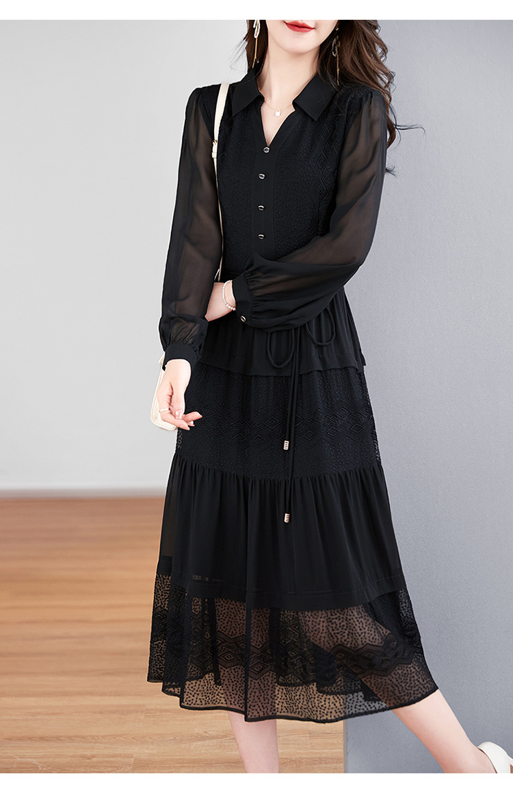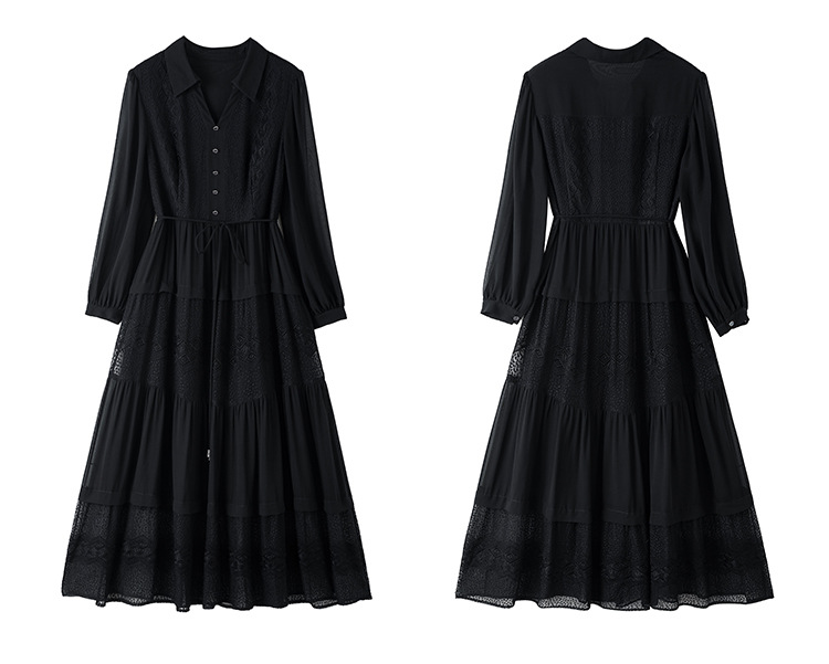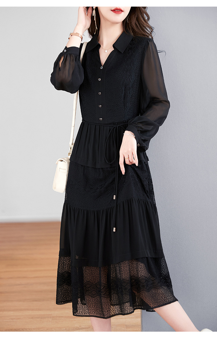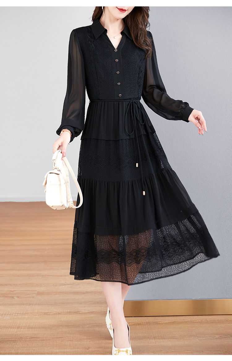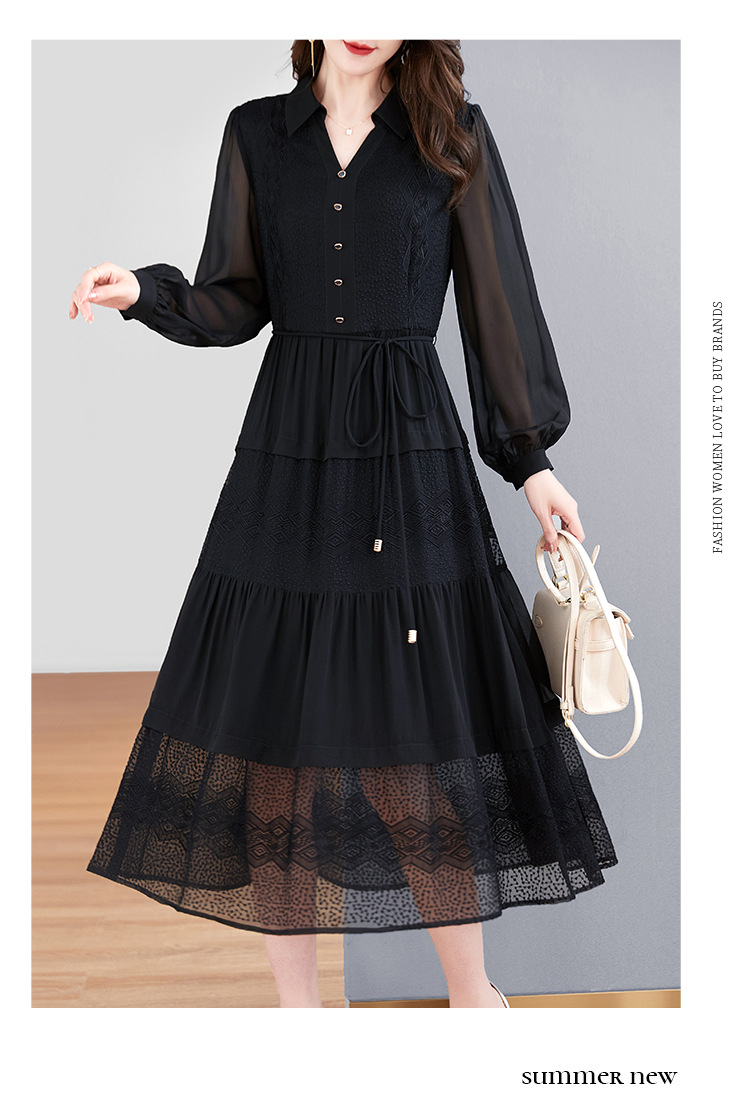 QS-82399677真丝桑蚕丝连衣裙女新款夏装气质衬衫式Polo领长袖小黑裙