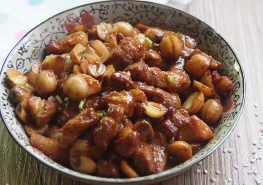 五花肉切小块,焯水后沥干待用。炒锅里油热后下冰糖,用小火炒至糖成琥珀色。下五花肉块,翻炒,让每一块五花肉沾满糖浆,表面成琥珀色。