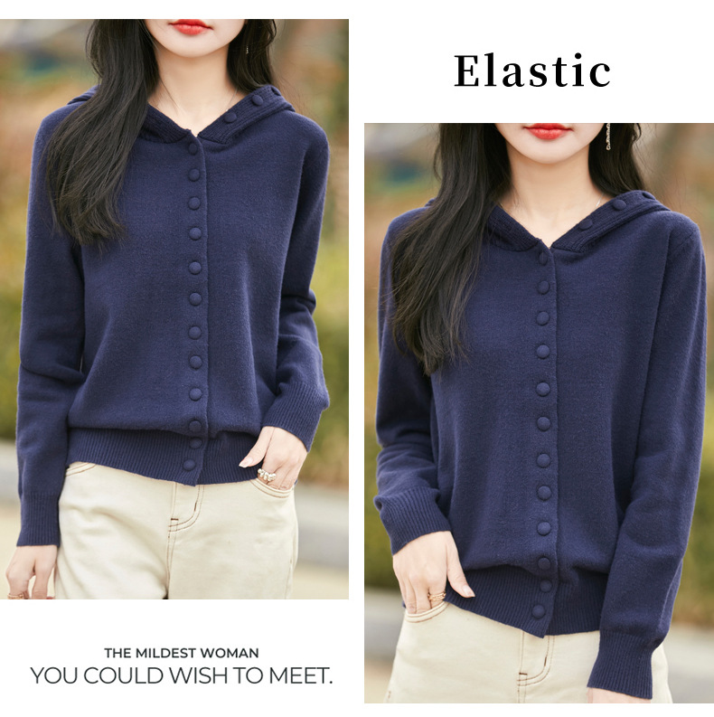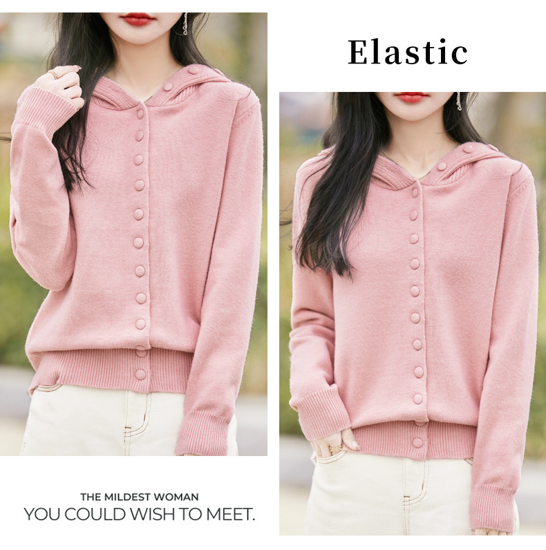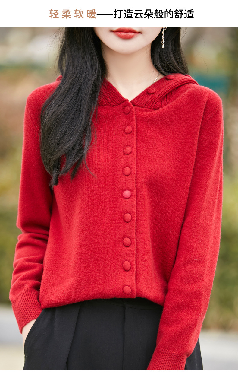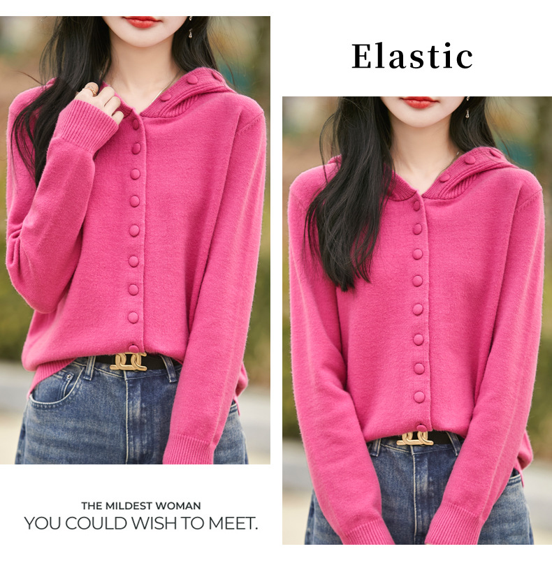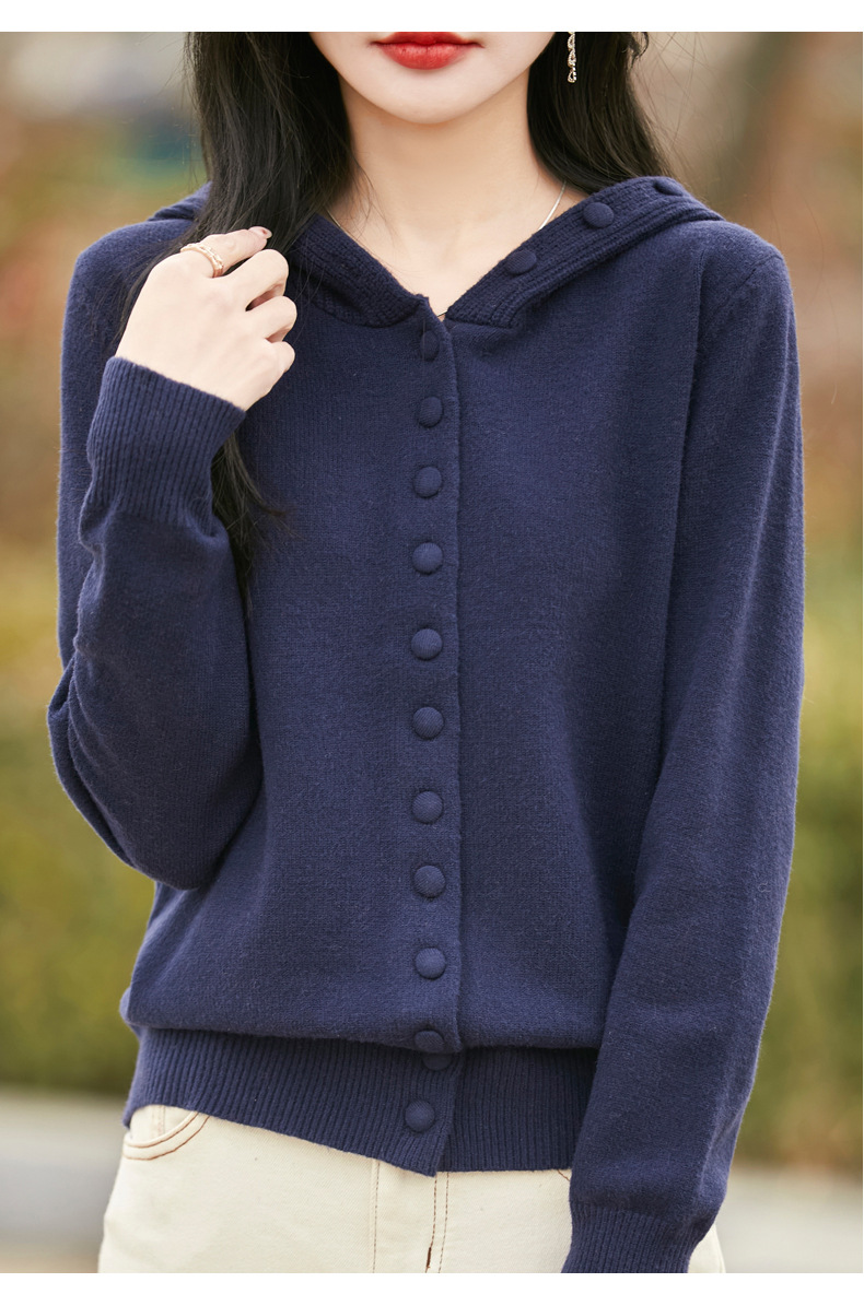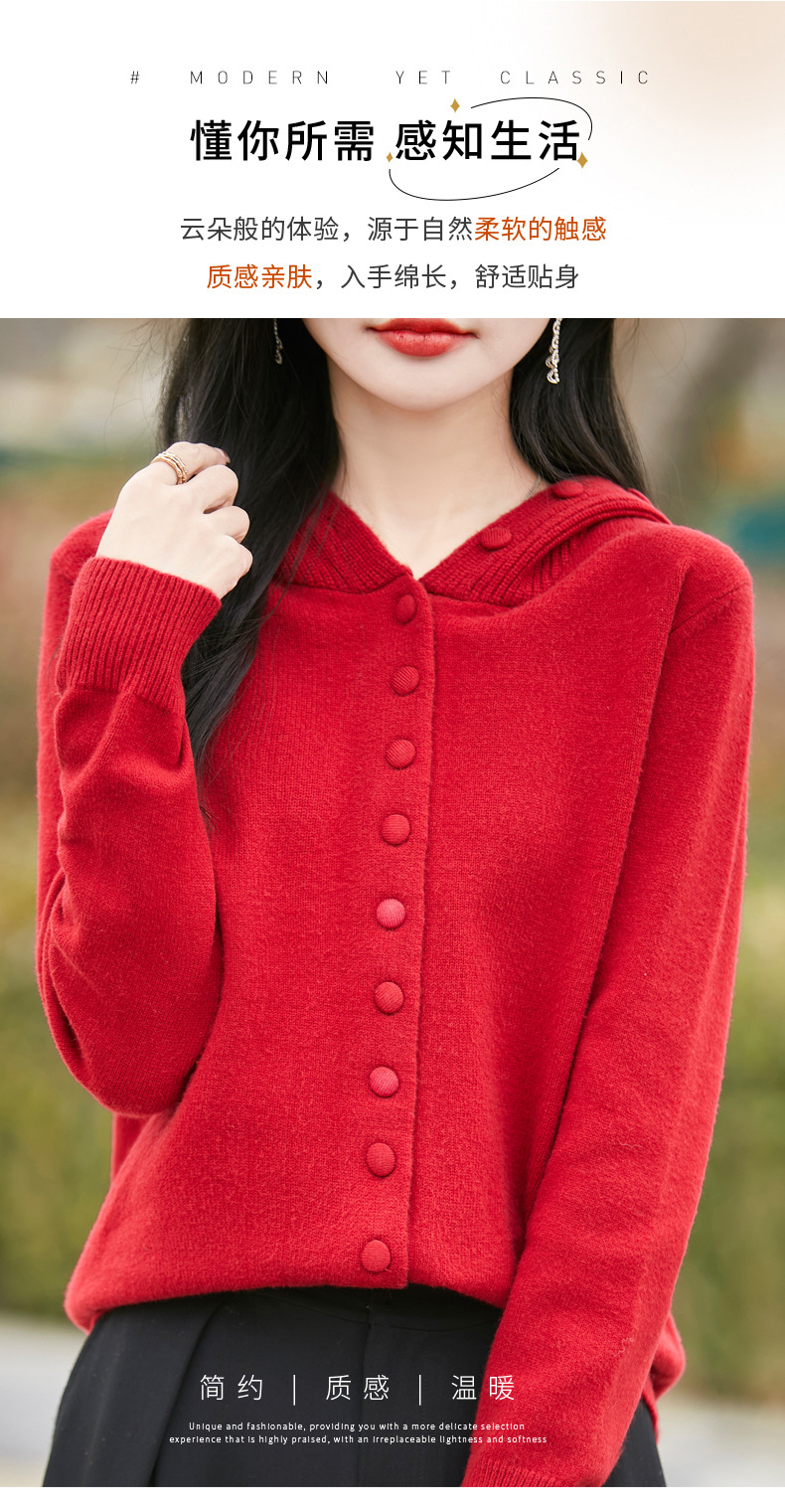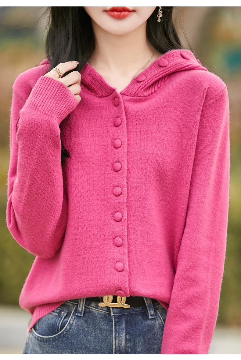 QHJY-JY8208亲肤绒单排扣毛衣外套女七针加厚休闲连帽针织开衫2025年新款上衣