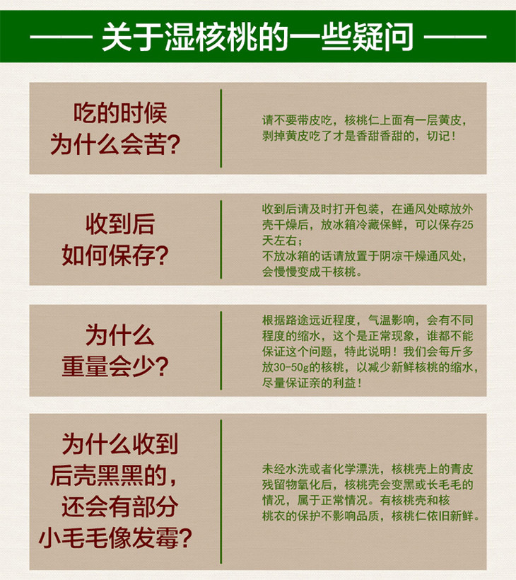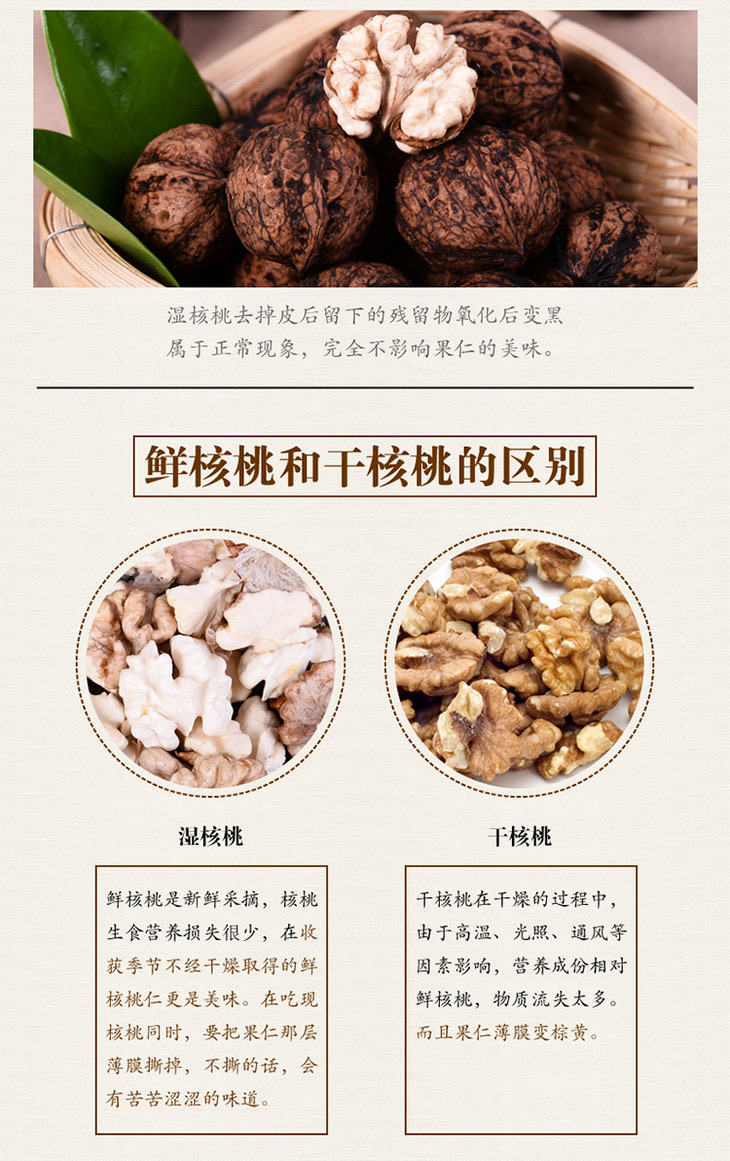 新鲜核桃已接近尾季,会出现果皮因果仁上油导致发黑的情况,可正常使用。这是核桃的生长周期不可避免的情况,不支持退货或者退款哟。