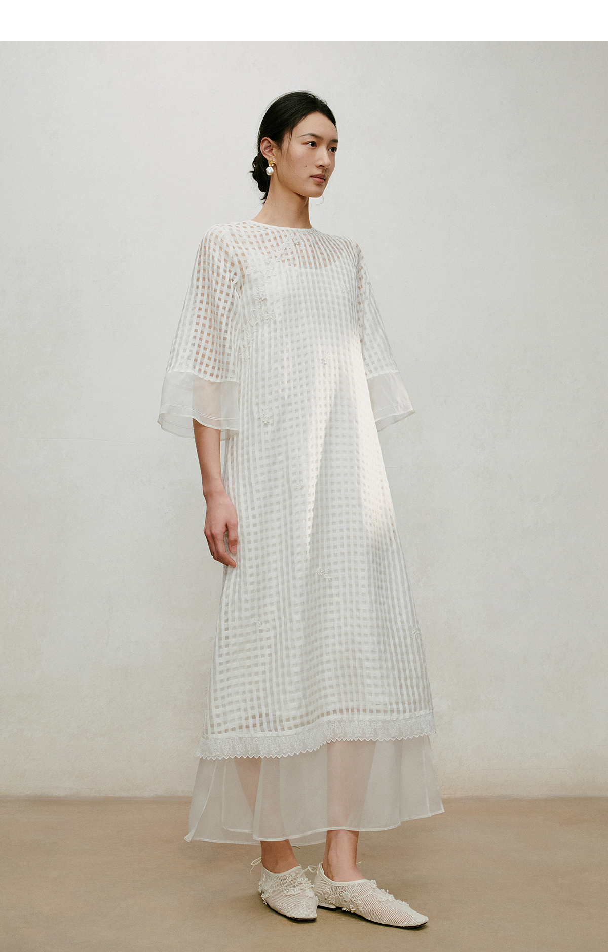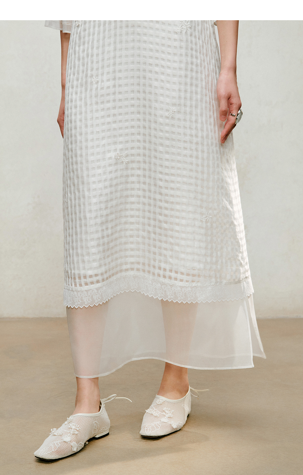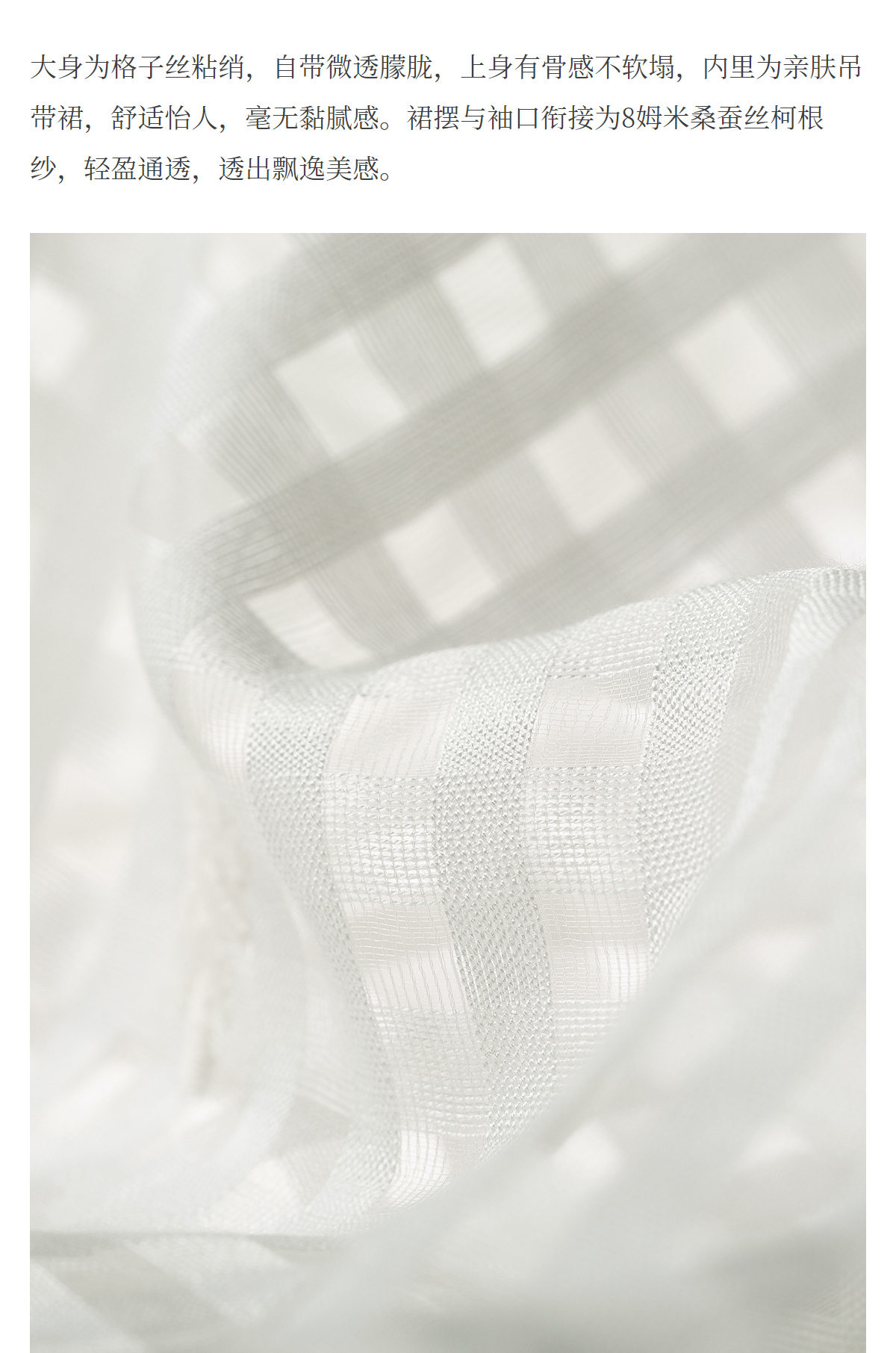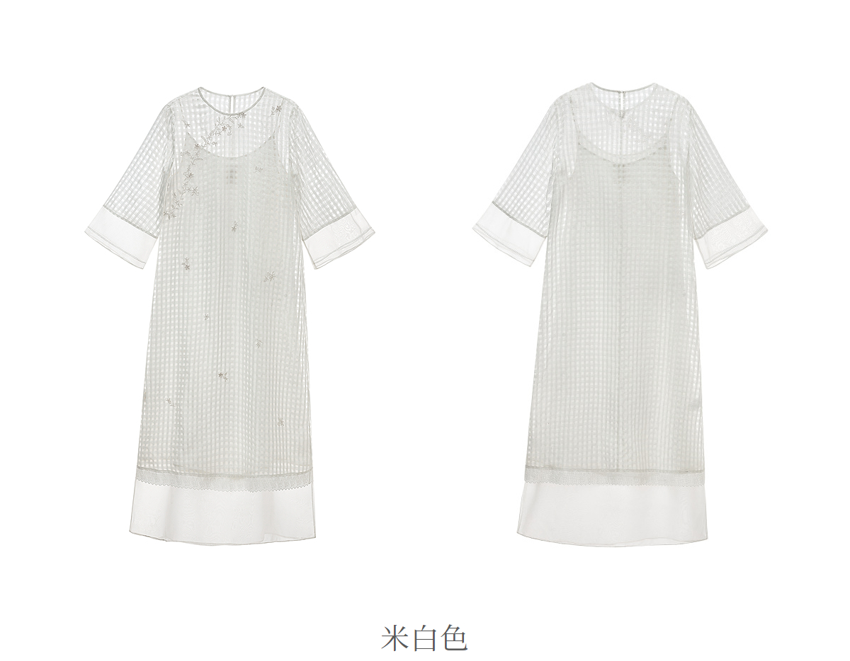 【林栖设计小店】手工钉花|米白格纹绣花优雅百搭2026夏新款连衣裙两件套1962193