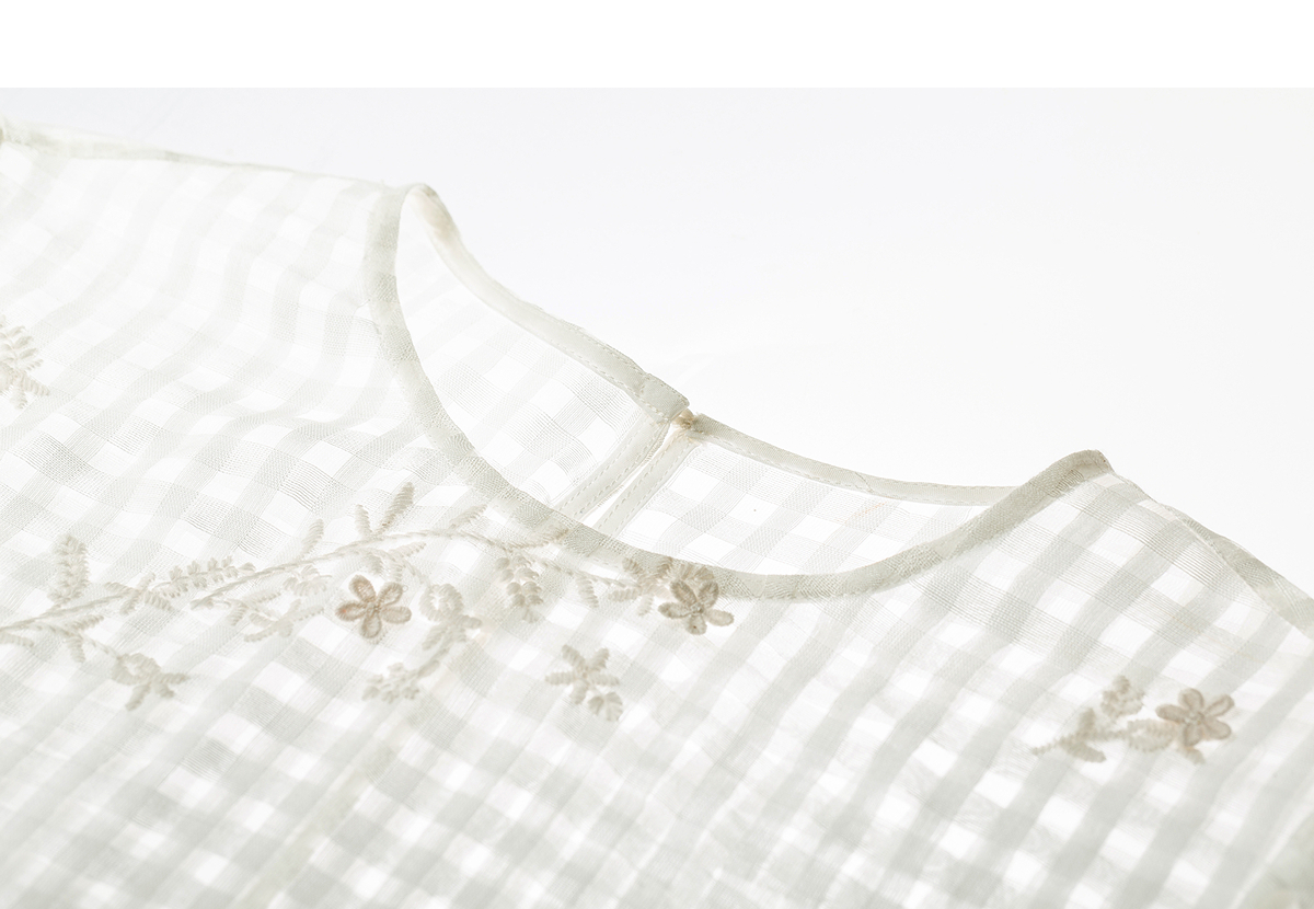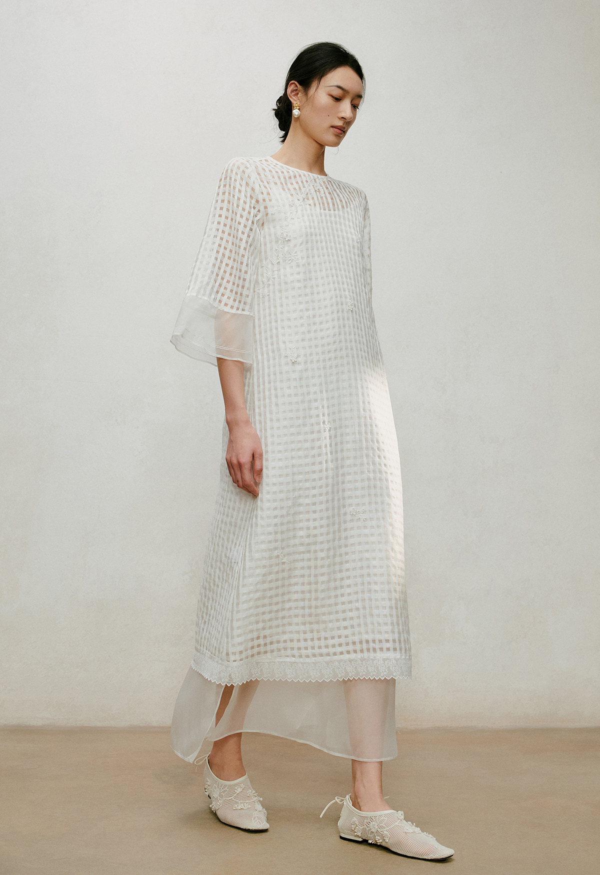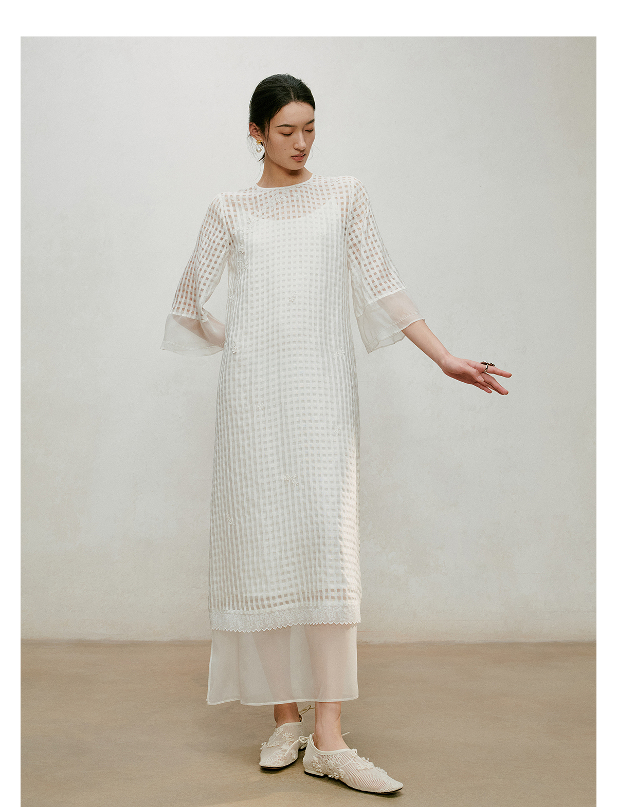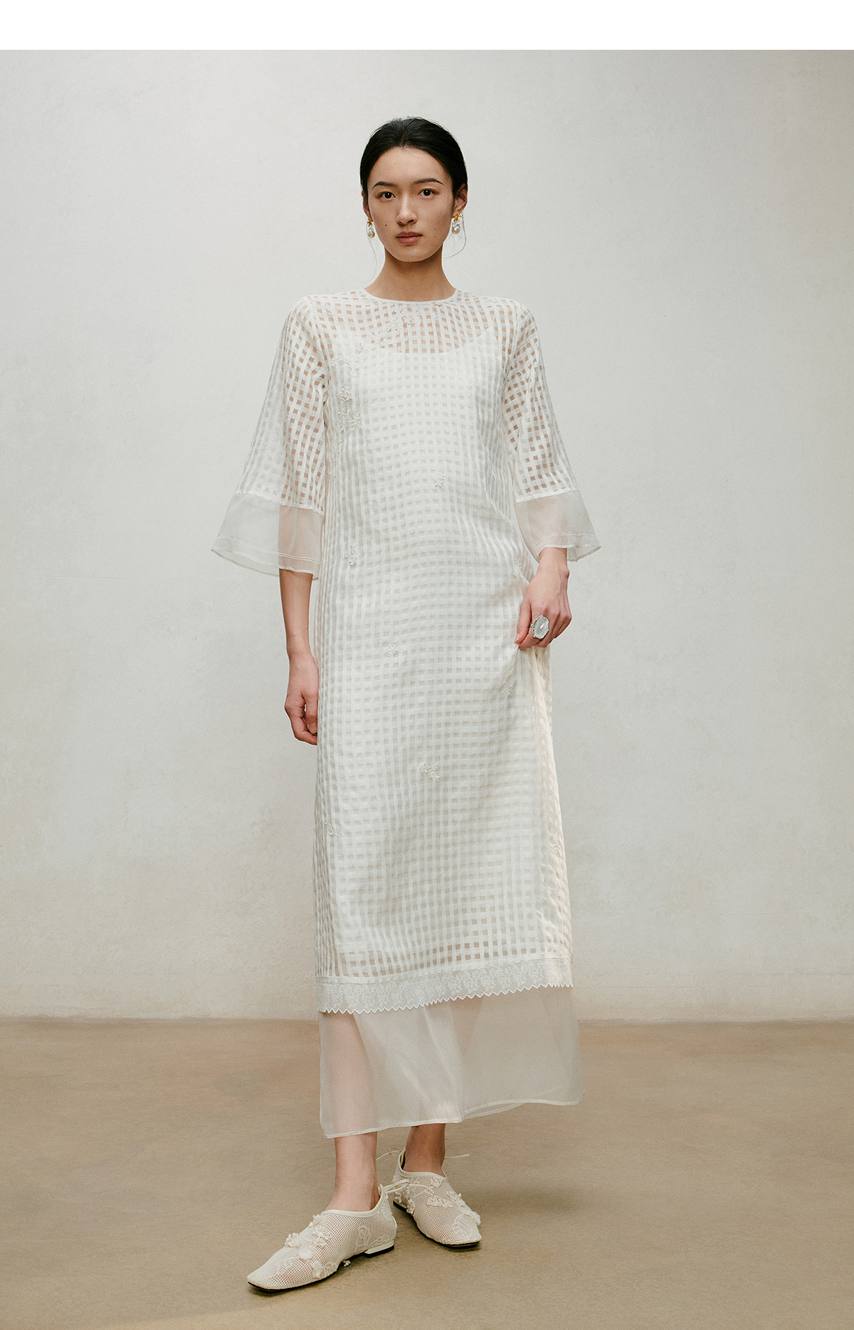 【林栖设计小店】手工钉花|米白格纹绣花优雅百搭2026夏新款连衣裙两件套1962193