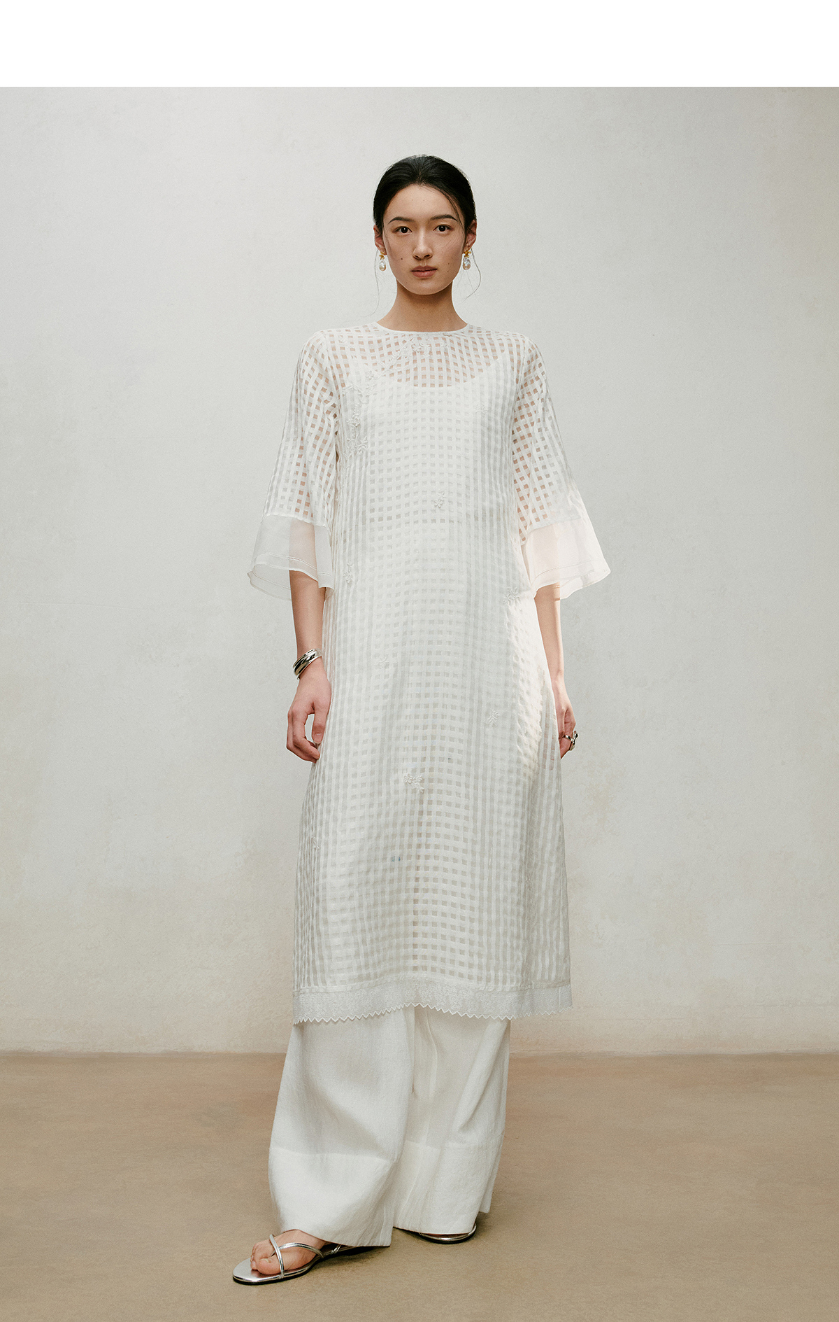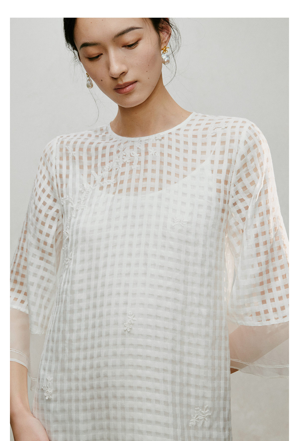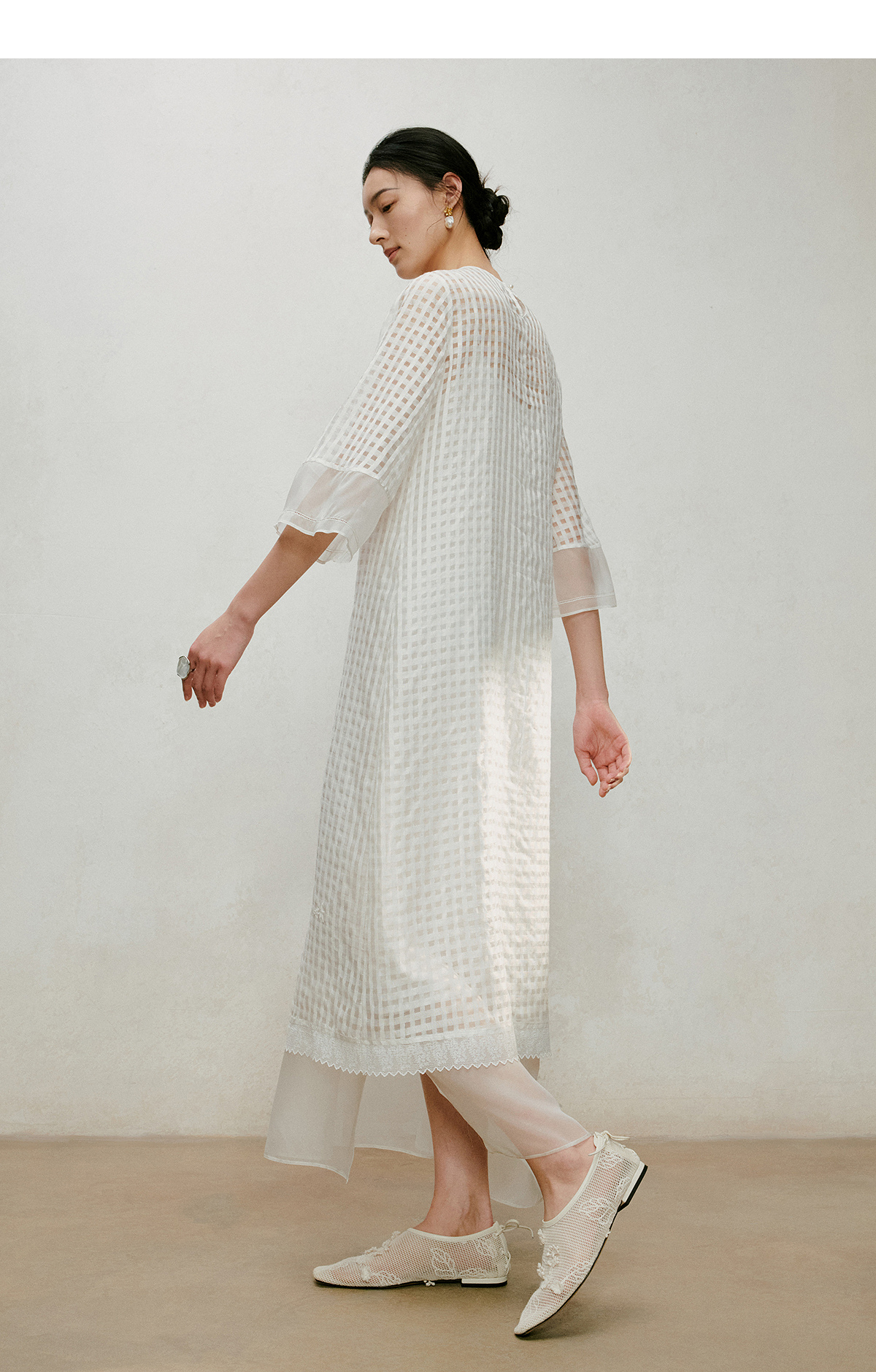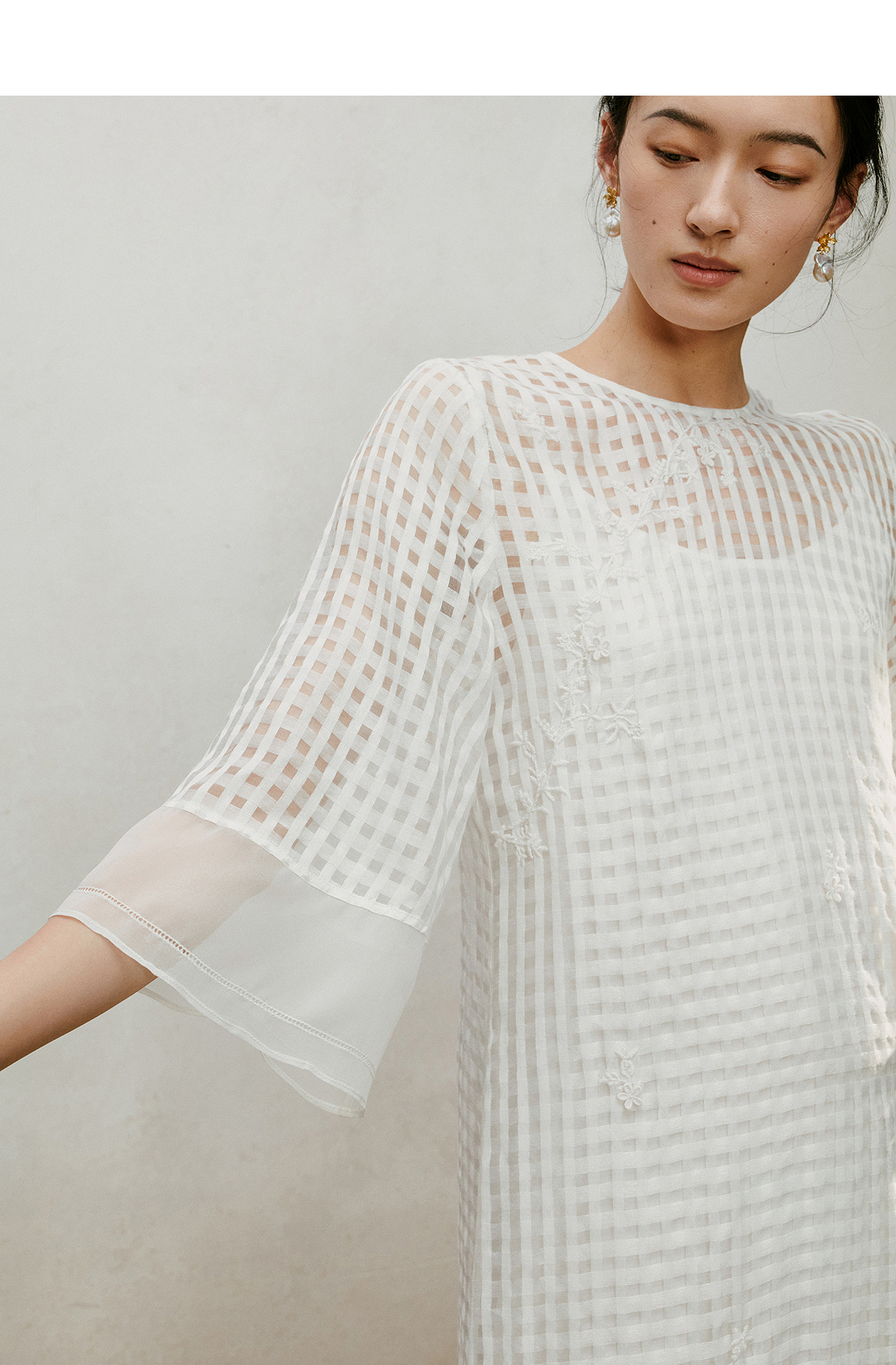 【林栖设计小店】手工钉花|米白格纹绣花优雅百搭2026夏新款连衣裙两件套1962193
