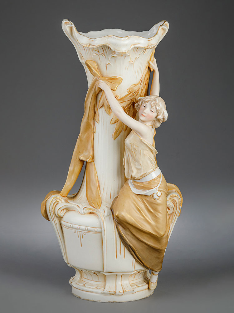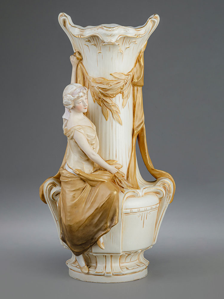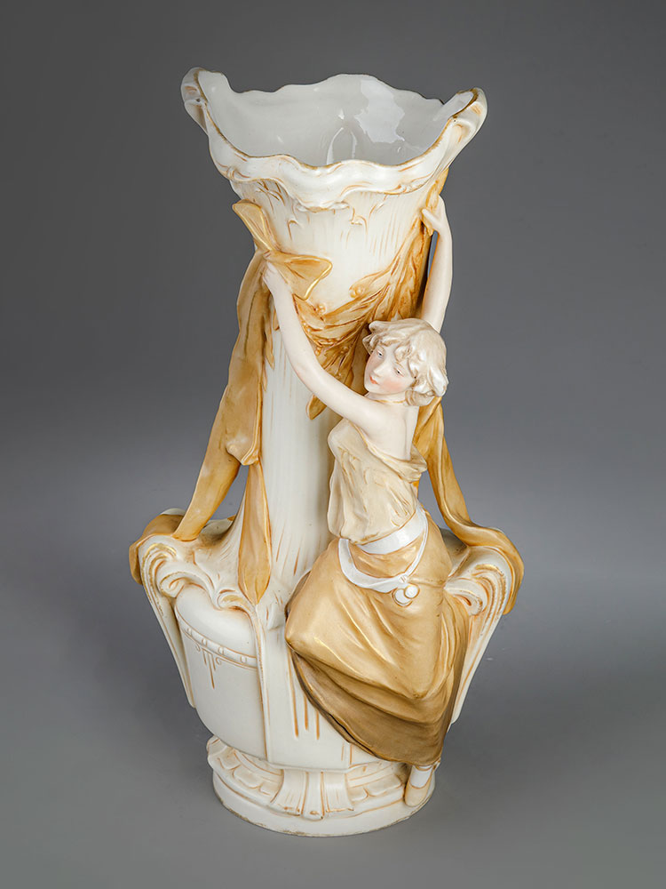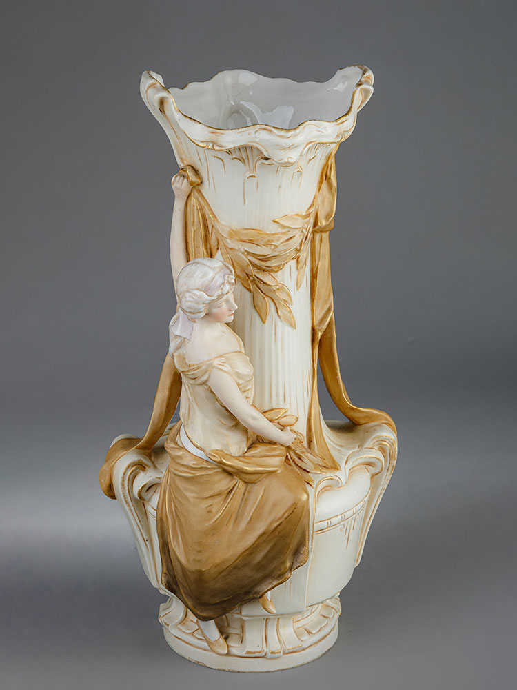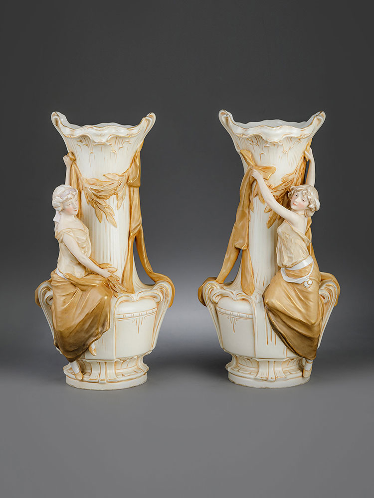 20世纪早期捷克Royal Dux瓷窑出品新艺术风格少女花卉主题陶瓷花瓶一对