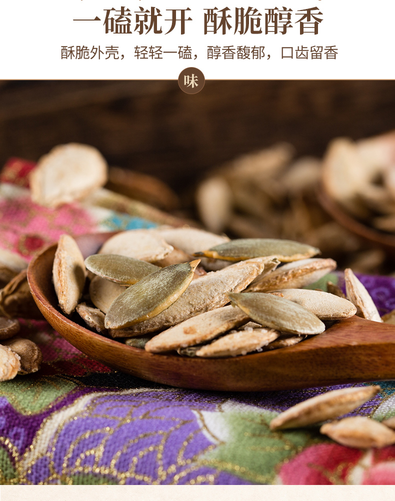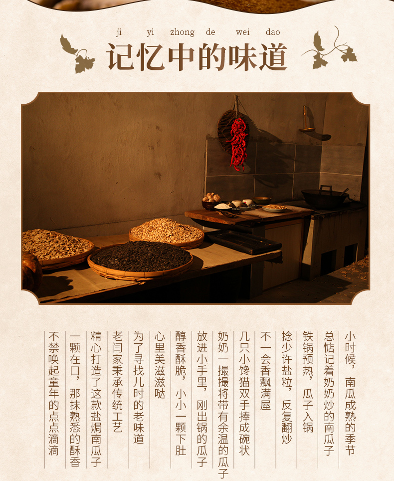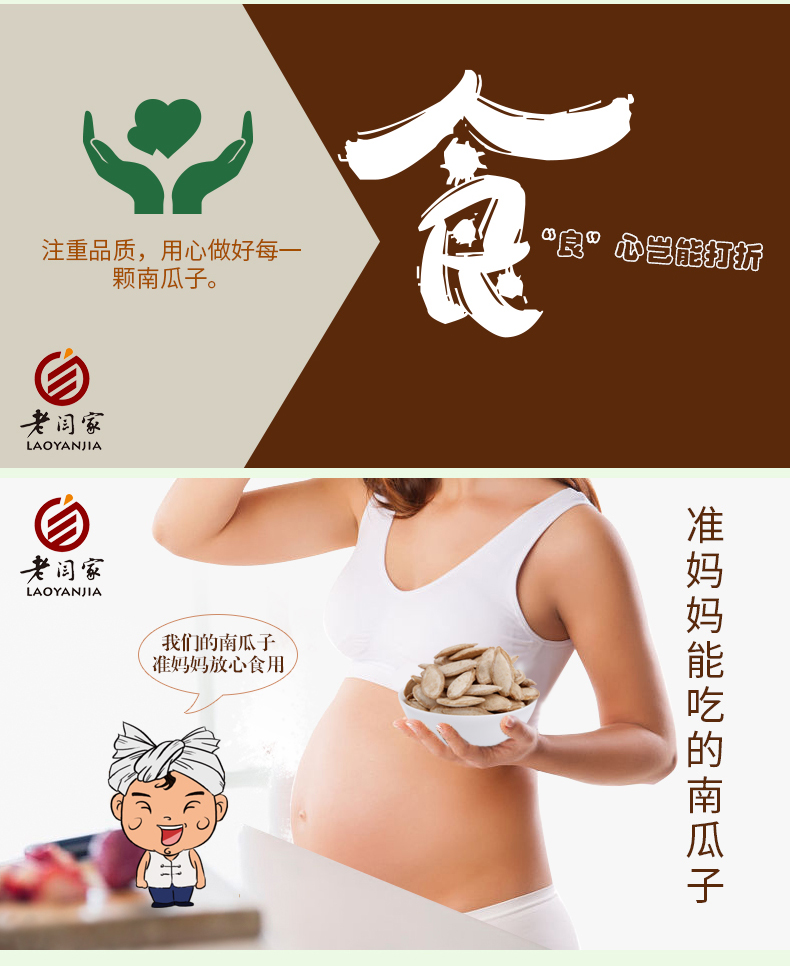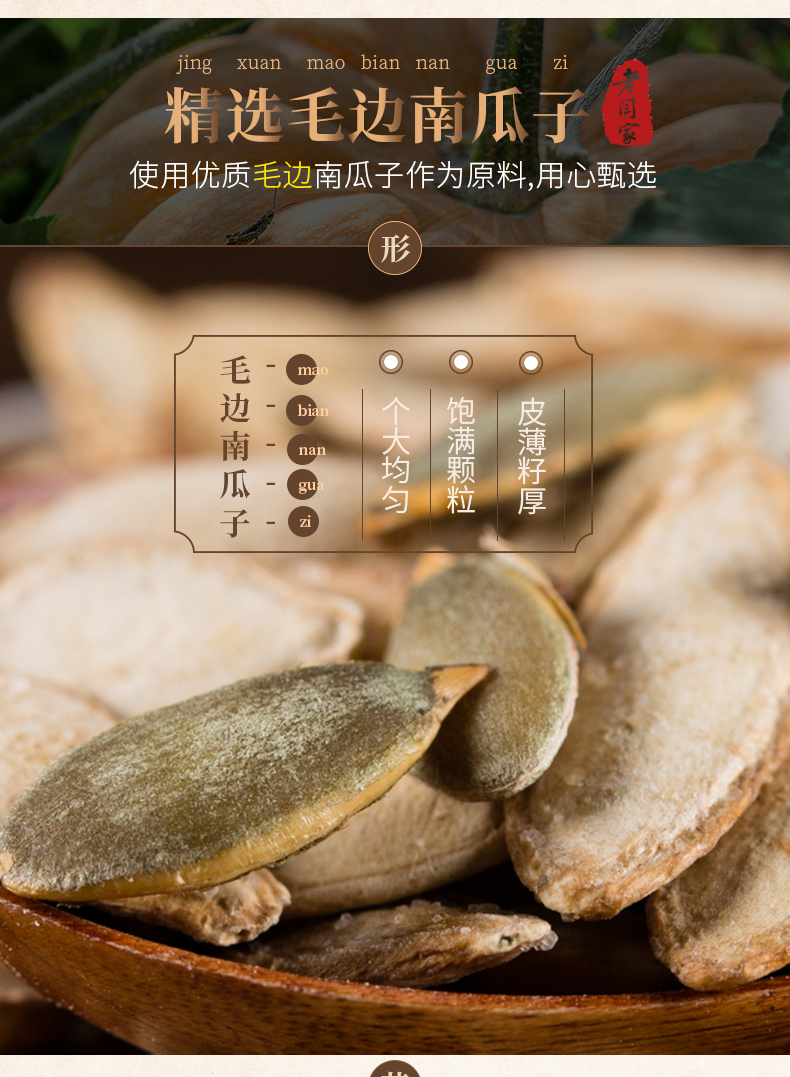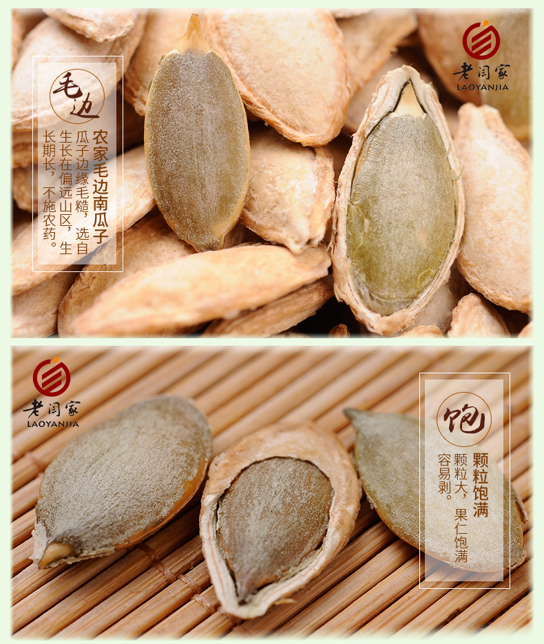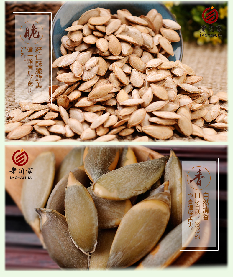 老闫家南瓜子三代人用心坚守每一颗南瓜子执行同一个标准,严选产区,15道工序,坚持古法炒制10次,层层质检严控,只为每一颗好南瓜子。