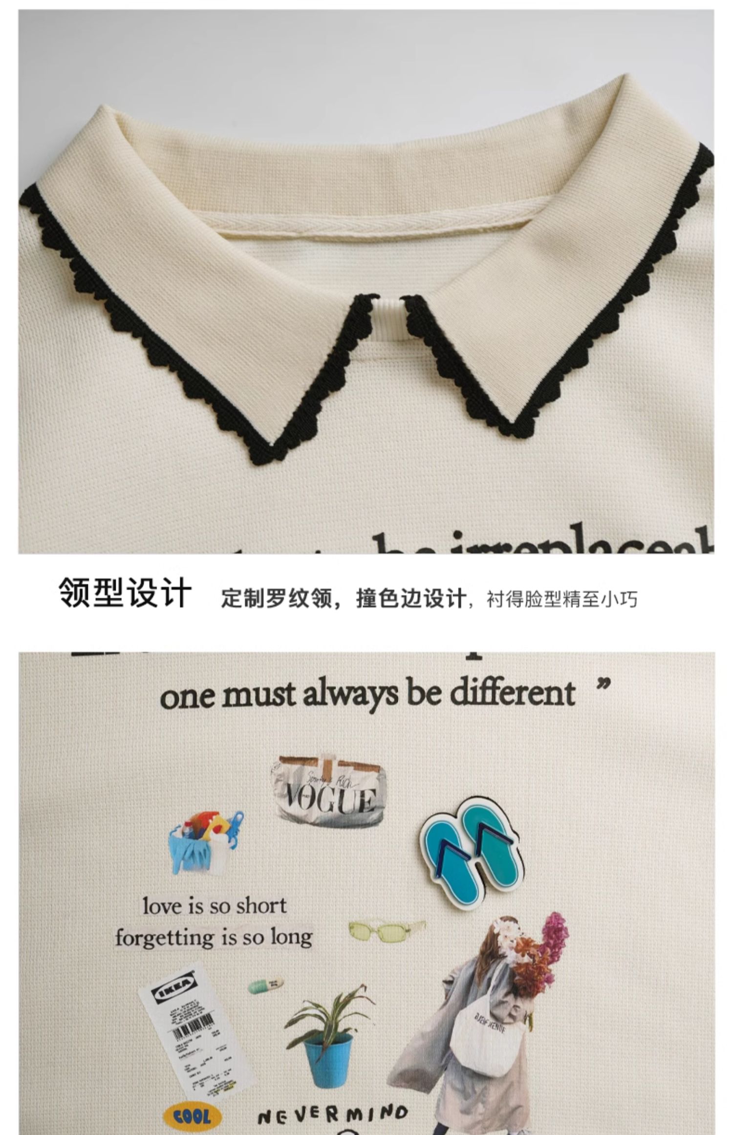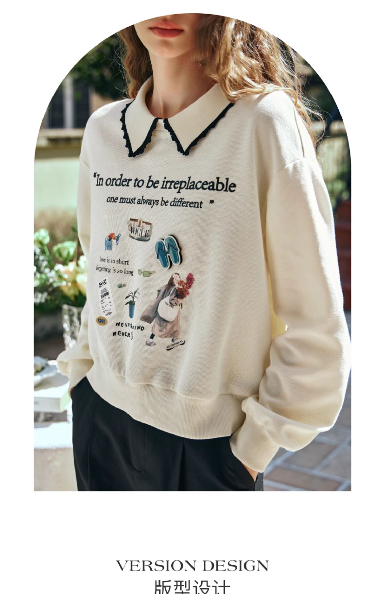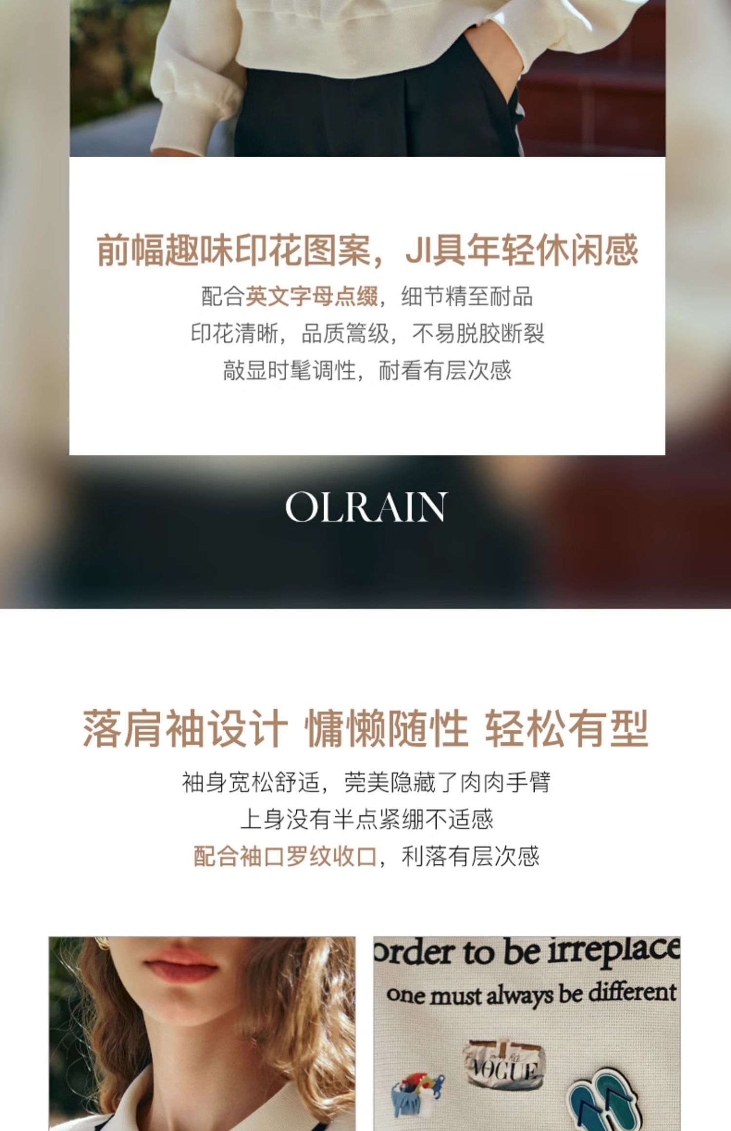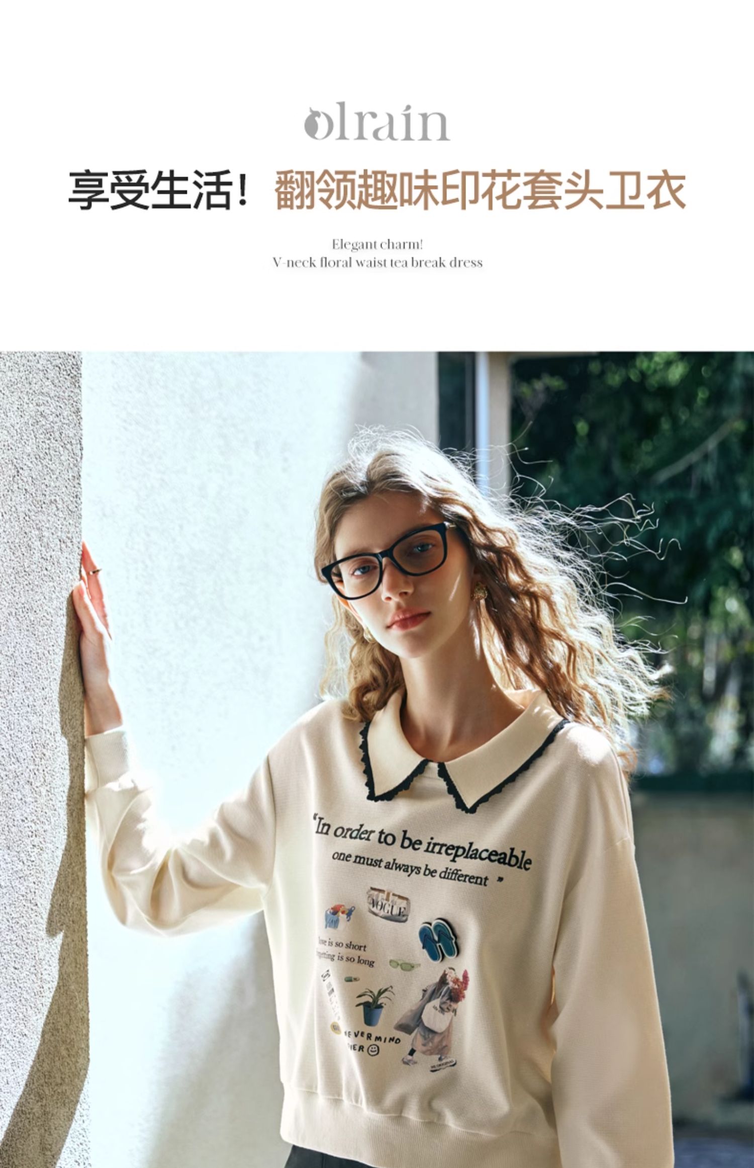 OLrain欧芮儿杏色短款卫衣女早春2024新款翻领趣味印花套头上衣