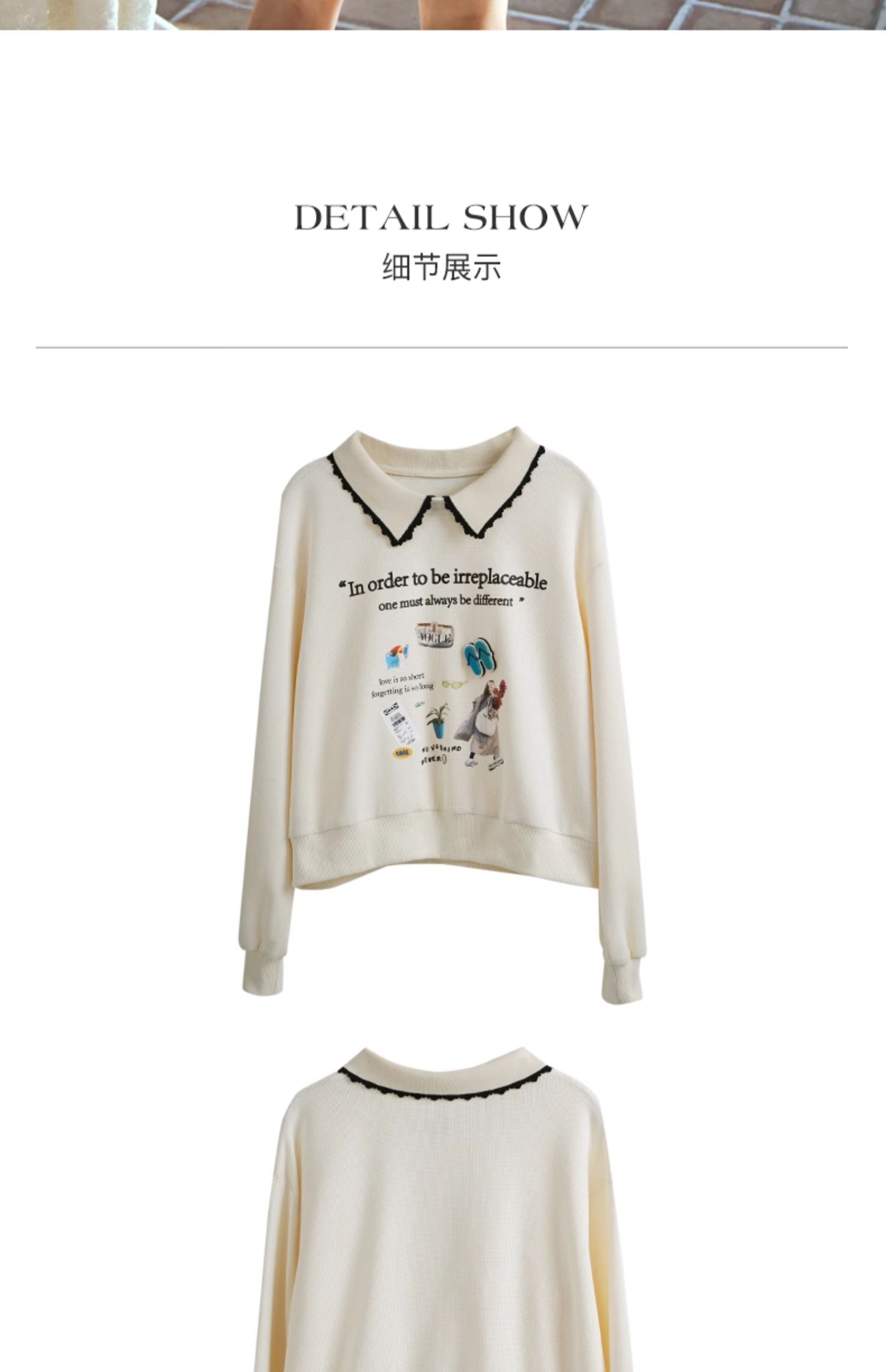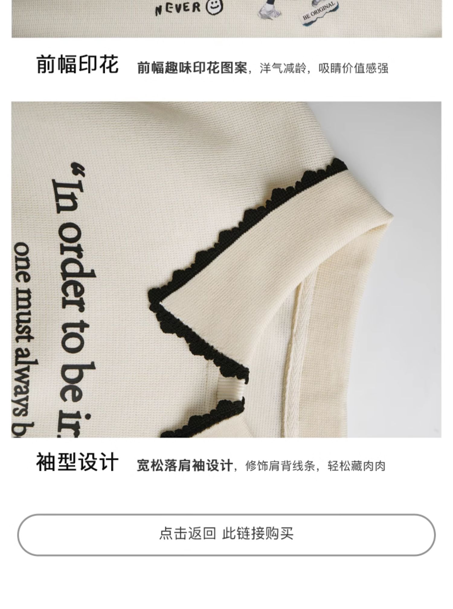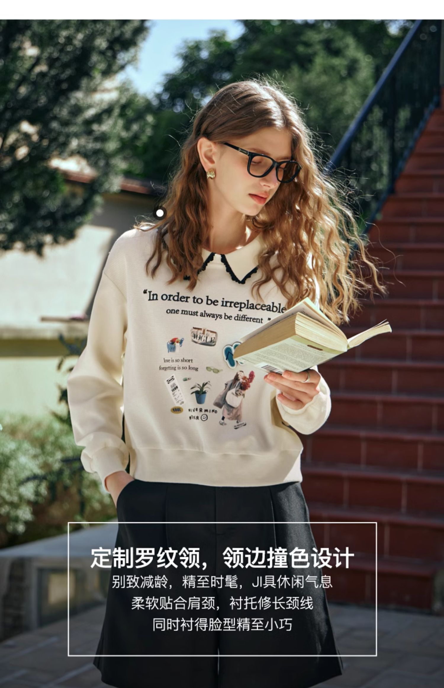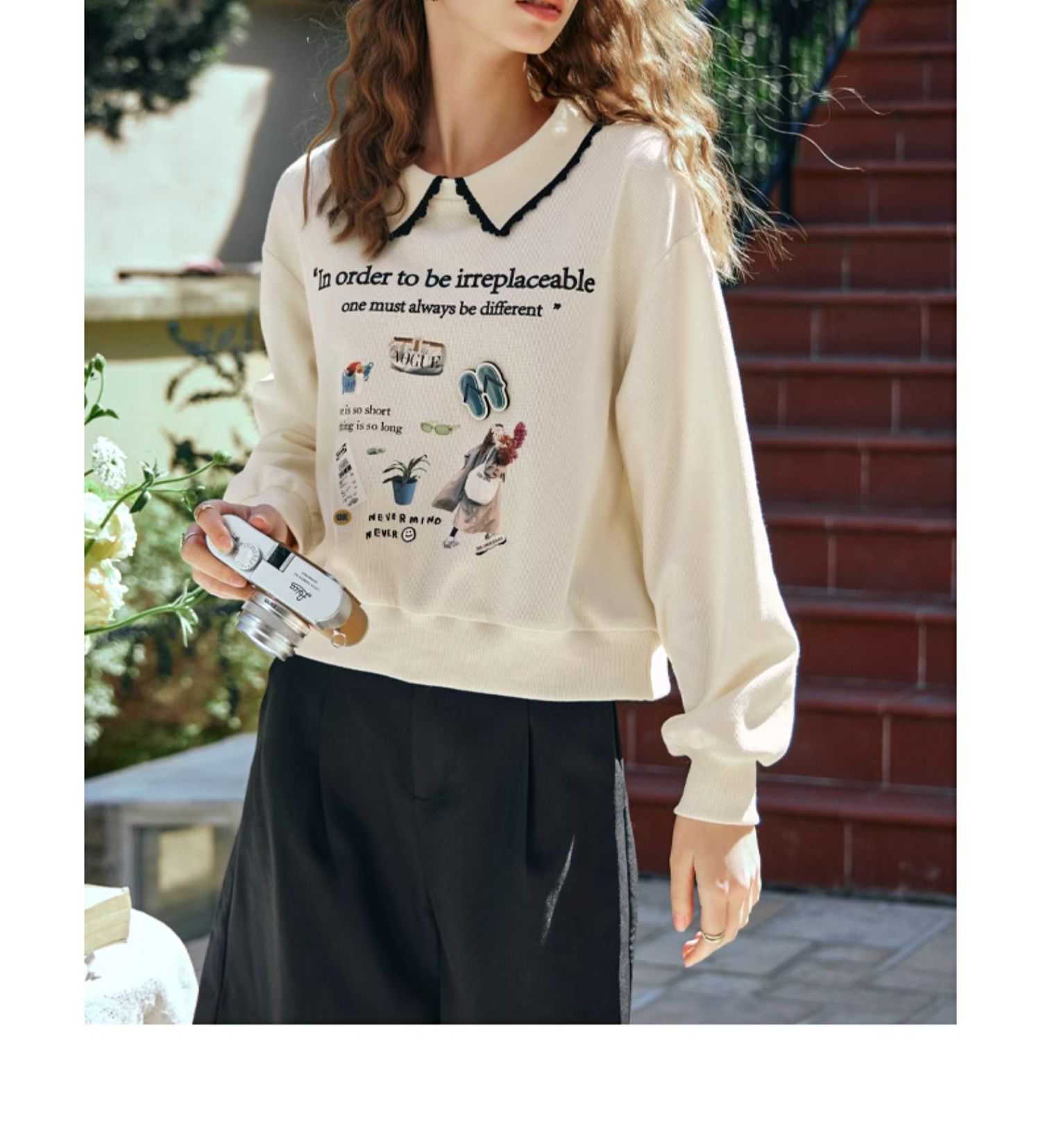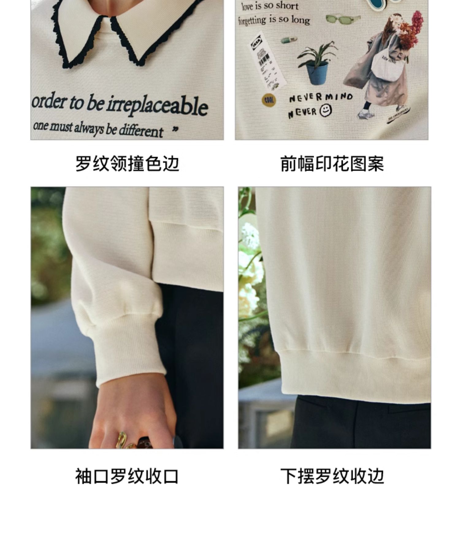 OLrain欧芮儿杏色短款卫衣女早春2024新款翻领趣味印花套头上衣
