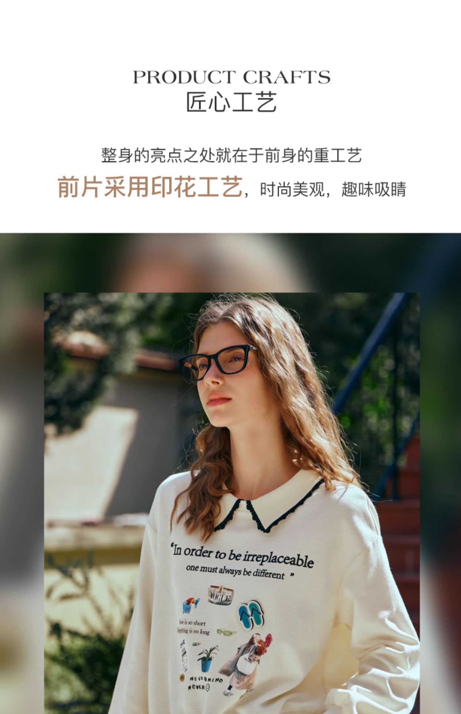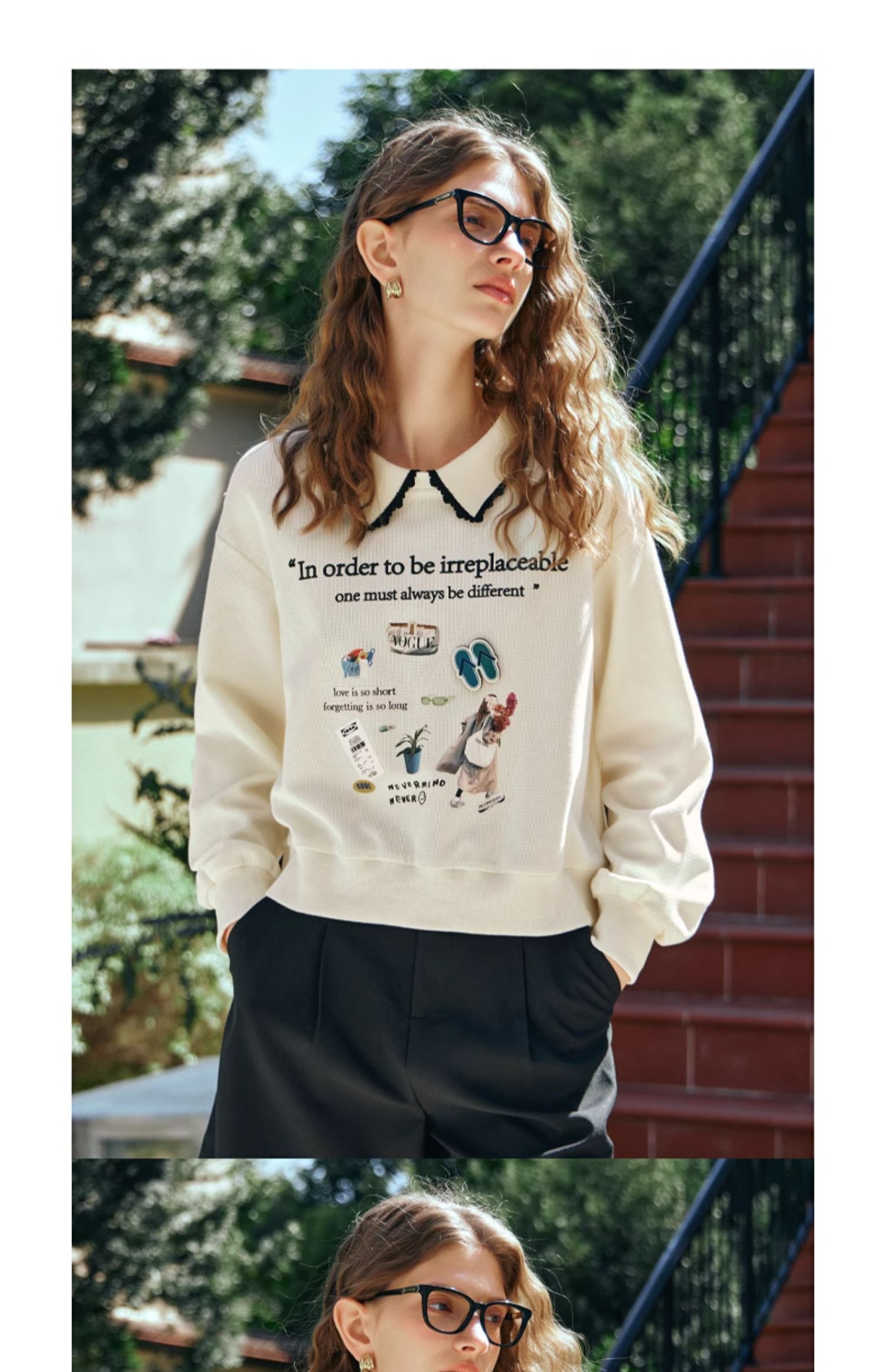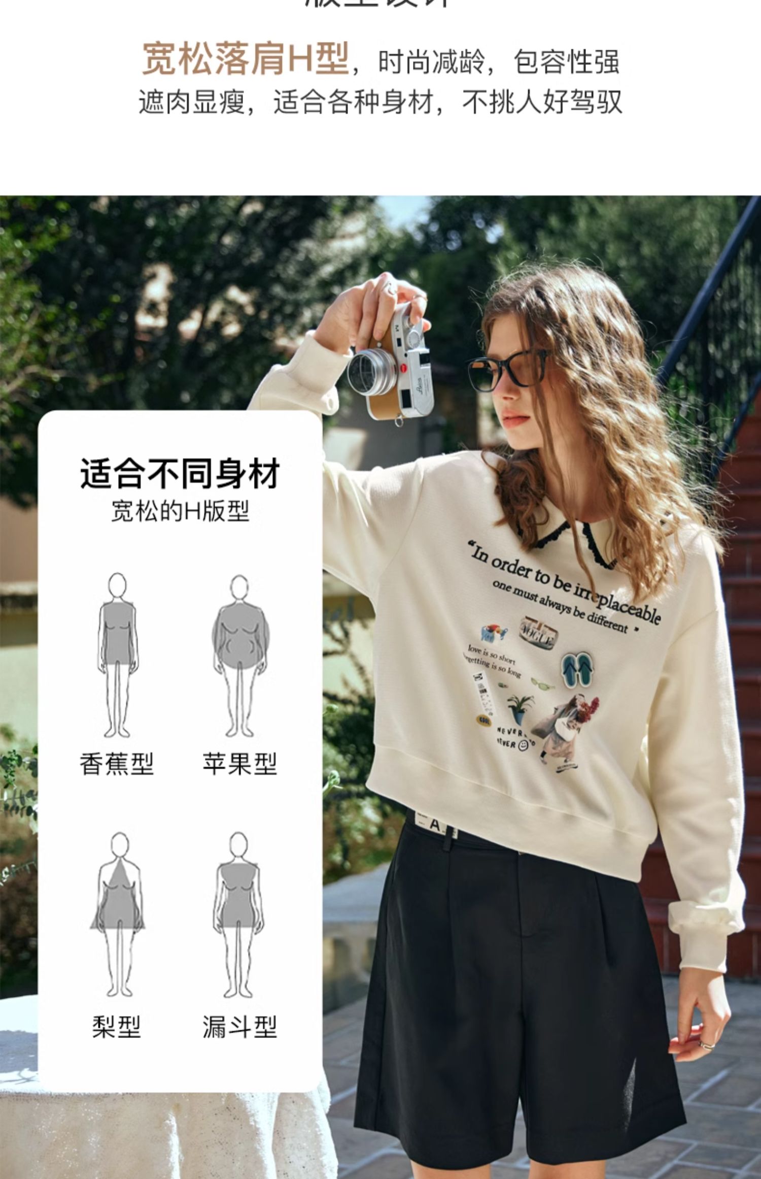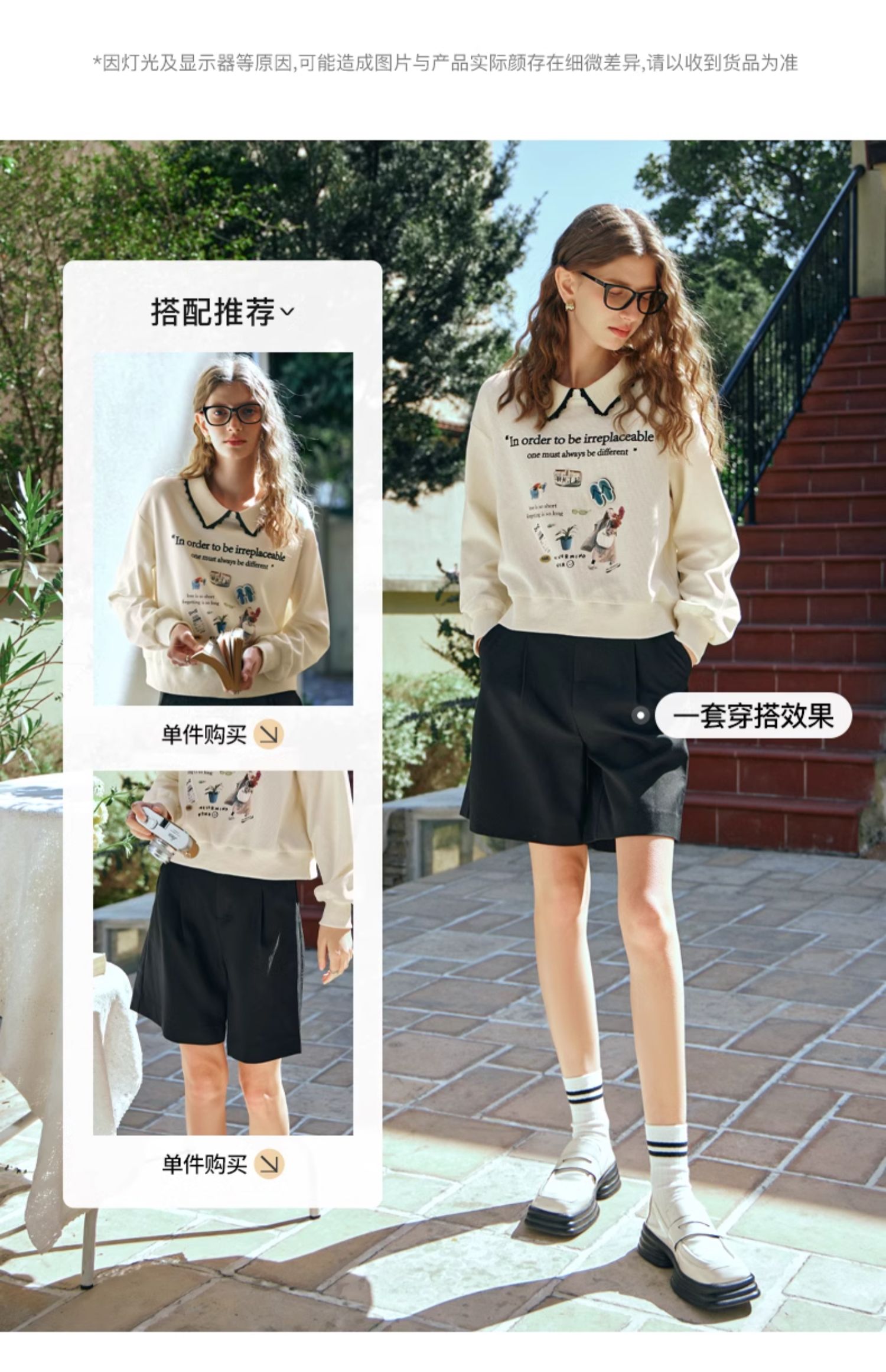 OLrain欧芮儿杏色短款卫衣女早春2024新款翻领趣味印花套头上衣
