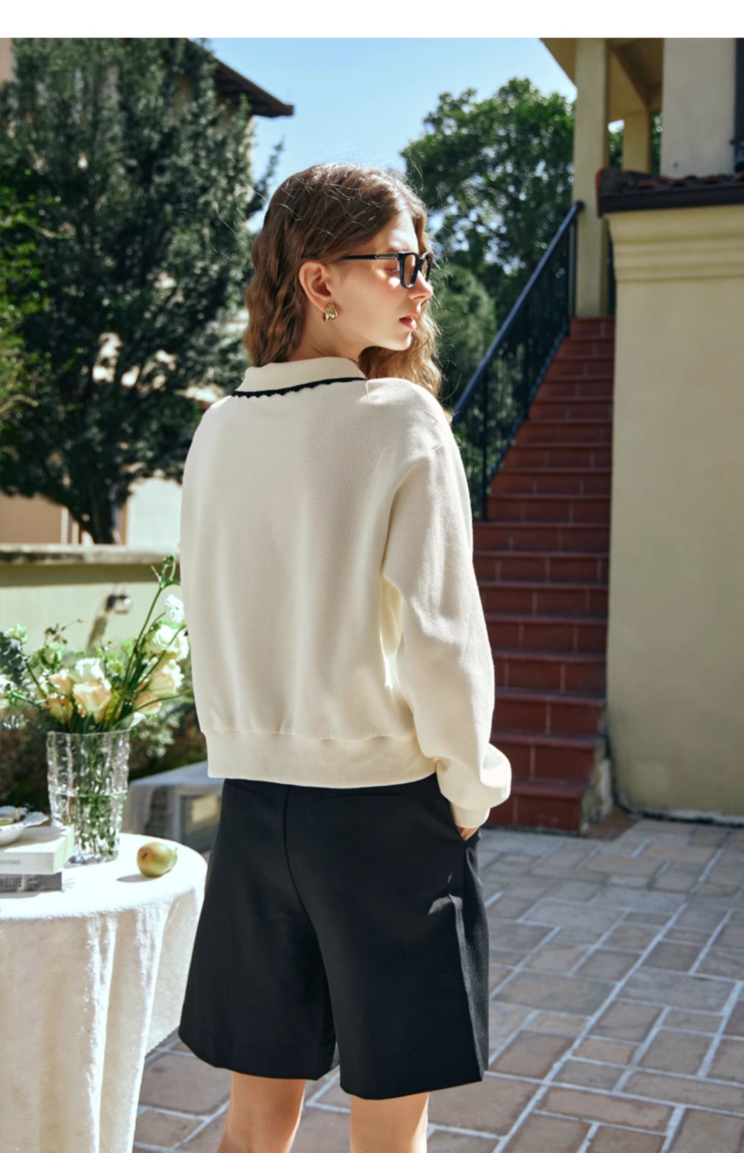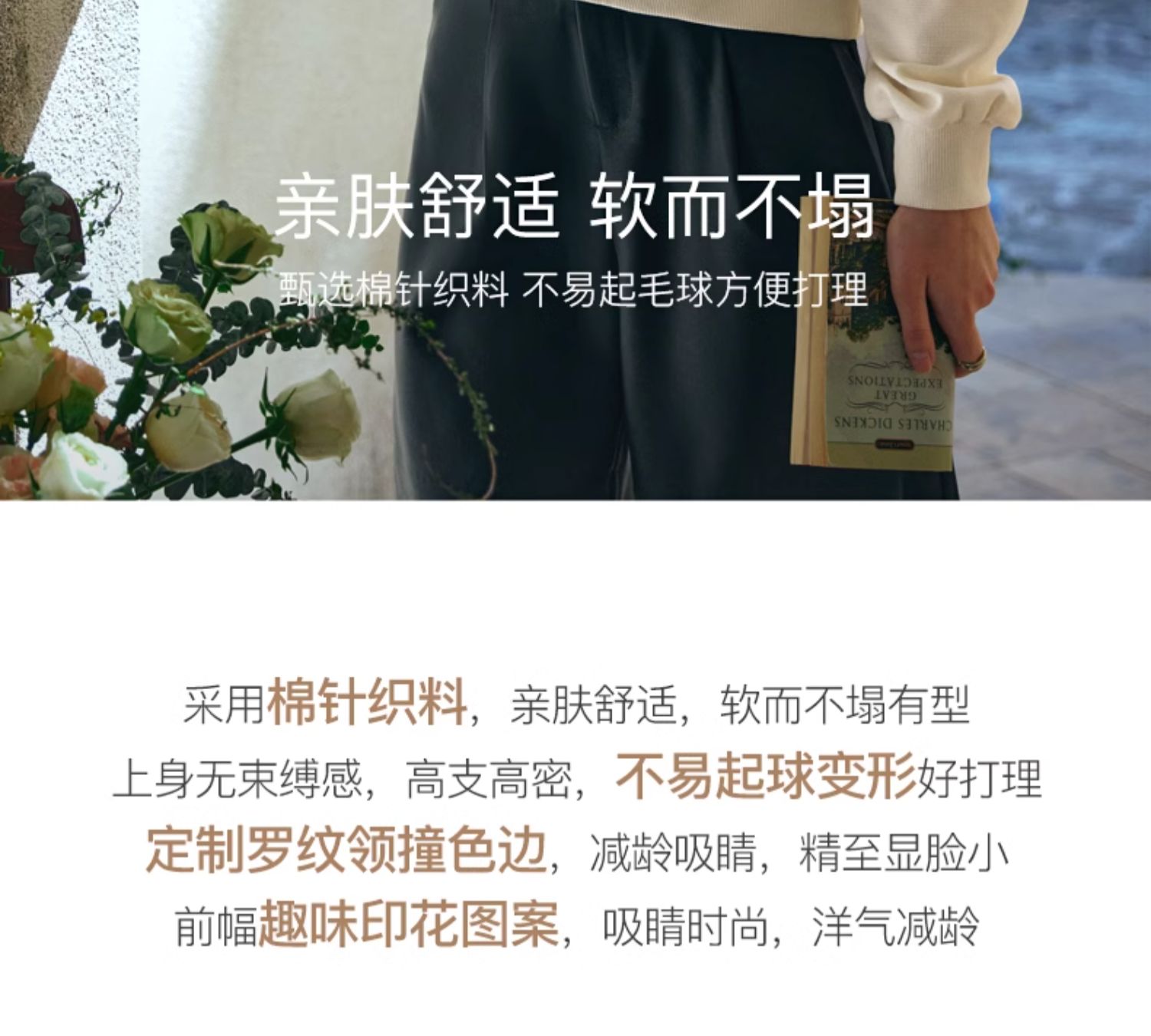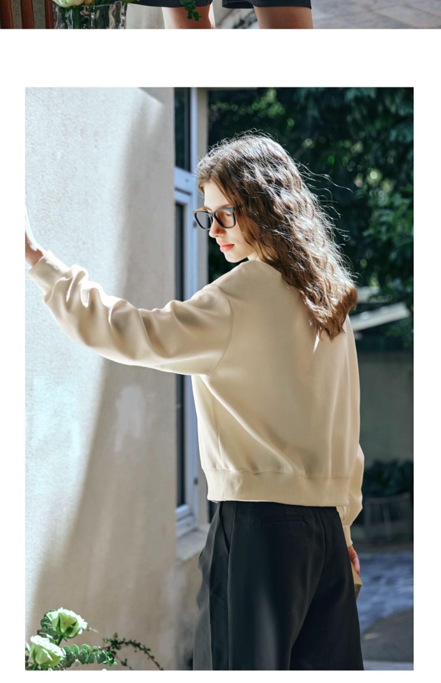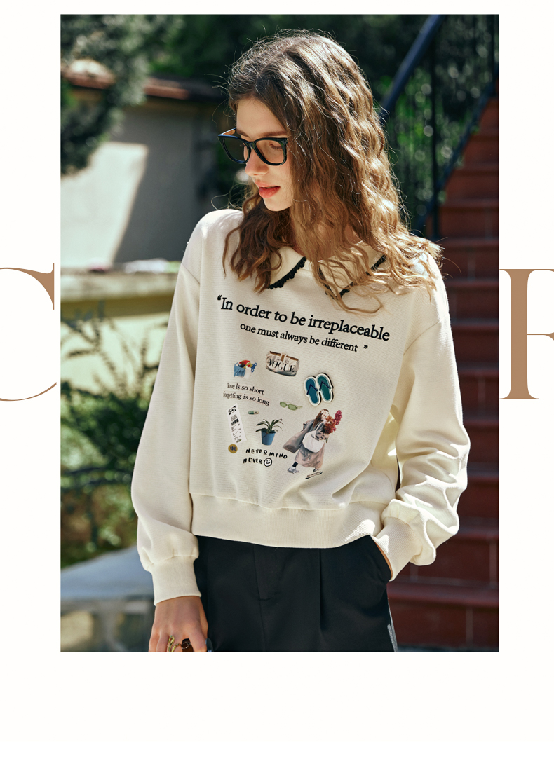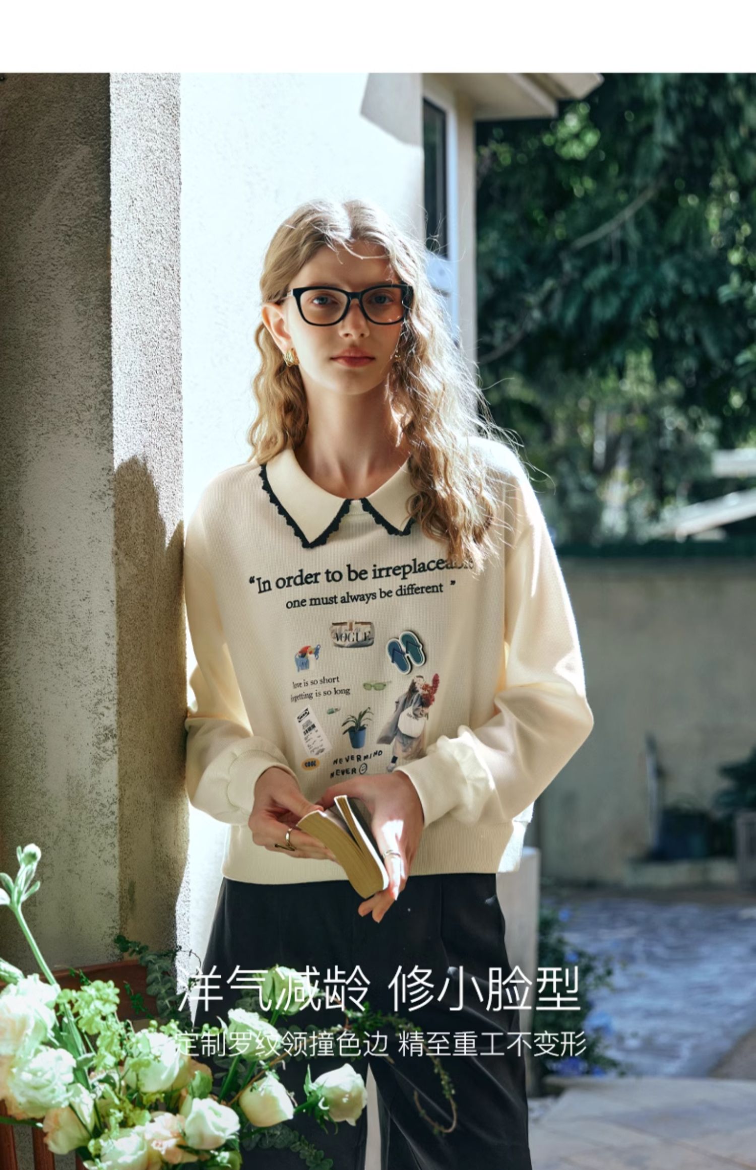 OLrain欧芮儿杏色短款卫衣女早春2024新款翻领趣味印花套头上衣
