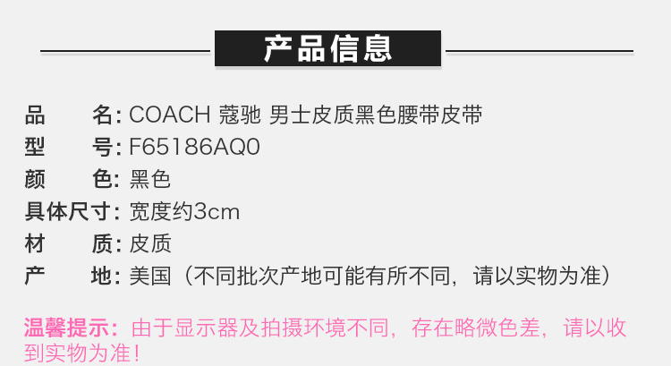 Coach 蔻驰 男士黑色牛皮腰带皮带 F65186AQO