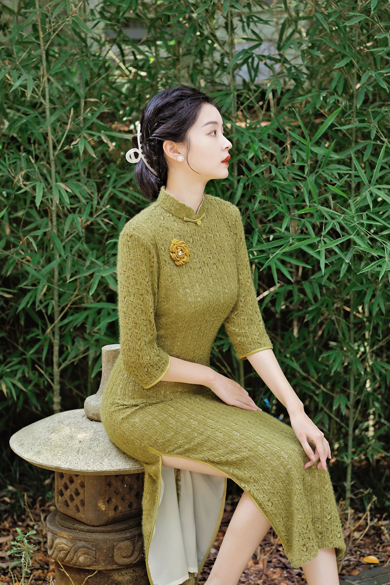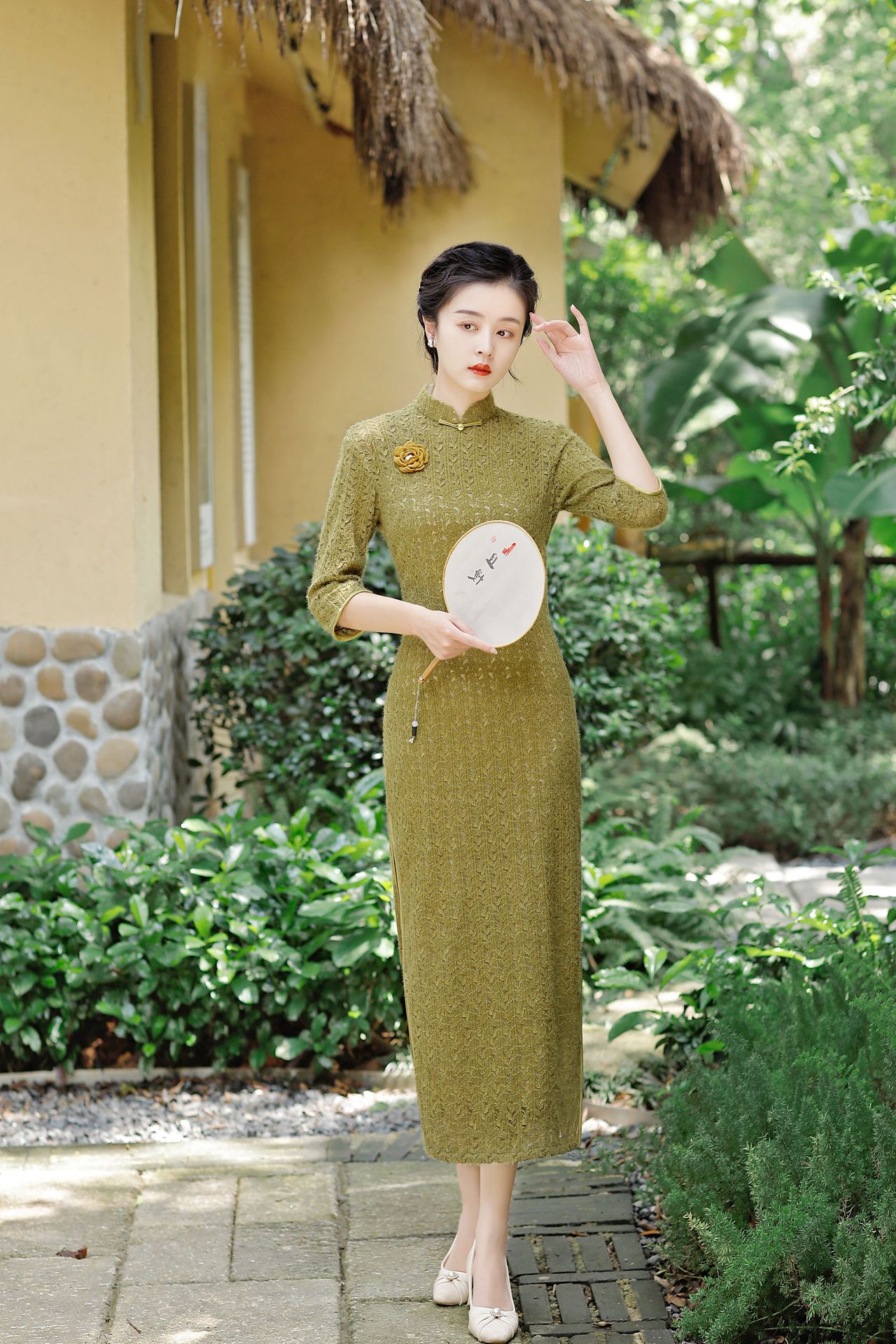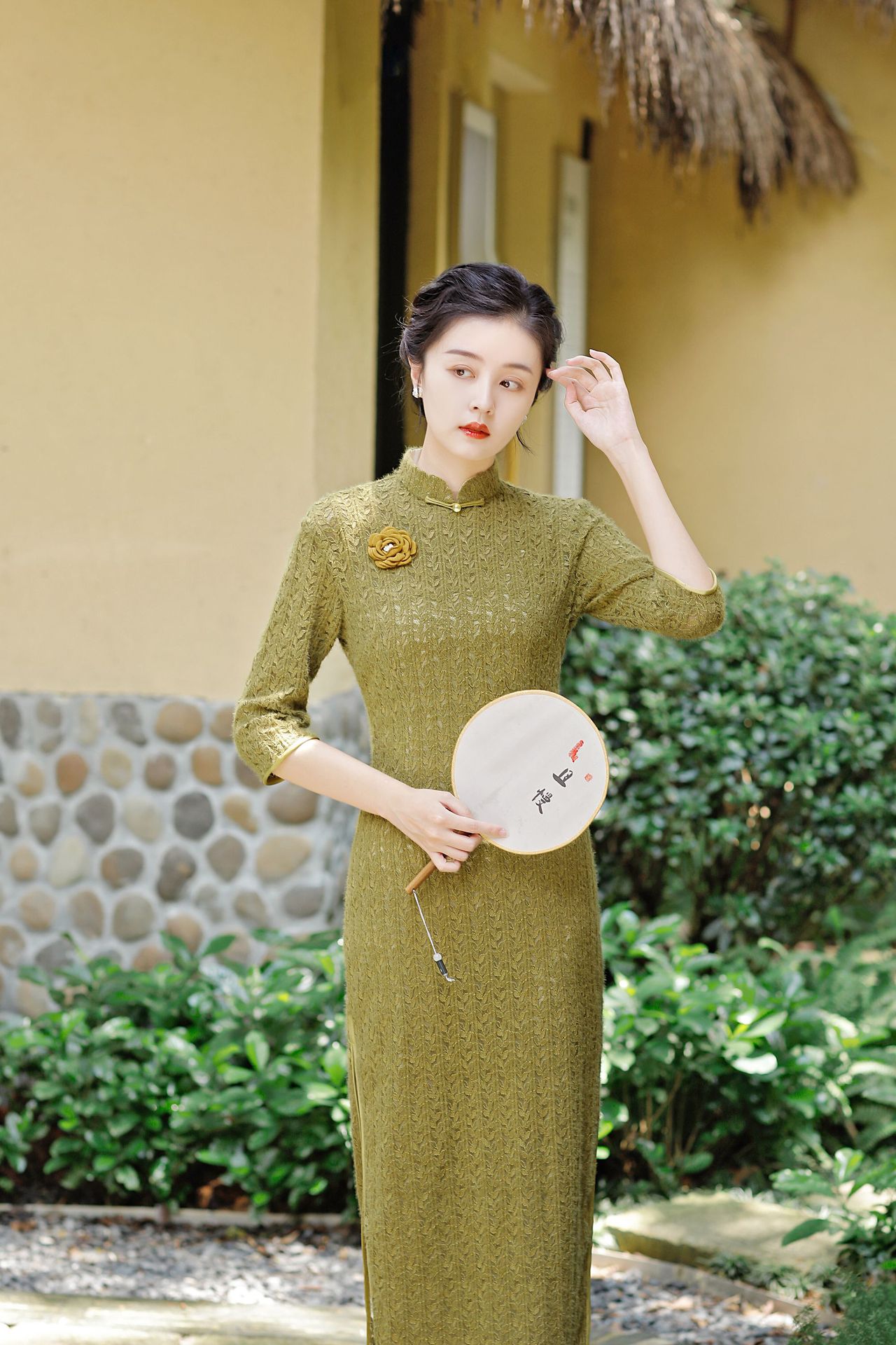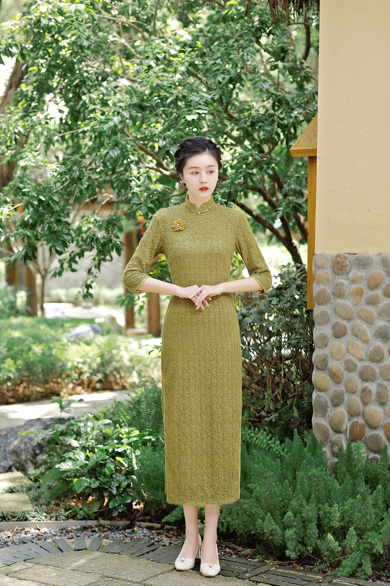 【秋香】柔软舒适秋香绿长款羽毛纱长款改良旗袍HQJ878