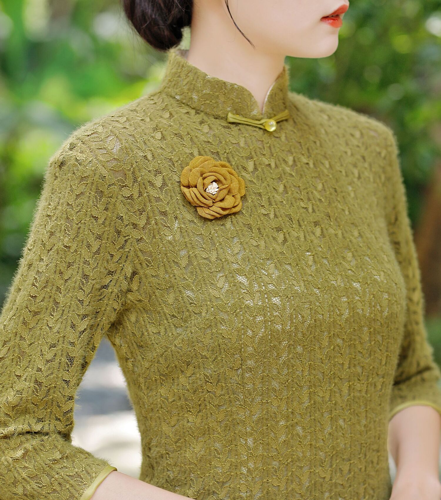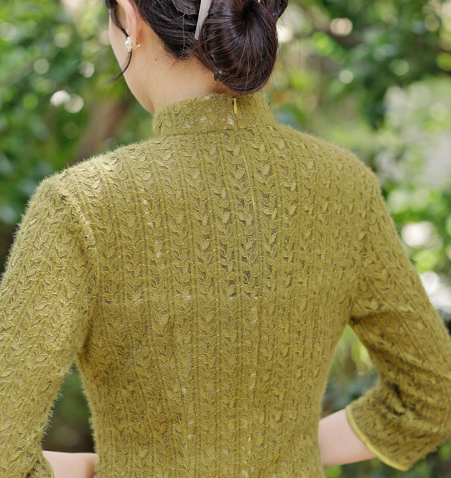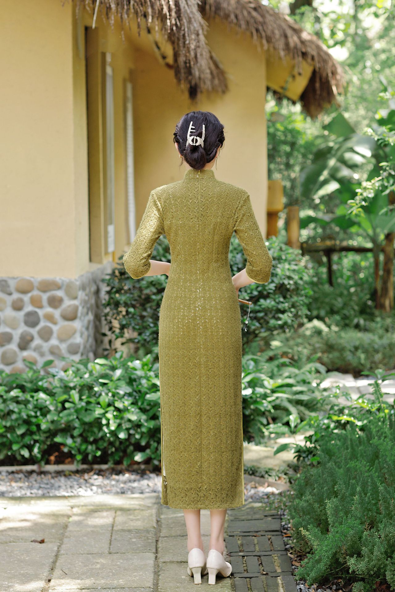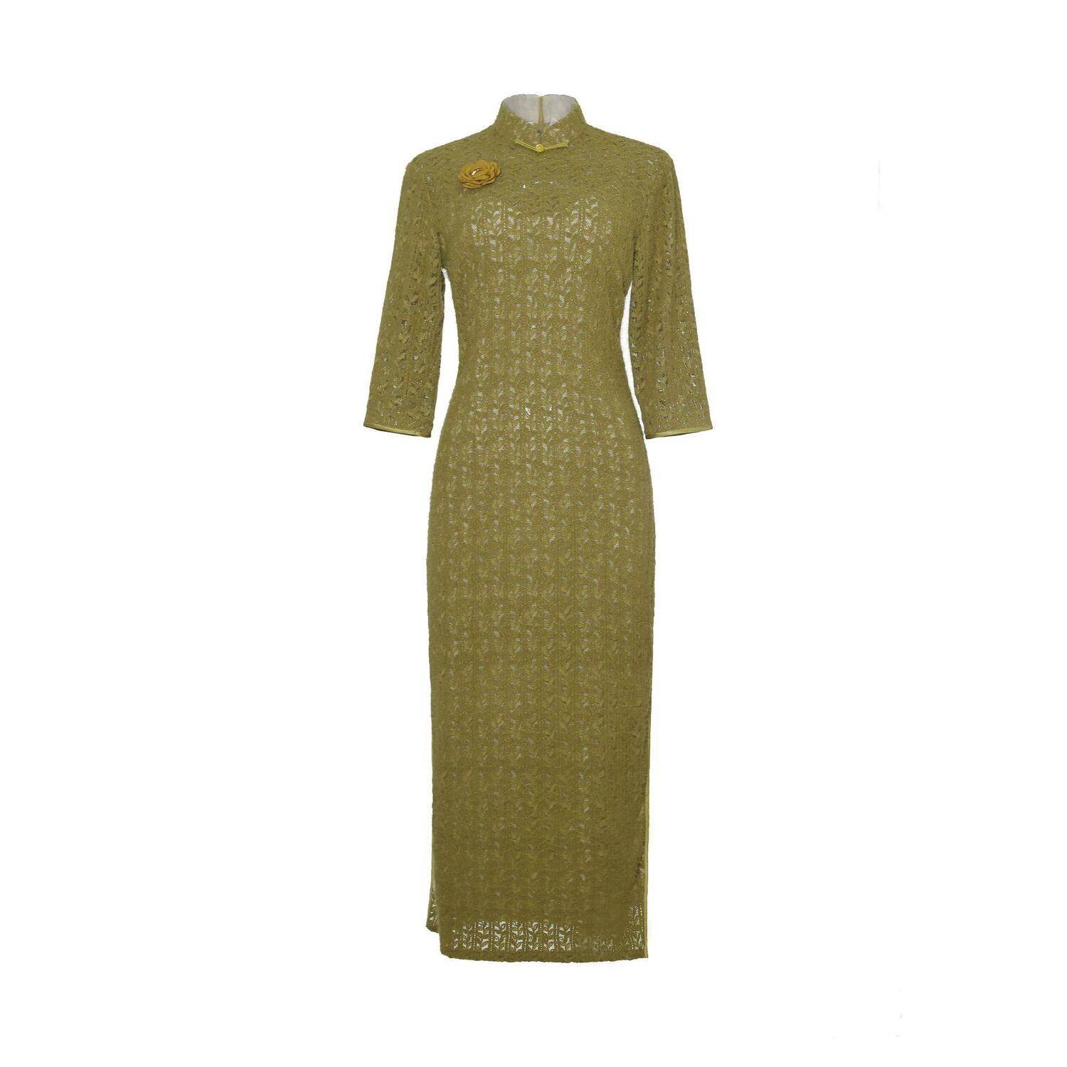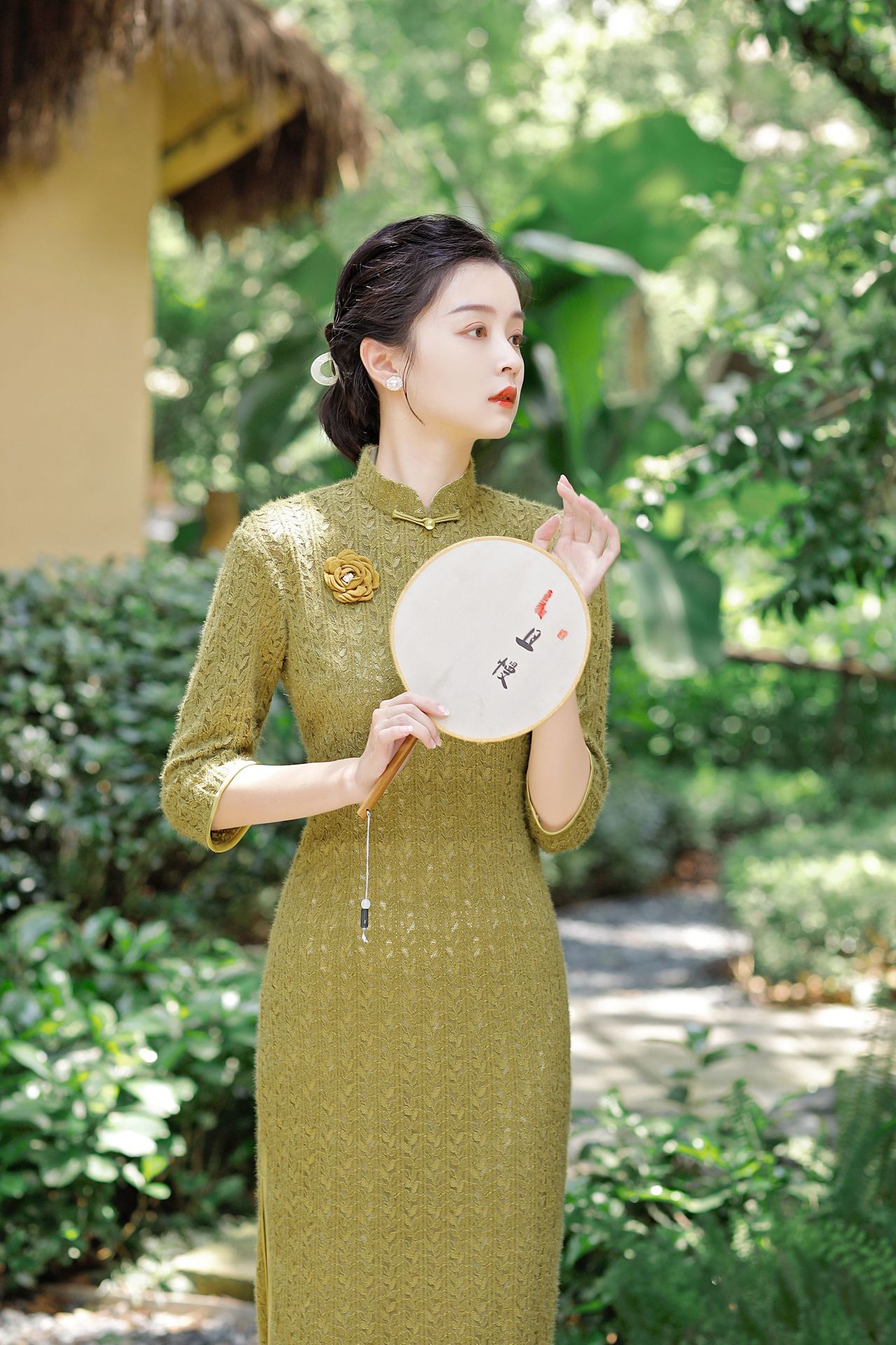 【秋香】柔软舒适秋香绿长款羽毛纱长款改良旗袍HQJ878