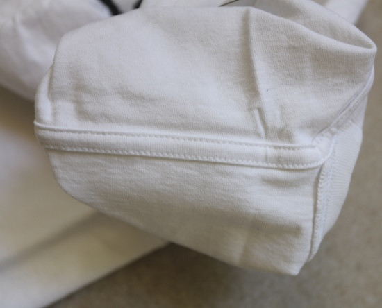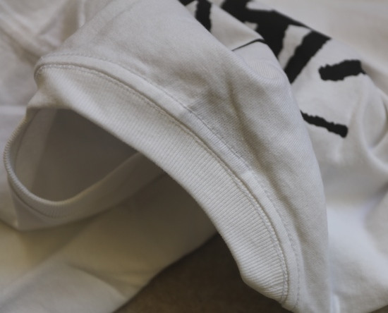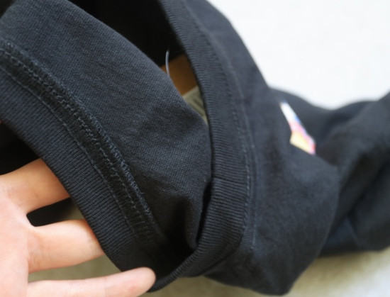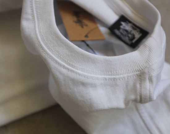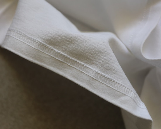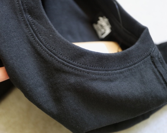 小领口 弹力螺纹的 内后领口至肩头 有通肩拉条 外面是双链条踩线加固的