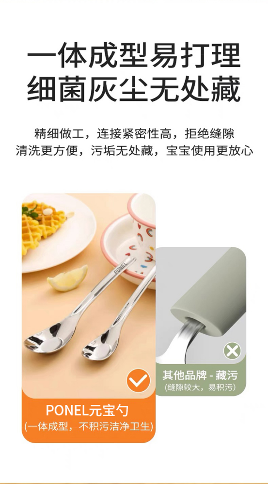 ✅一体化设计,清洗轻松省力 流线型勺体,表面无焊接 不藏污纳垢 清洗无死角,更方便 🉑进洗碗机、消毒柜