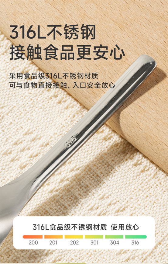 ✅升级316不锈钢材质,入口更安全更安心 普通的勺子是304不锈钢 我们这款升级成316L不锈钢 更耐腐蚀更安全 304不锈钢和316不锈钢对比: 🔺化学成分不同:304没有加钼元素,316有加 🔺耐腐蚀性不同:304所含镍元素为9%,316有12%,所以316更耐腐蚀 🔺性能不同:304具有一般耐腐蚀性,316更有耐氯化物腐蚀性、耐热性更好 🔺适用范围不同:304可制作成锅碗瓢盆等,316可用于食品、医疗手术刀等行业