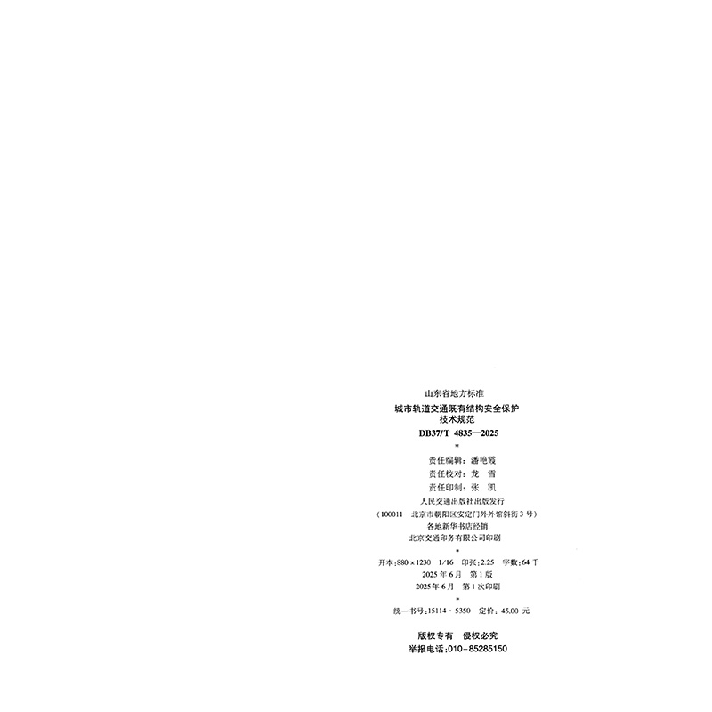 书名:城市轨道交通既有结构安全保护技术规范(DB37/T 4835—2025)