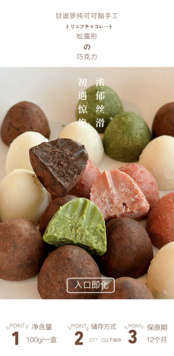 口感丝滑入口即化一口一个 天然可可脂 不含反式脂肪!! 每一颗都是独立包装 随手拿一颗打开就可以吃 不脏手! 每个口味都有独特的味道~