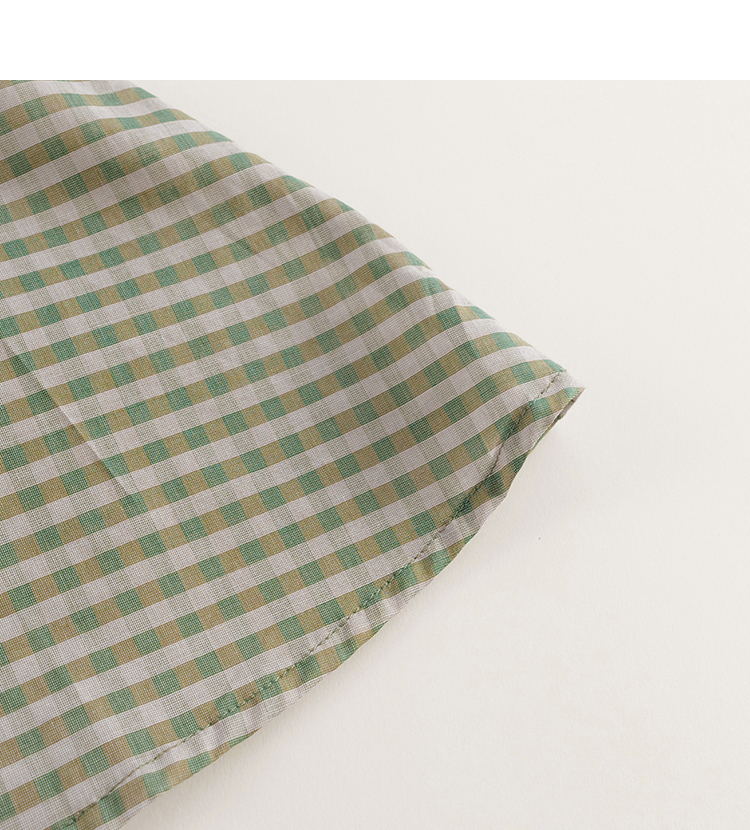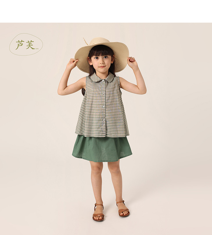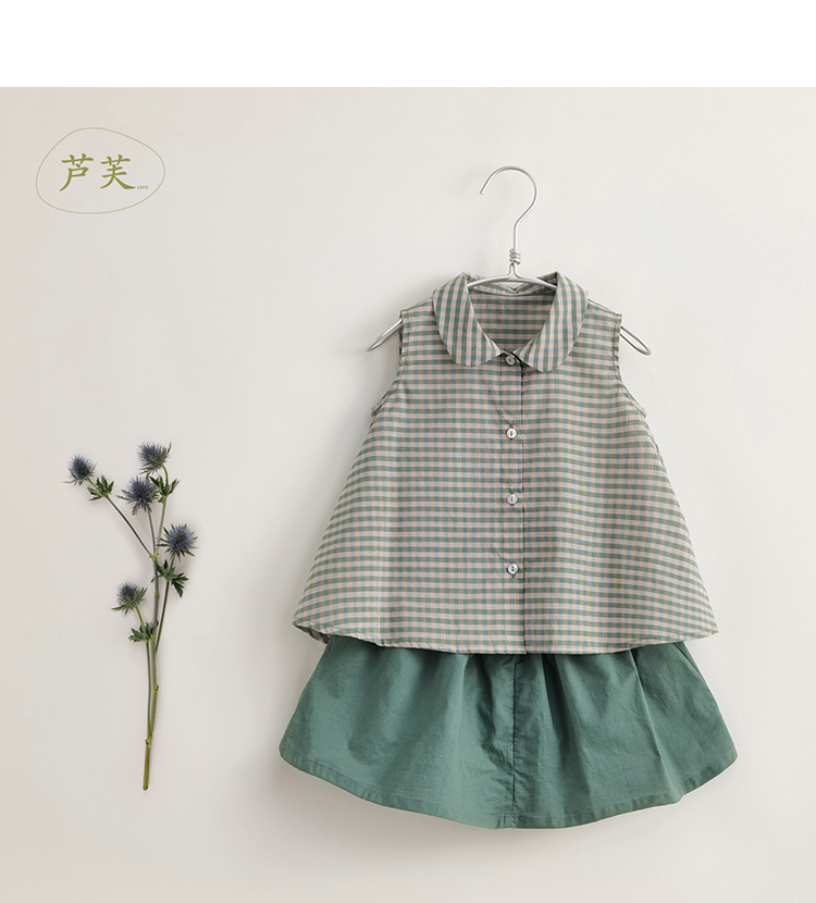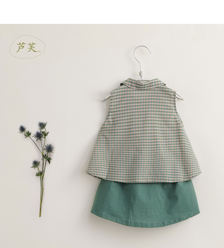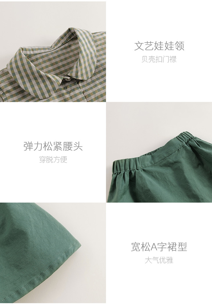 【马克珍妮 芦芙】夏装新款 女童透气棉麻绿格短裙套装230390