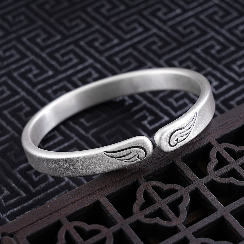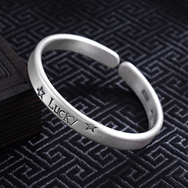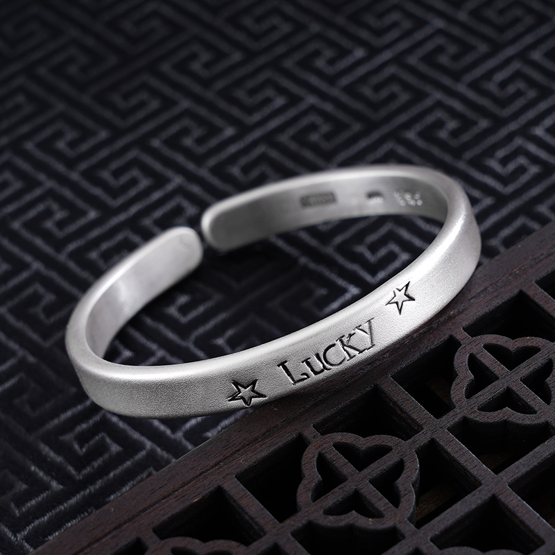 【寓意】:作品以天使翅膀为灵感设计,以錾刻工艺描绘翅膀轮廓,使手镯更具张力。搭配英文字母“LUCKY”,寓意天使守护,幸运永恒。