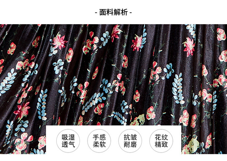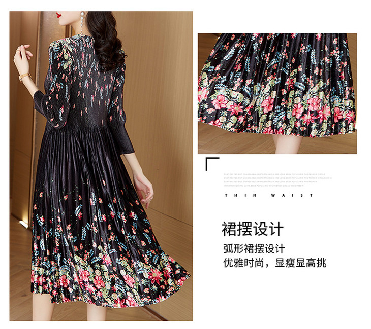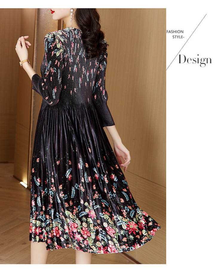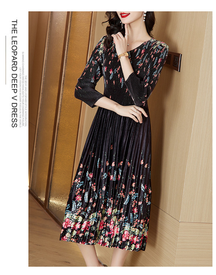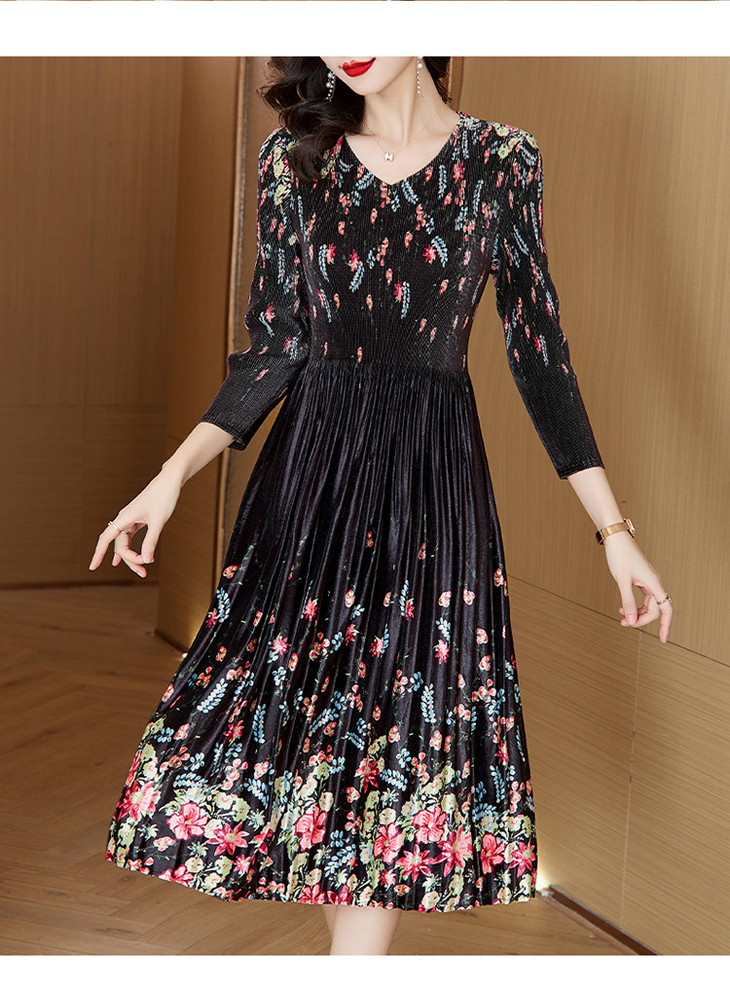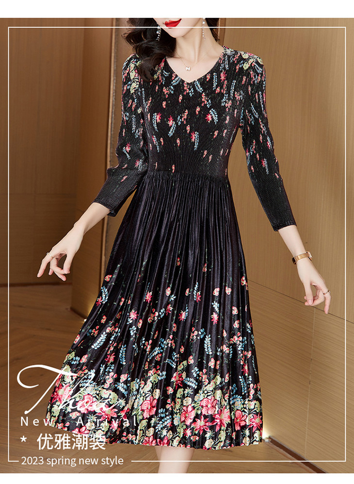 复古印花丝绒褶皱连衣裙AHM-kln2383