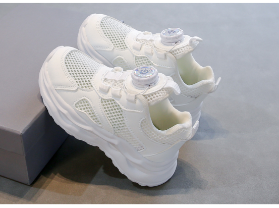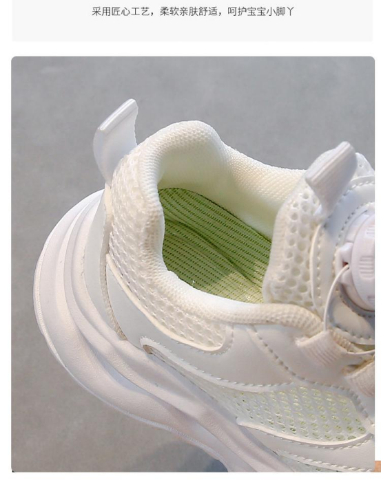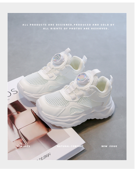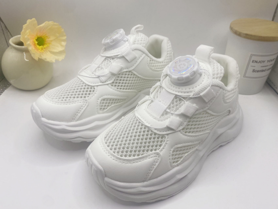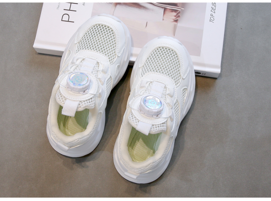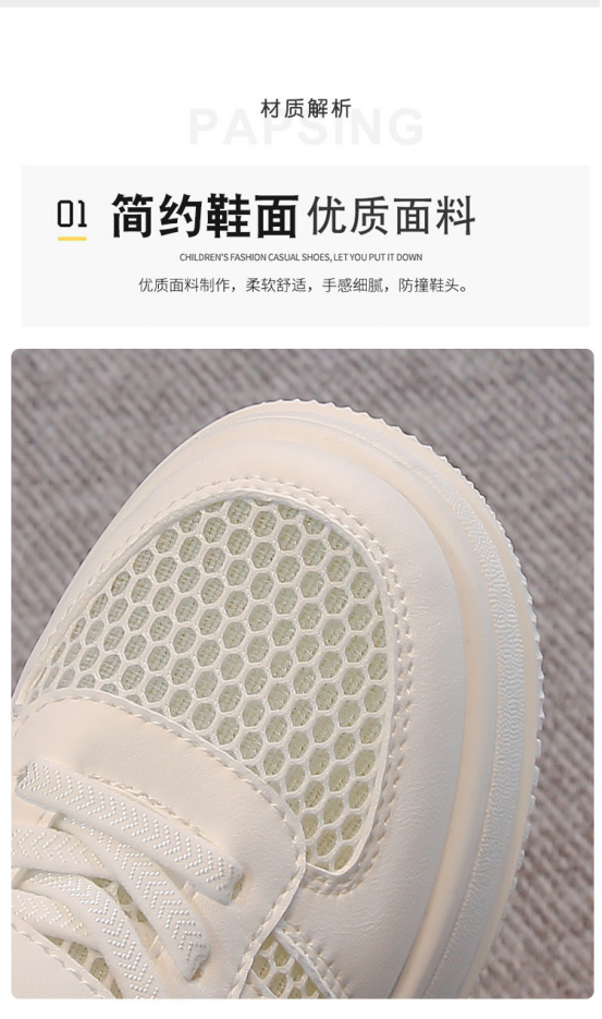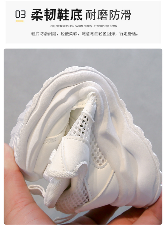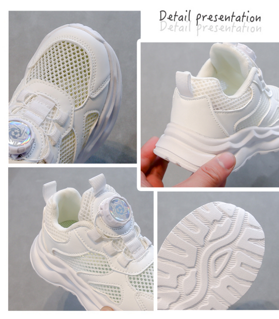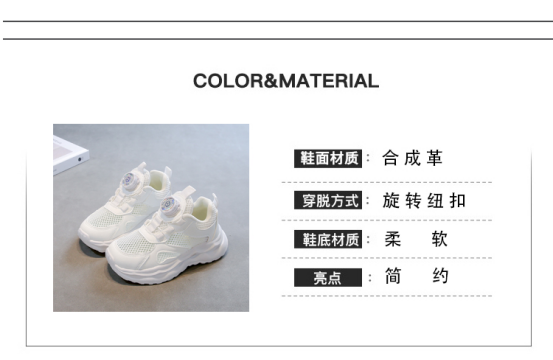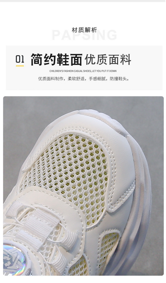 旋钮扣运动鞋细节: 合成革 + 网布鞋面,耐磨还超透气,孩子跑跑跳跳一整天也不闷汗; PVC 防滑鞋底软弹 Q 弹,2.5cm 跟高增加小小 “小心机”,悄悄拉长腿型~