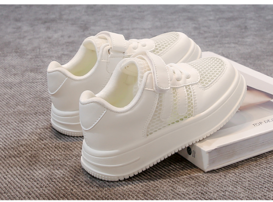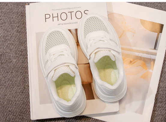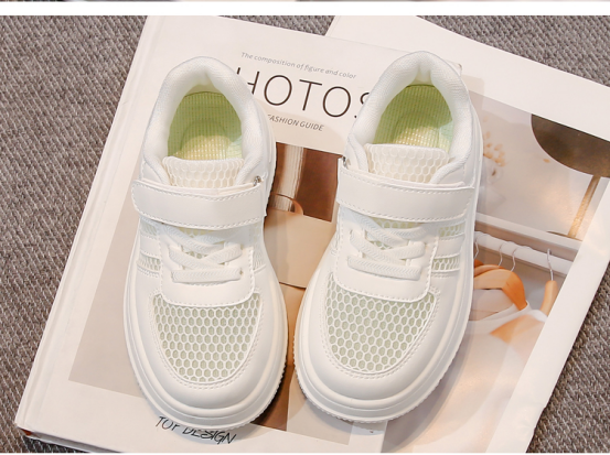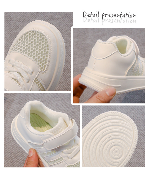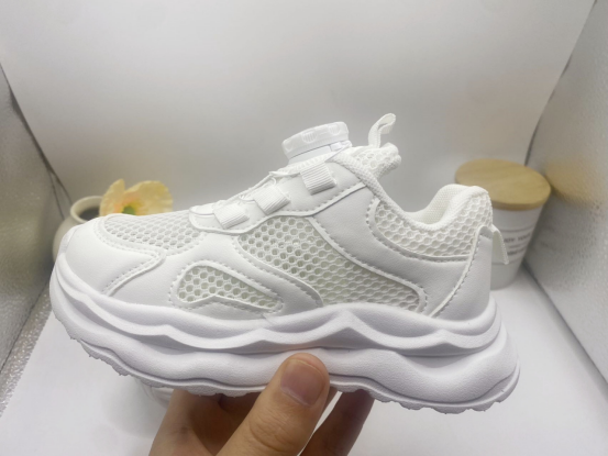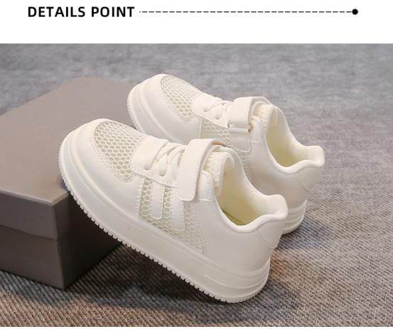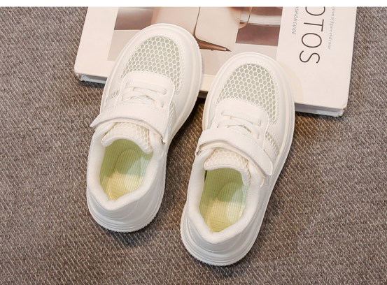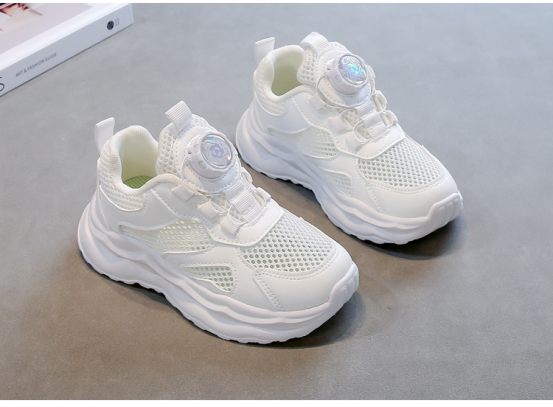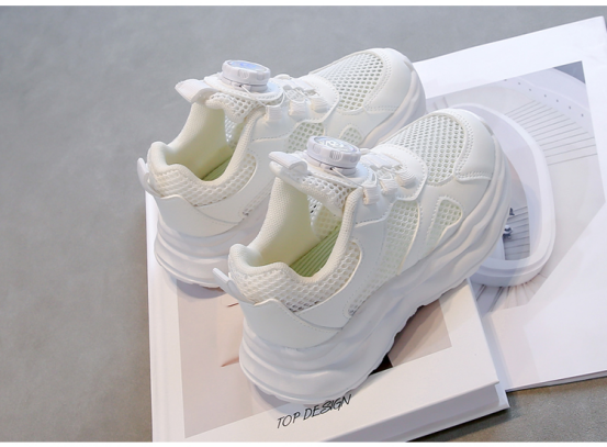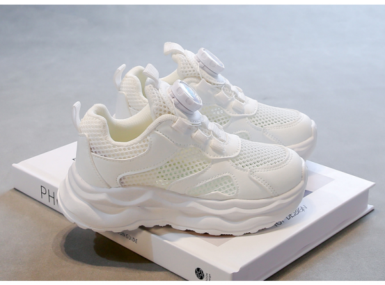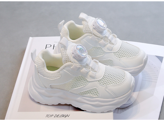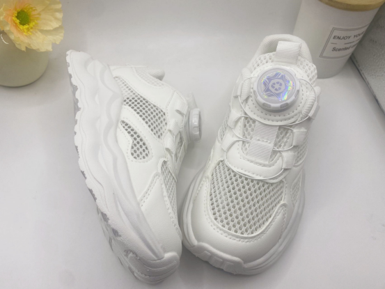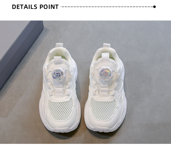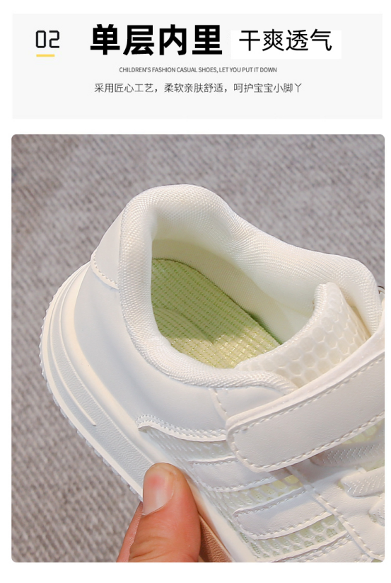 旋钮扣运动鞋细节: 合成革 + 网布鞋面,耐磨还超透气,孩子跑跑跳跳一整天也不闷汗; PVC 防滑鞋底软弹 Q 弹,2.5cm 跟高增加小小 “小心机”,悄悄拉长腿型~