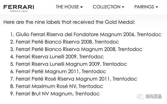 多款起泡酒多次获得《意大利葡萄酒年鉴》“三杯奖”,如法拉利黑珍珠特干起泡酒(Ferrari Trento Extra Brut Perle Nero)。“三杯奖”是意大利葡萄酒的最高荣耀,每年整个意大利仅有 300 多款葡萄酒可以获得“三杯奖”荣誉称号,仅占品评酒款总数的 0.08%。此酒还获得“意大利最佳起泡酒”称号,并获得9枚金牌。