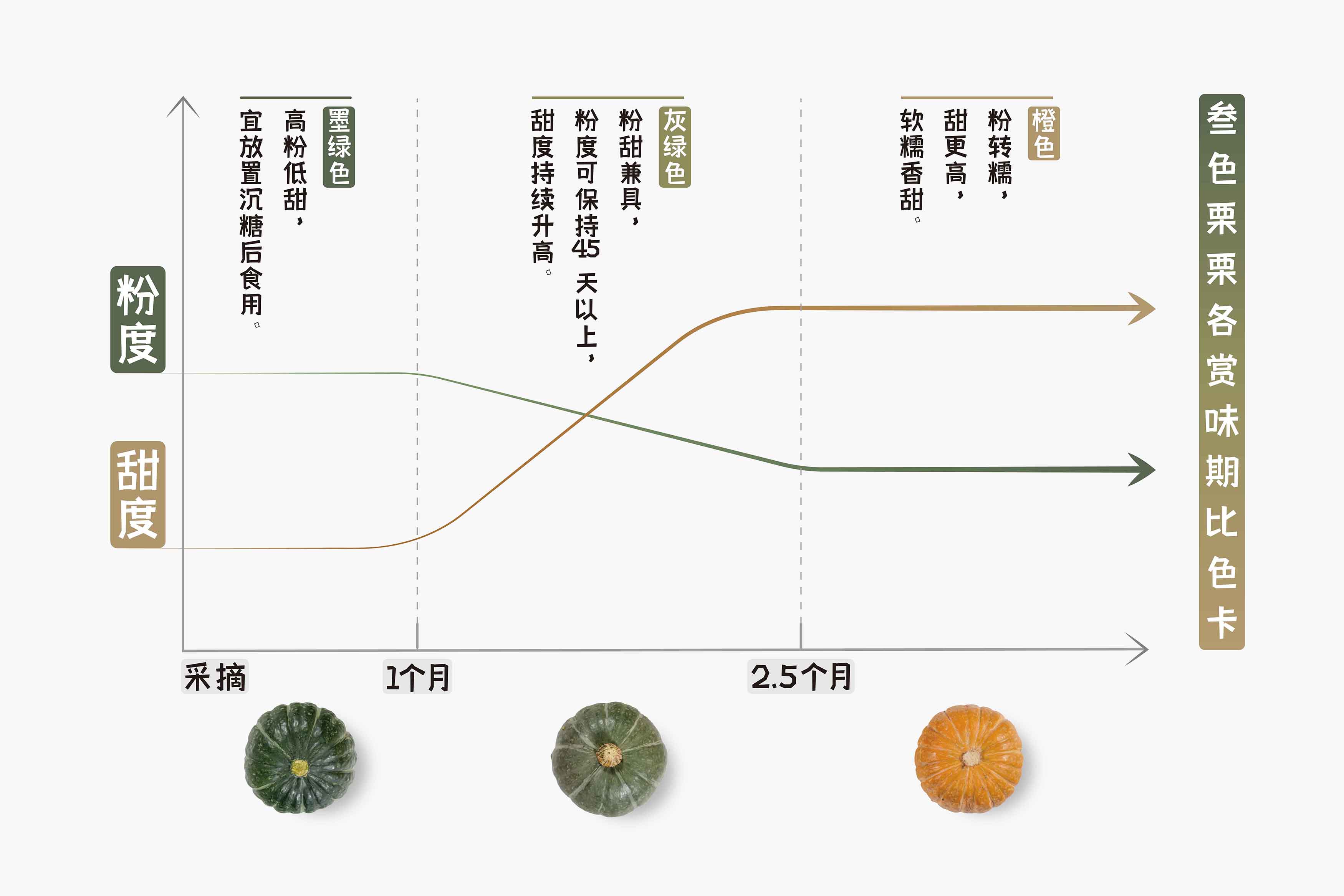 2.甜度高,粉度高,持粉时间长。粉度相比老品种更高,具有独特的香气,口感近似板栗。它的最佳赏味期甜度和粉度兼备,可以持续45天之久,而市面上其他同类产品,实验室对比之下普遍只能持续一周左右,并且叁色栗栗南瓜吃起来更加的粉糯香甜。