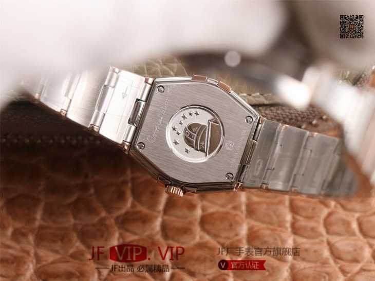 8848F欧米茄星座系列,表径24mm,搭载原版欧米茄1376专用机芯,字面采用一级珍珠贝母和南非真钻制成,表带18K金盾牌,女士腕表,精钢表带,自动机械机芯