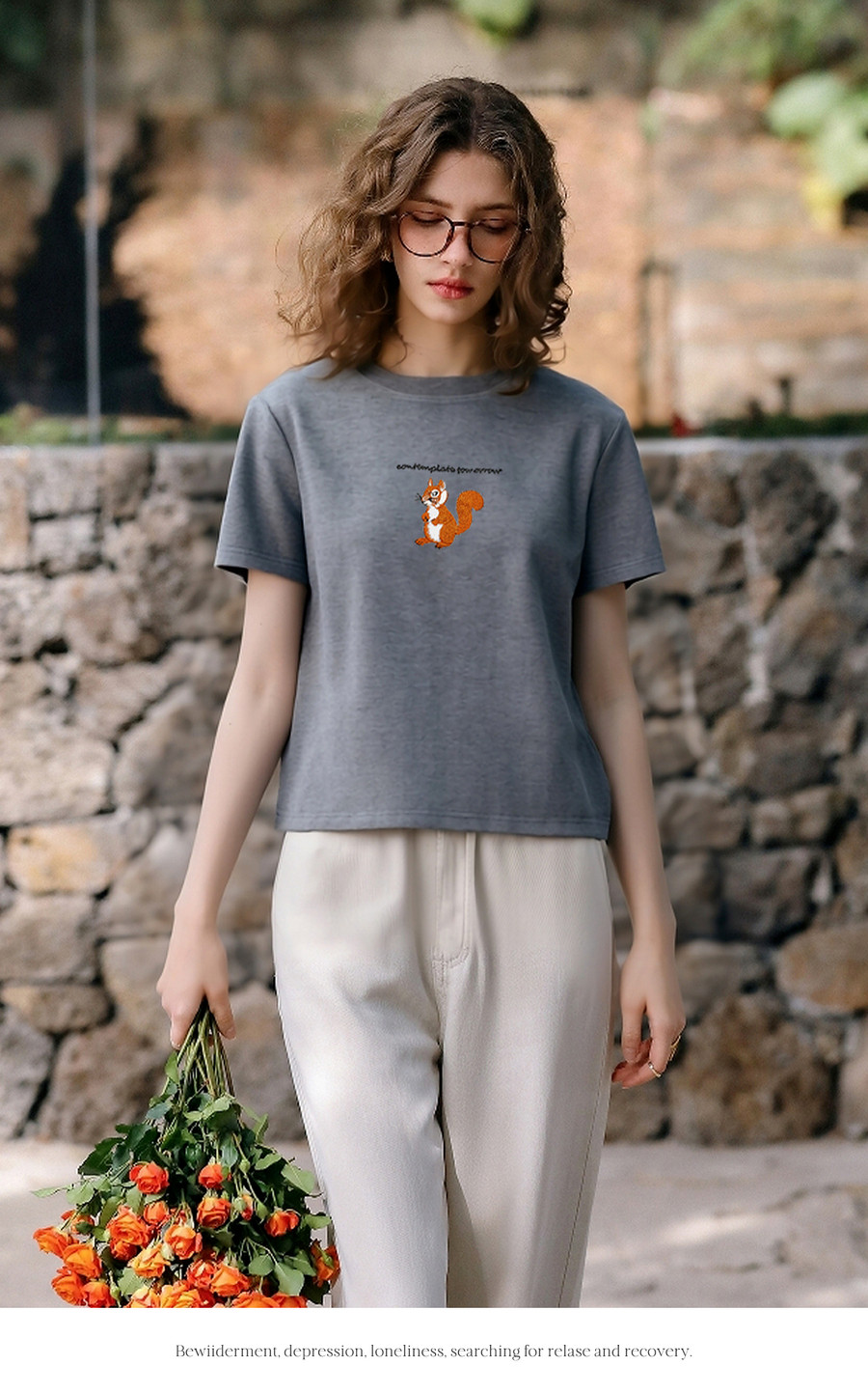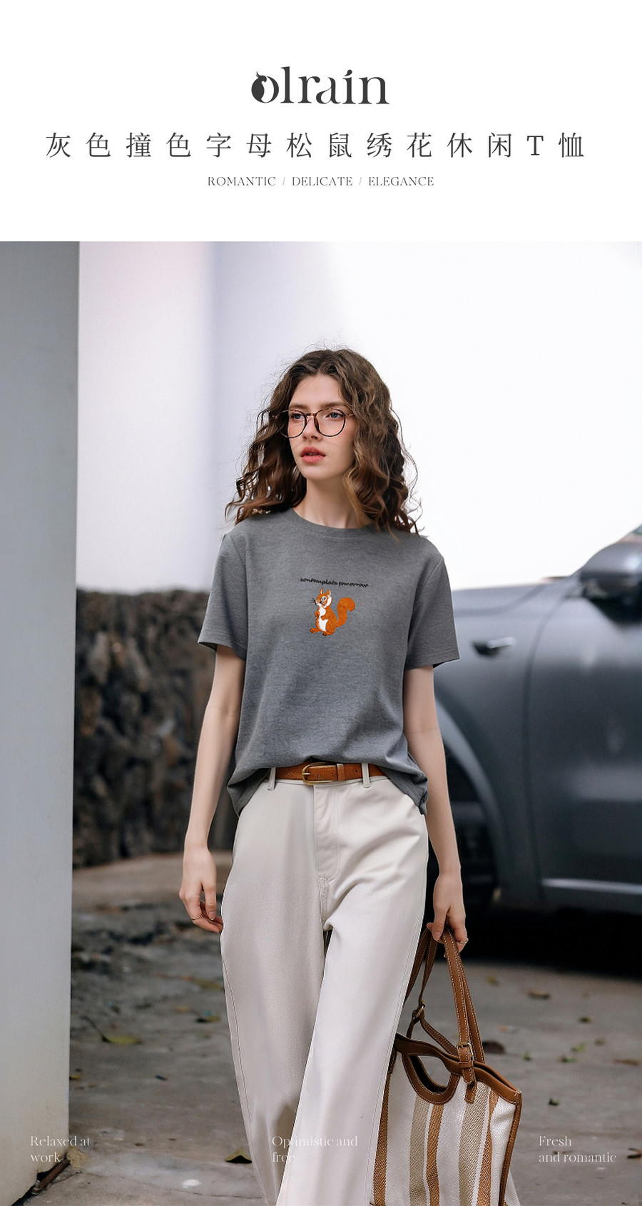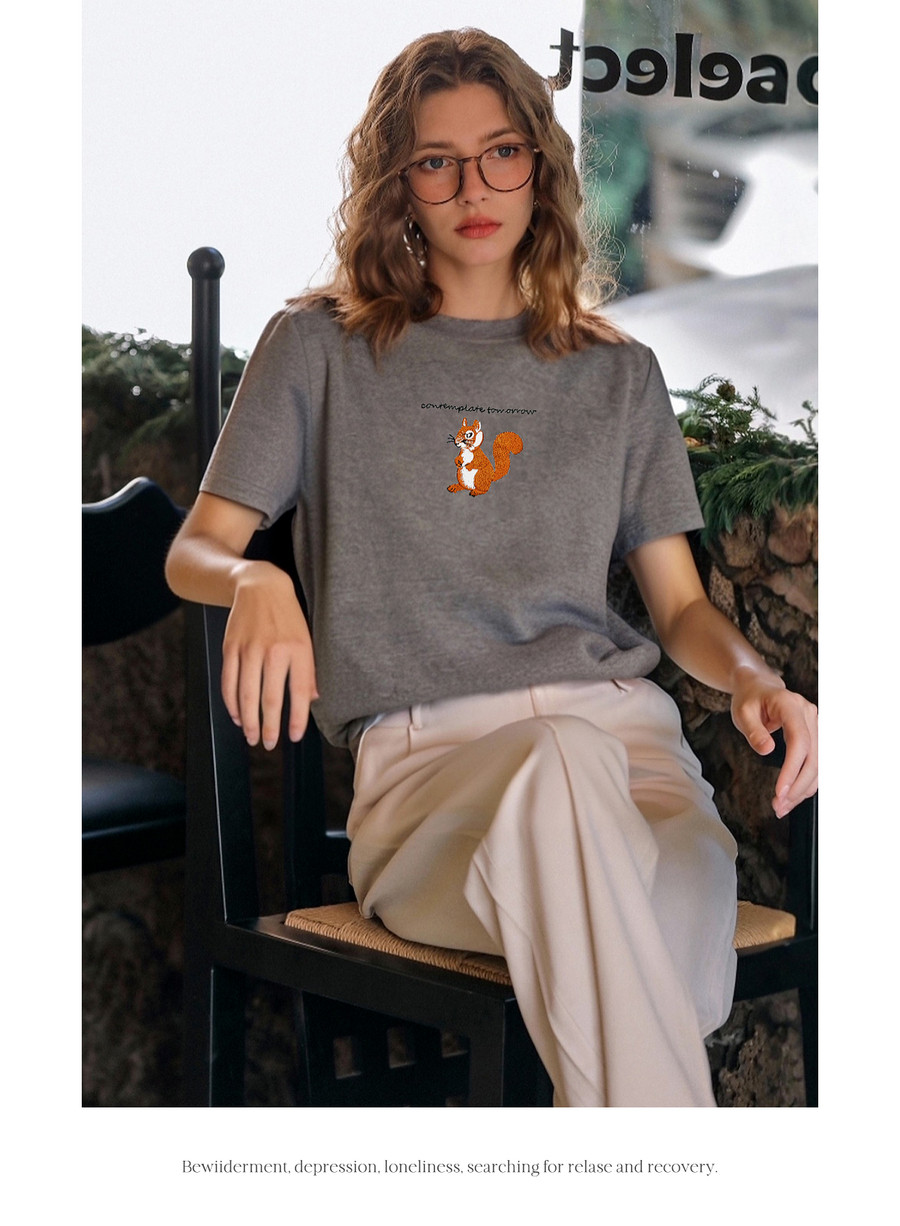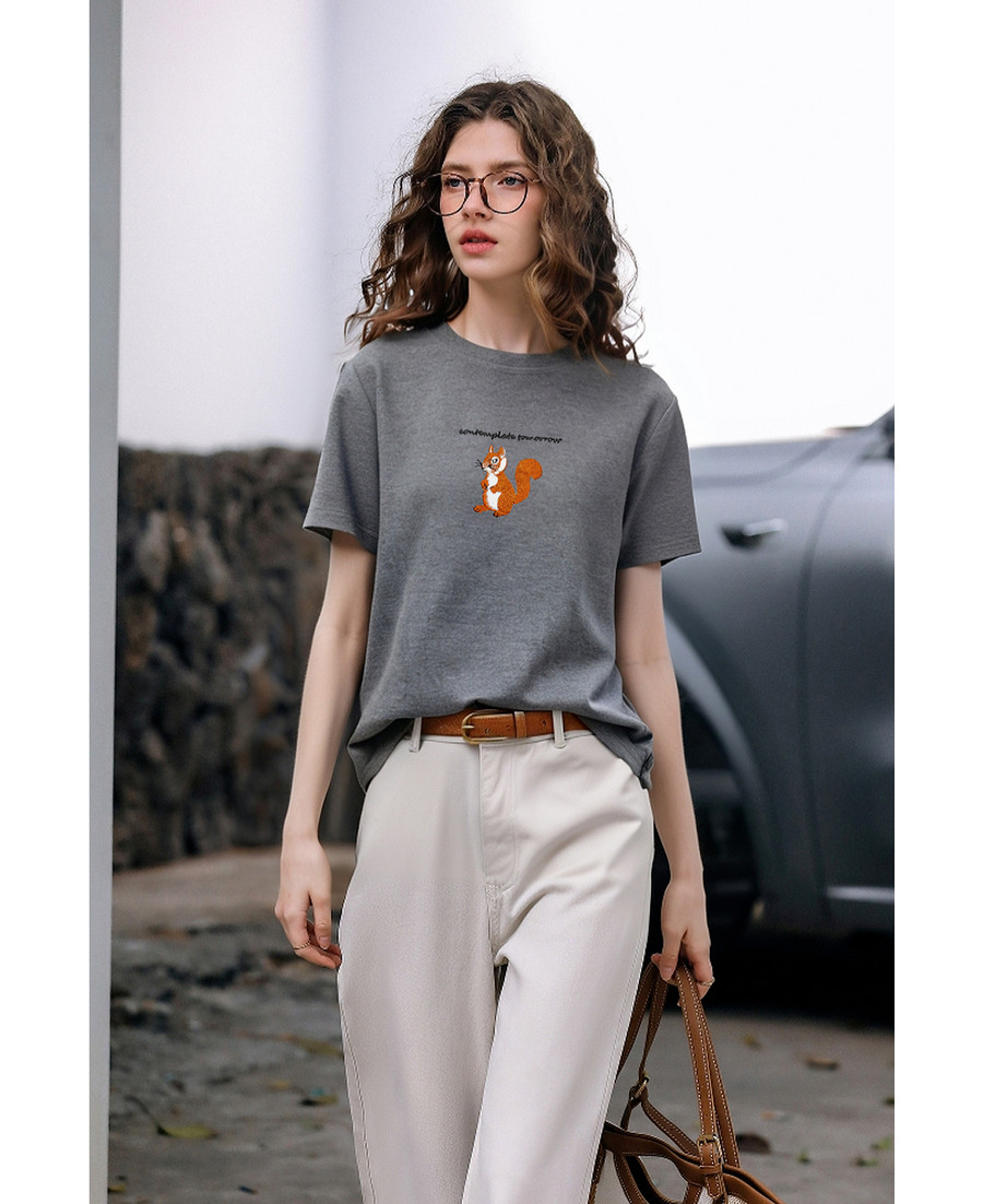 欧芮儿2026年新款夏季字母绣花设计上衣灰色圆领简约休闲短袖T恤