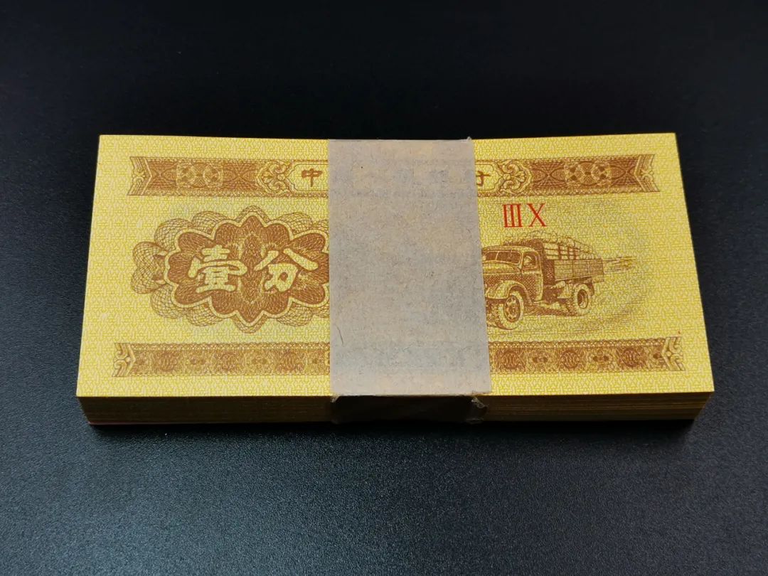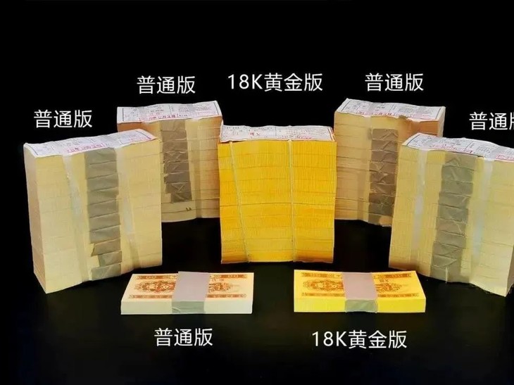 18K黄金版一分,由于是牛皮纸包装,保证了原包纸币的品相,整体无油迹的污染,十分洁净,金灿灿的,就像一堆黄金!