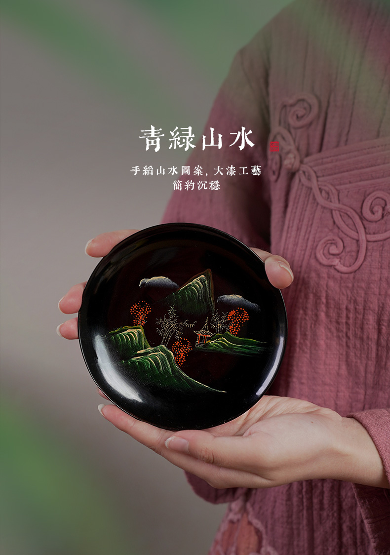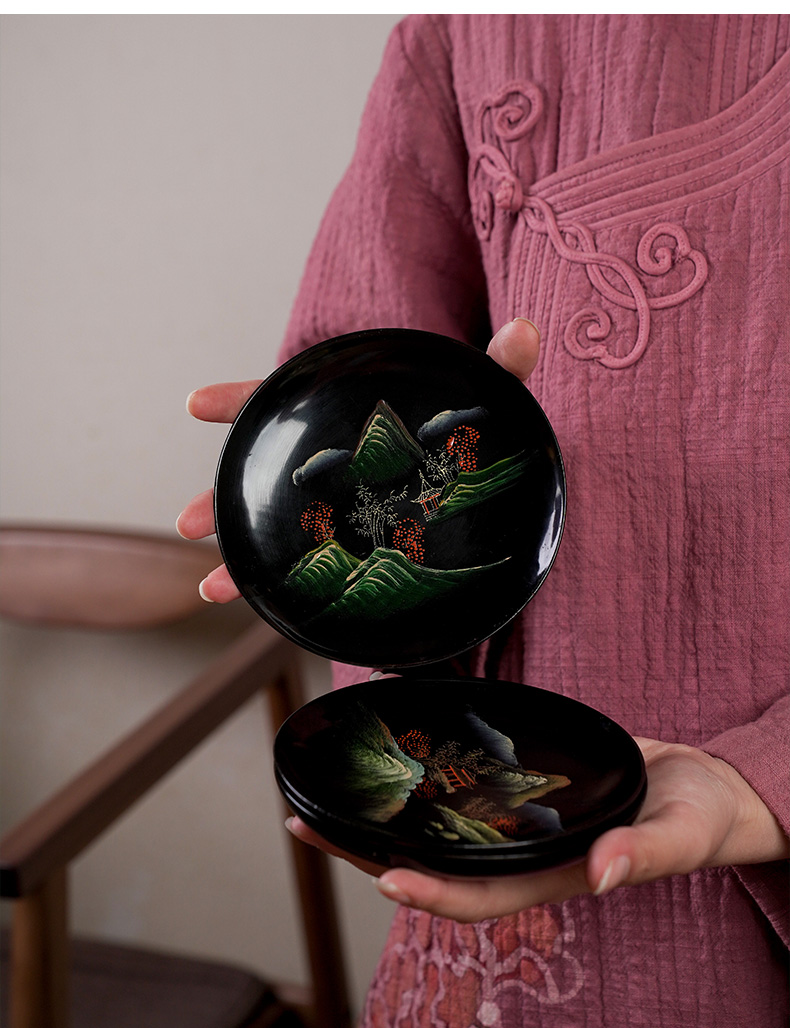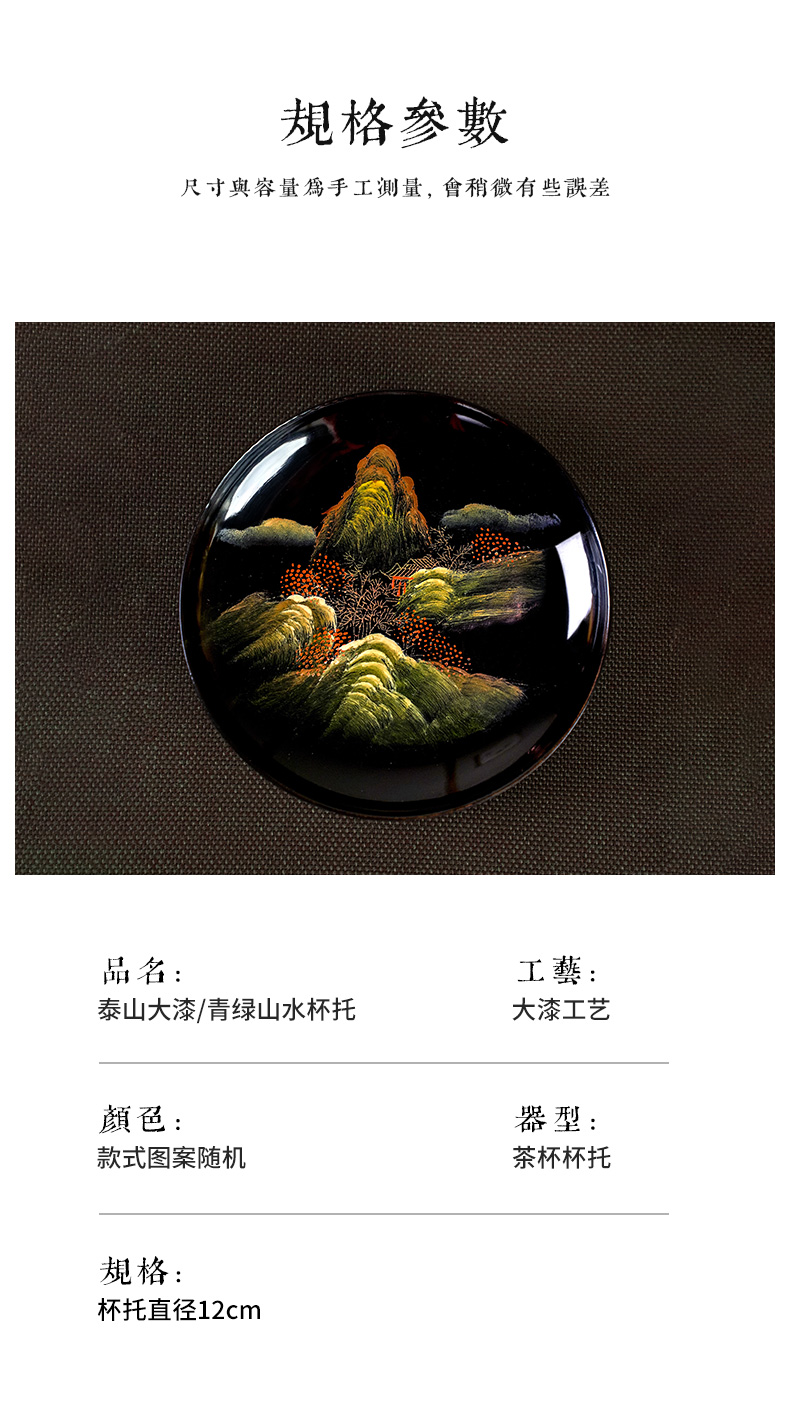 泰山大漆/青绿山水杯托 【图案随机发】 怀旧复古大漆杯托手绘青山绿水杯垫壶承底托