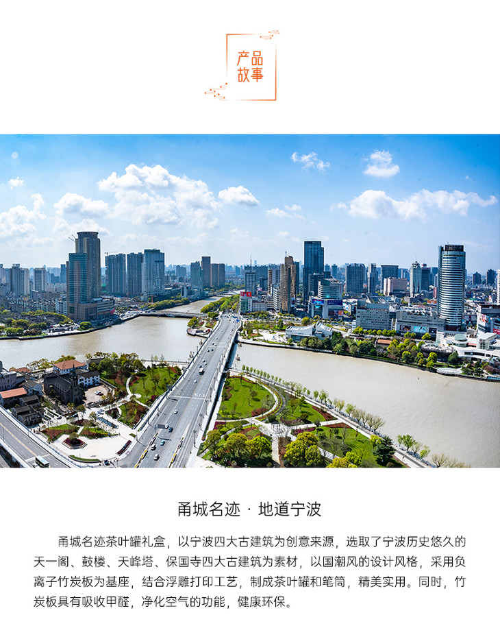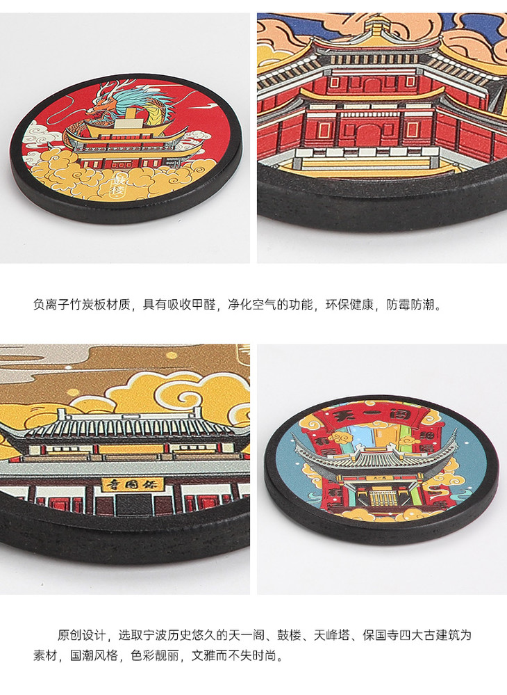 金泉宝墨出品 创意密封茶叶罐杯垫 甬城名迹竹炭礼盒套装