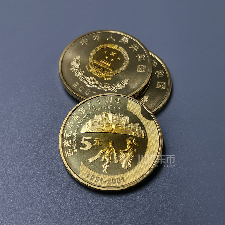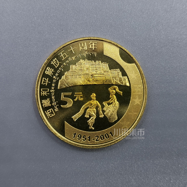 背面图案:由布达拉宫两名藏族男女青年欢庆西藏和平解放五十周年舞蹈场景及面额“5元”字样组成,内圆左侧环排有“西藏和平解放五十周年”汉藏两种文字,右侧由半圆环结合构成的“50”象形字,下方为“1951-2001”字样