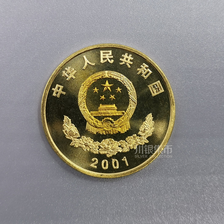 正面图案:主景图案由国徽和五朵牡丹花组成,内圆上方刊“中华人民共和国”国名,下方环刊“2001”年号