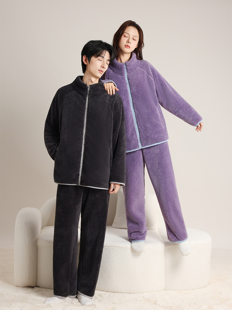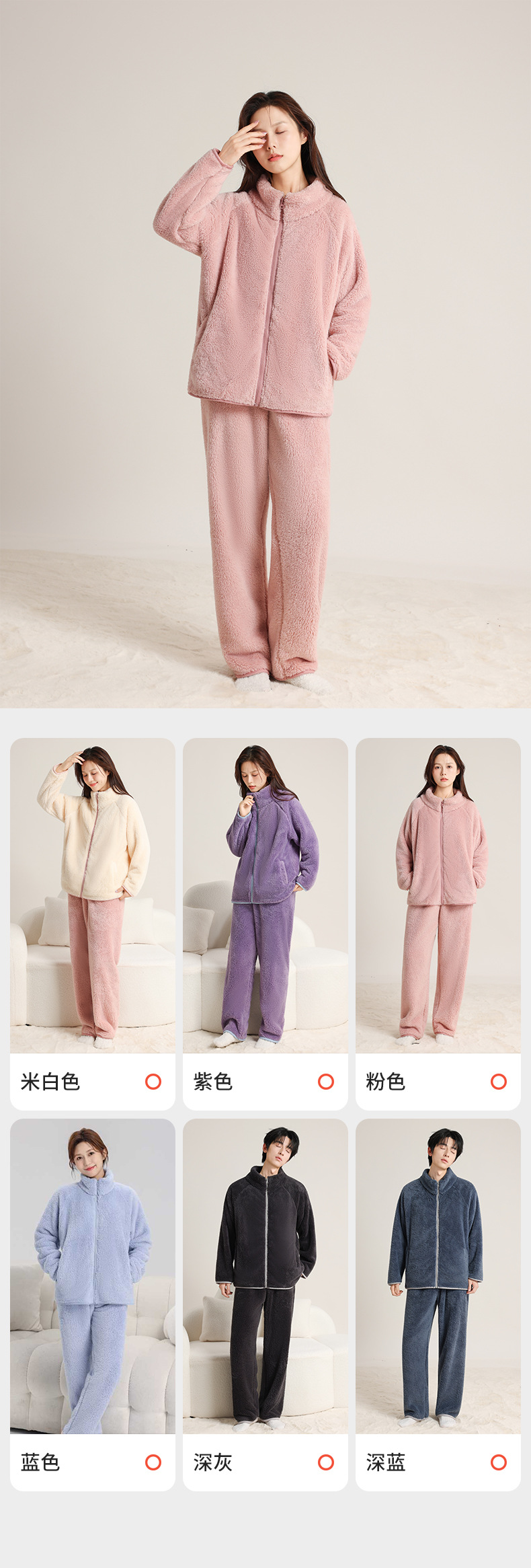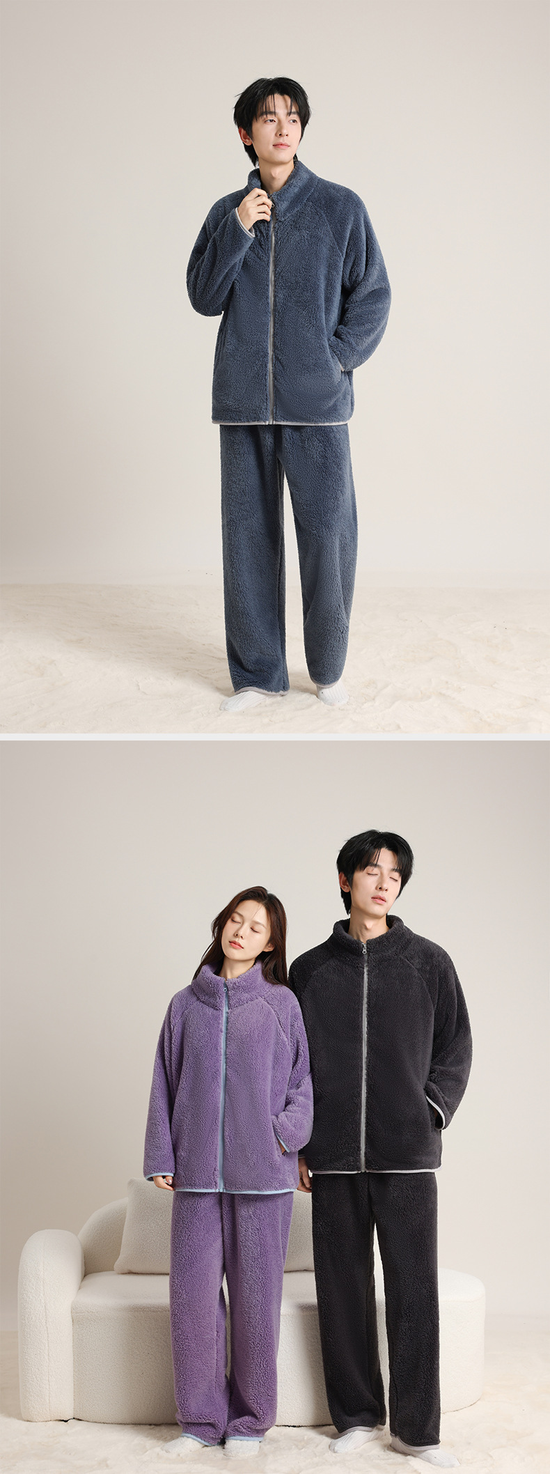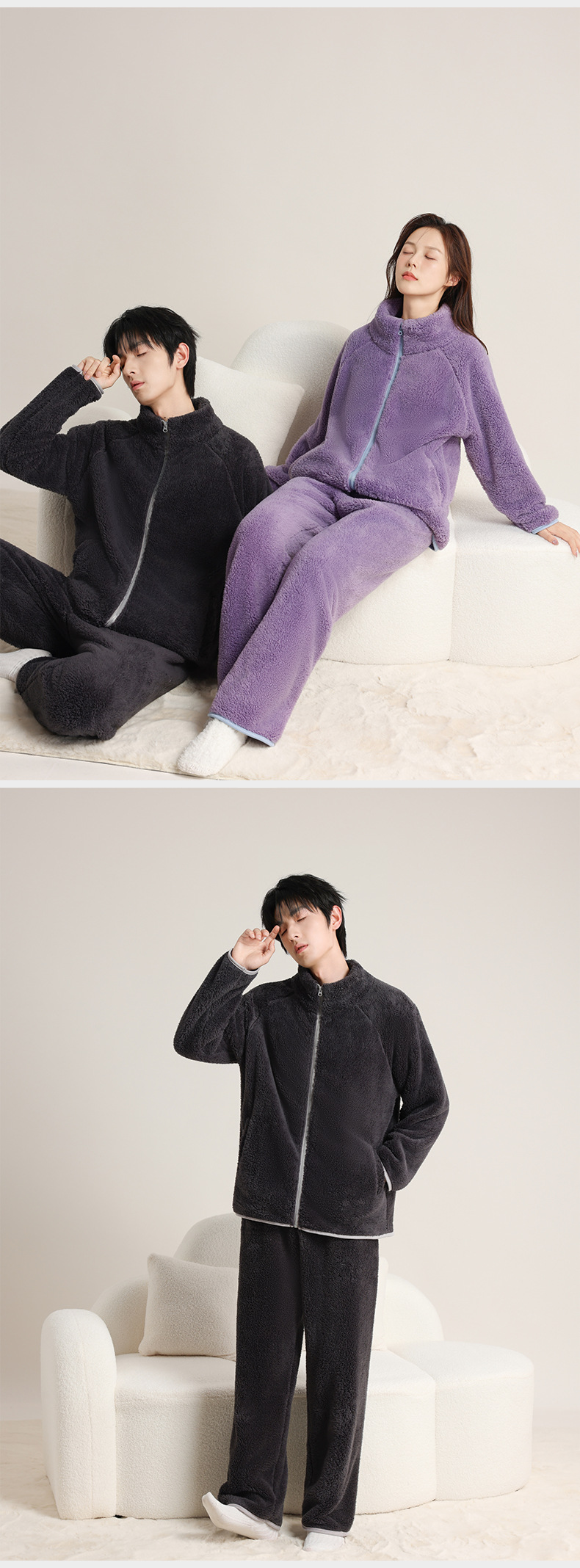 希燕茵情侣秋冬法兰绒加厚睡衣双面绒拉链连帽简约休闲男女士家居服套装XY0021★