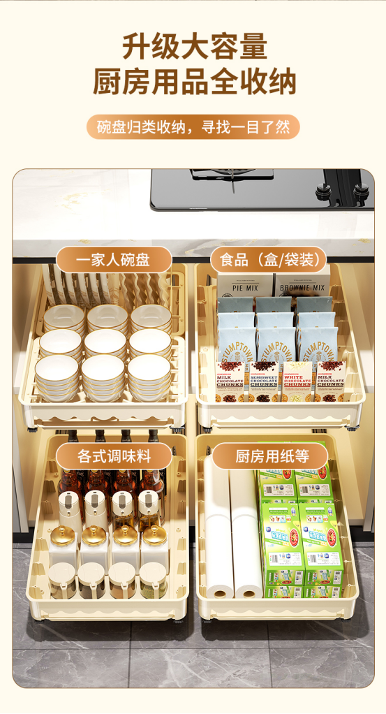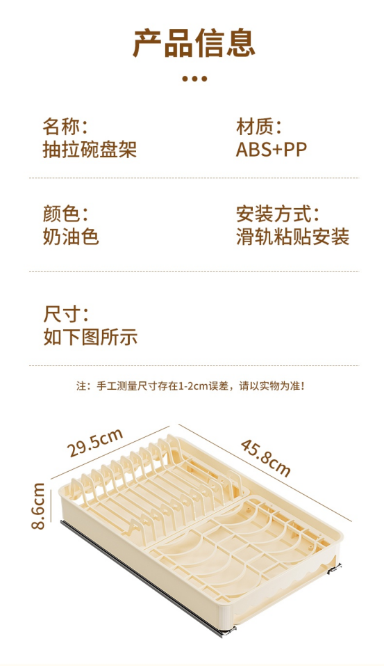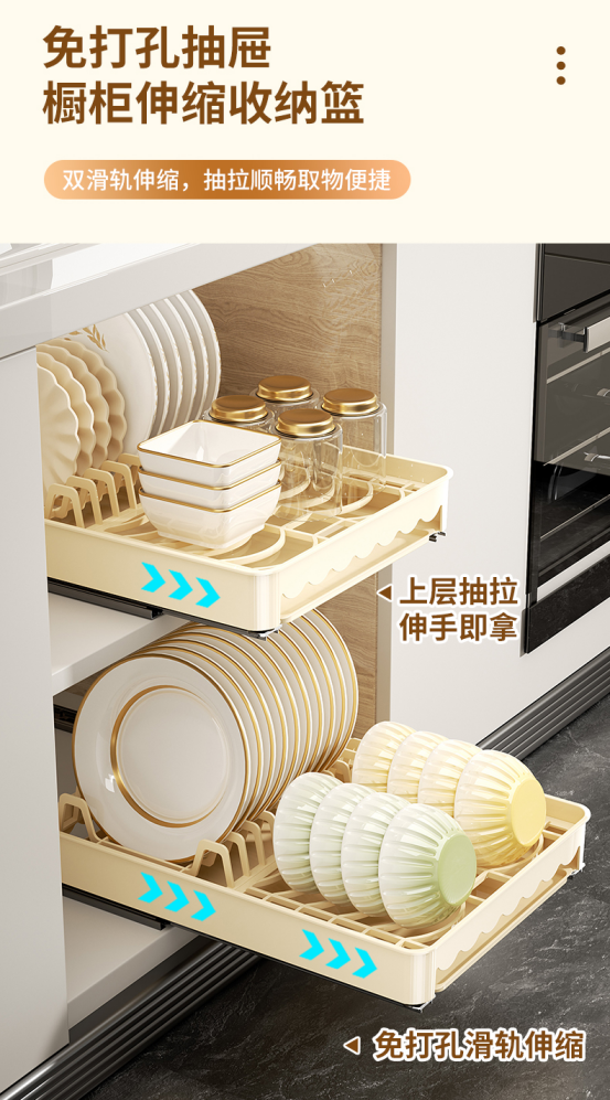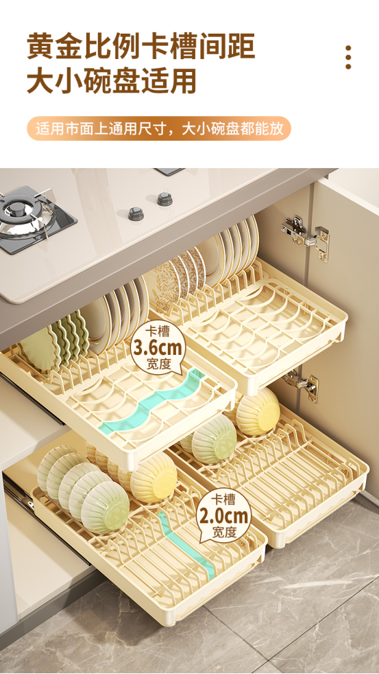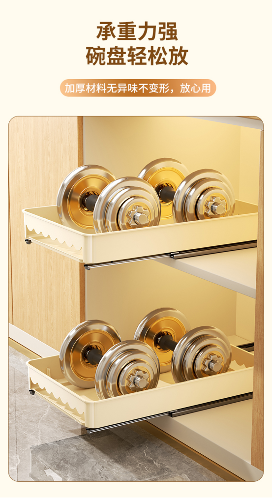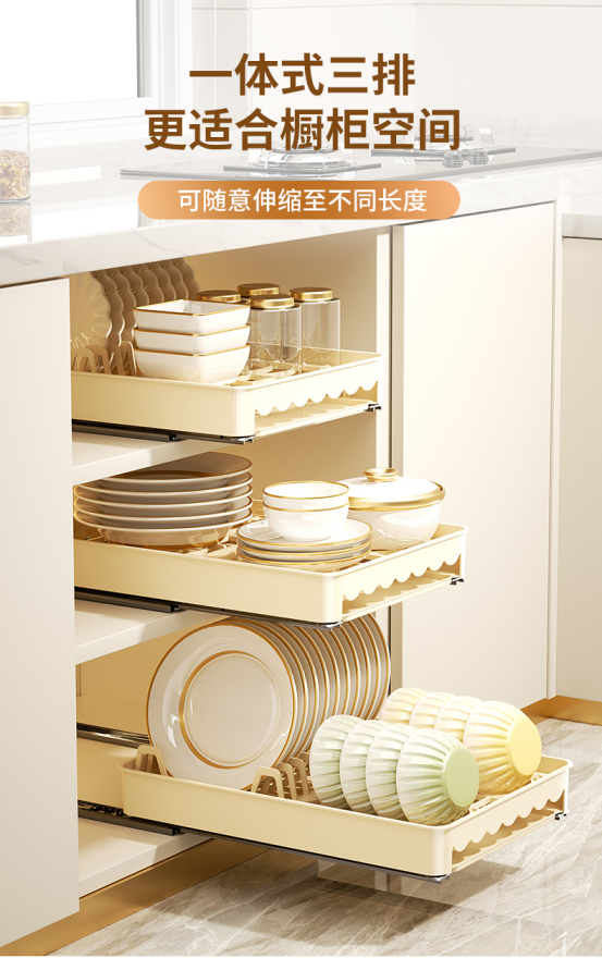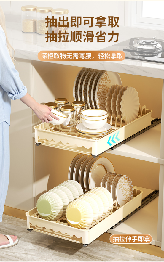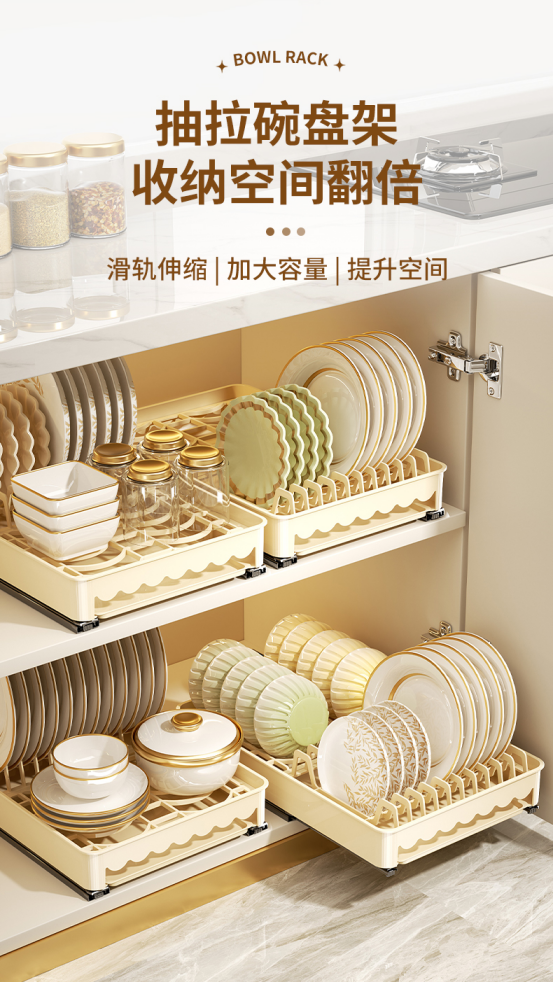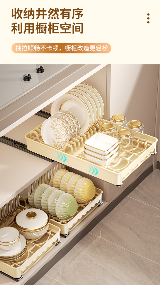 材质方面,优质的抽拉碗盘架通常选用坚固耐用的材料PP抽拉碗盘架,不仅具有良好的承重能力,能够稳稳地放置多个碗盘,而且不易生锈,使用寿命长。 像有的抽拉碗盘架能承受 50 斤重物且不变形,超强的“内力”让人十分放心。