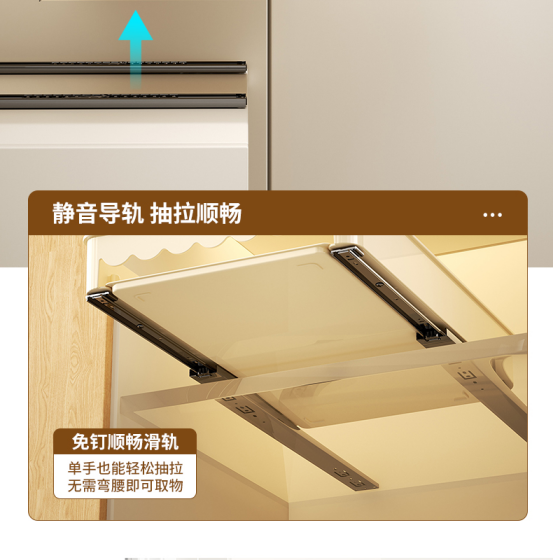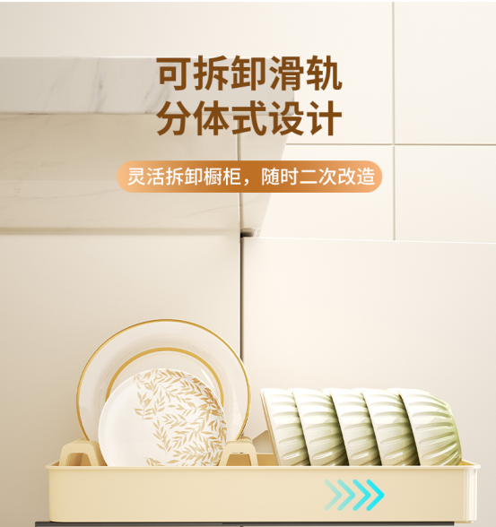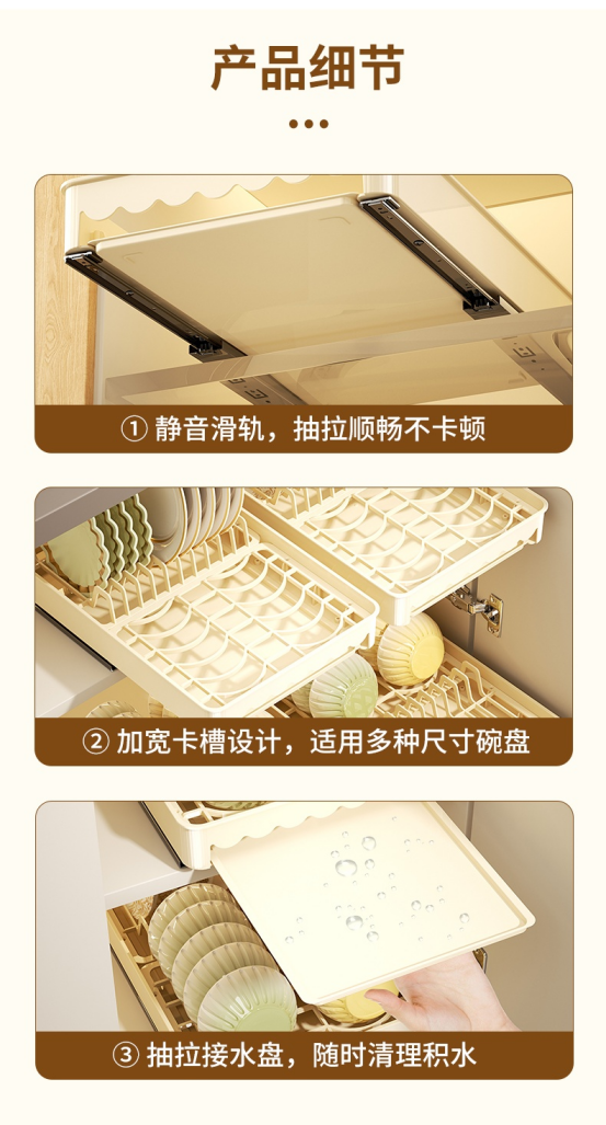 在细节设计上,抽拉碗盘架也考虑得十分周全。 一些产品配备了带缓冲的轨道,猛推猛拉也不怕夹手,操作起来顺滑无声。 官方测试某些高品质轨道开合 10 万次不变形,相当于每天用 14 次能用 20 年,使用起来非常省心。 还有的抽拉碗盘架采用沥水设计,能够及时排走碗盘上的水分,保持碗盘的干爽和卫生,避免滋生细菌。