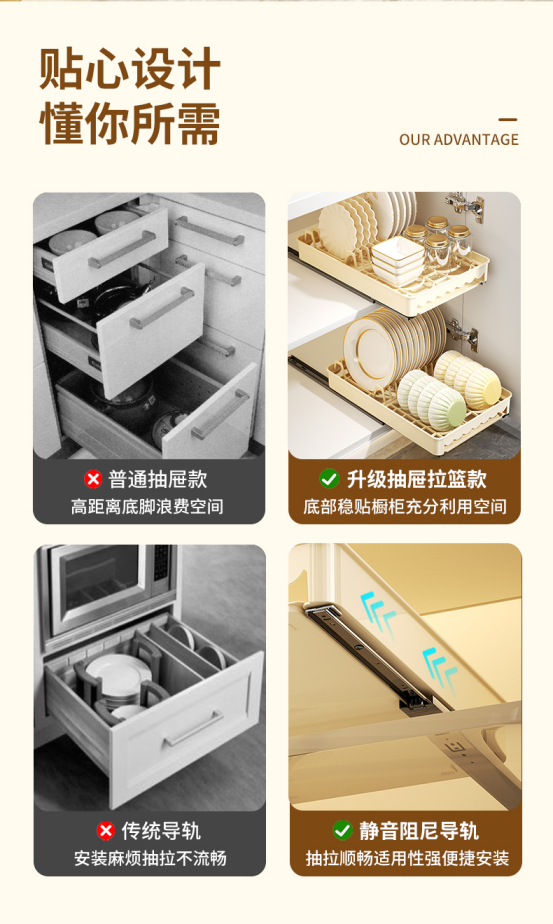 抽拉碗盘架的设计独具匠心。它采用了抽拉式的结构,就像一个灵活的小抽屉,轻轻一拉,所有的碗盘便一目了然。 这种设计极大地提高了空间的利用率,将橱柜的垂直空间充分盘活。 以往那些高柜里难以触及的角落,如今在抽拉碗盘架的帮助下,都能轻松存放碗盘,拿取最里面的碗盘也不费吹灰之力