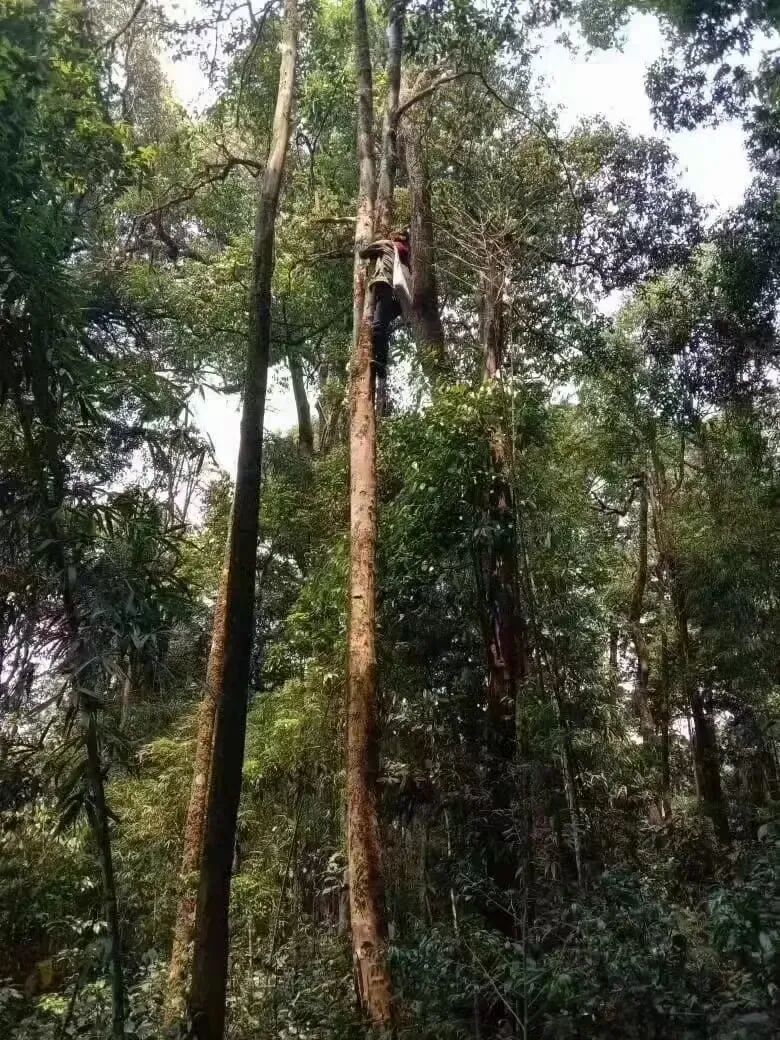 望龙山在热带雨林云南西双版纳勐海深山老林区,顾名思义,人迹罕至,是为为无人区。茶树生长在顶上密林区,与其他林木混生,棵棵分散且独立,高达十几米,顶上一丛树冠,并不太张扬,反而“面积”很少,每棵仅能采摘得了四五公斤鲜叶。