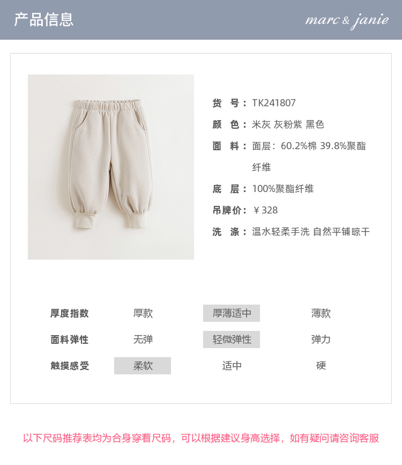 马克珍妮男女童加厚加绒束脚卫裤2024年秋冬新款241807