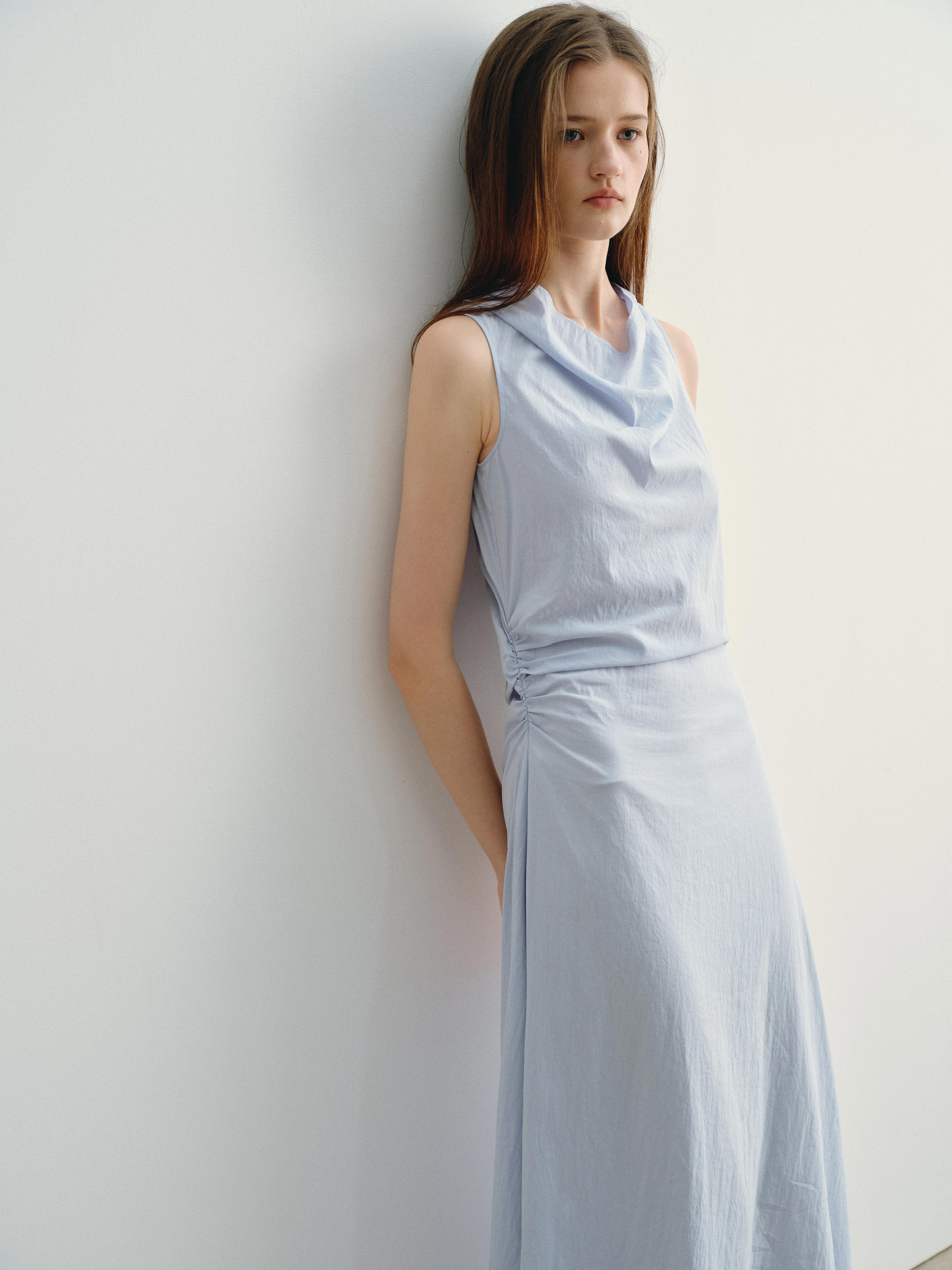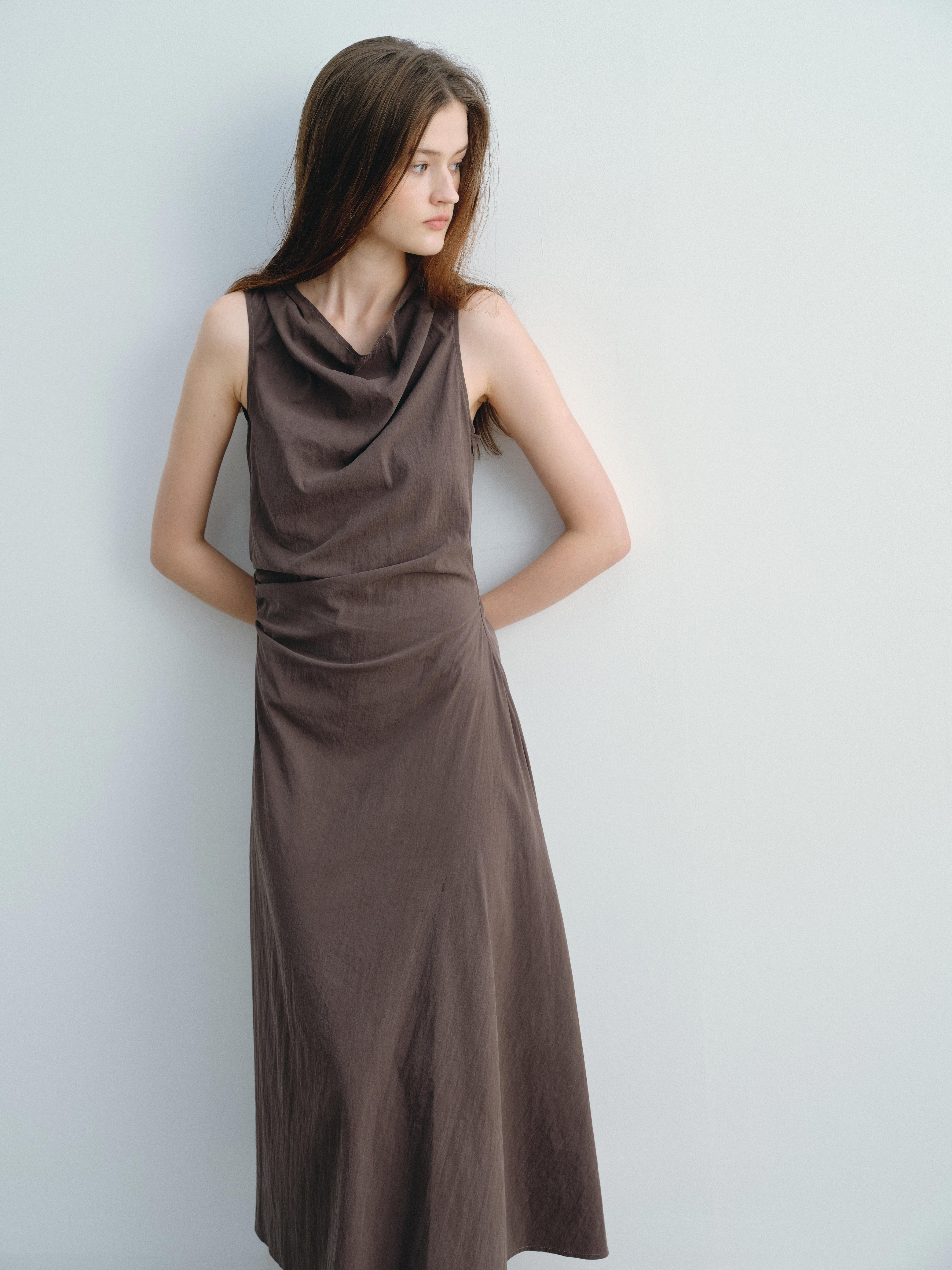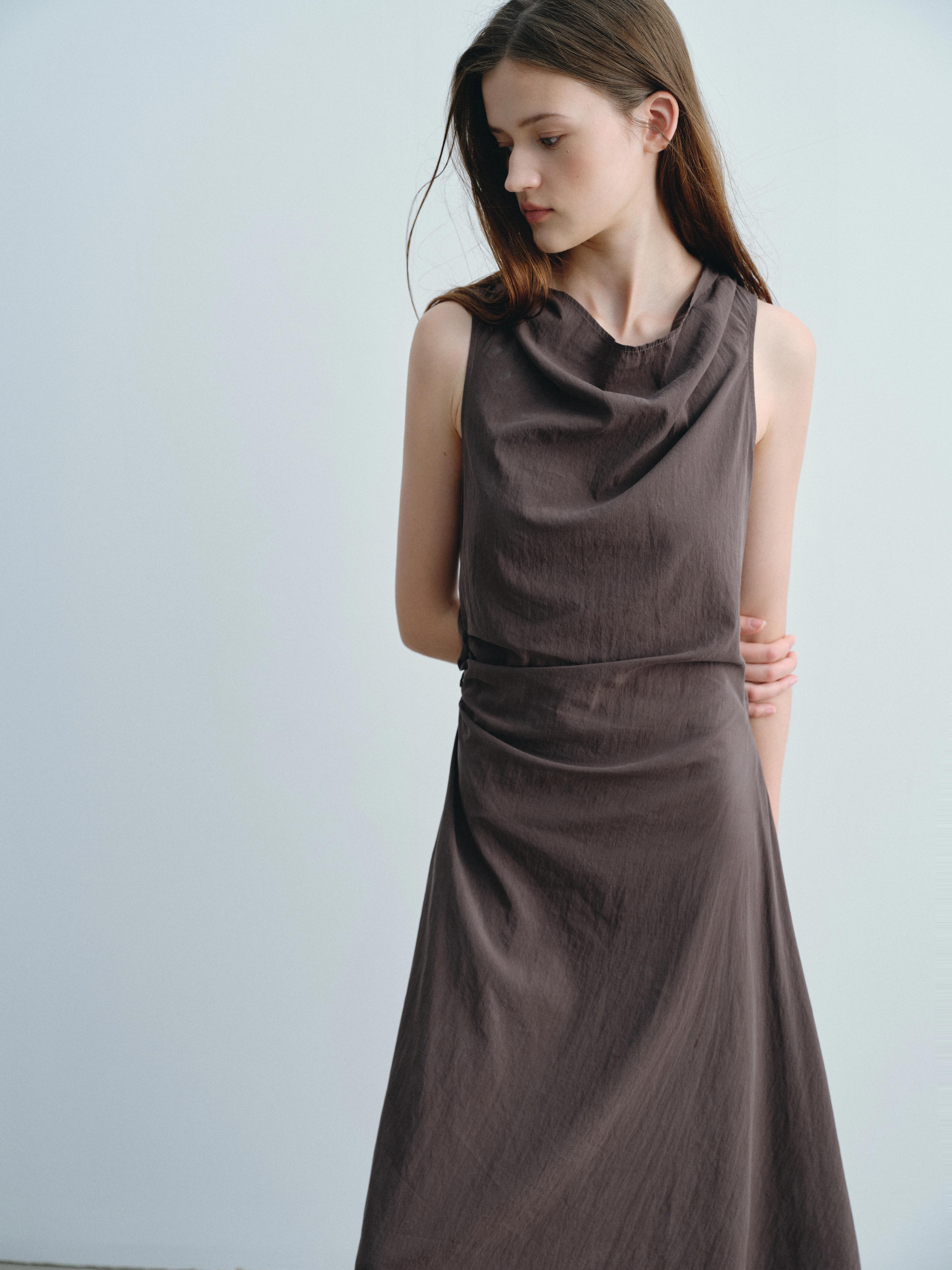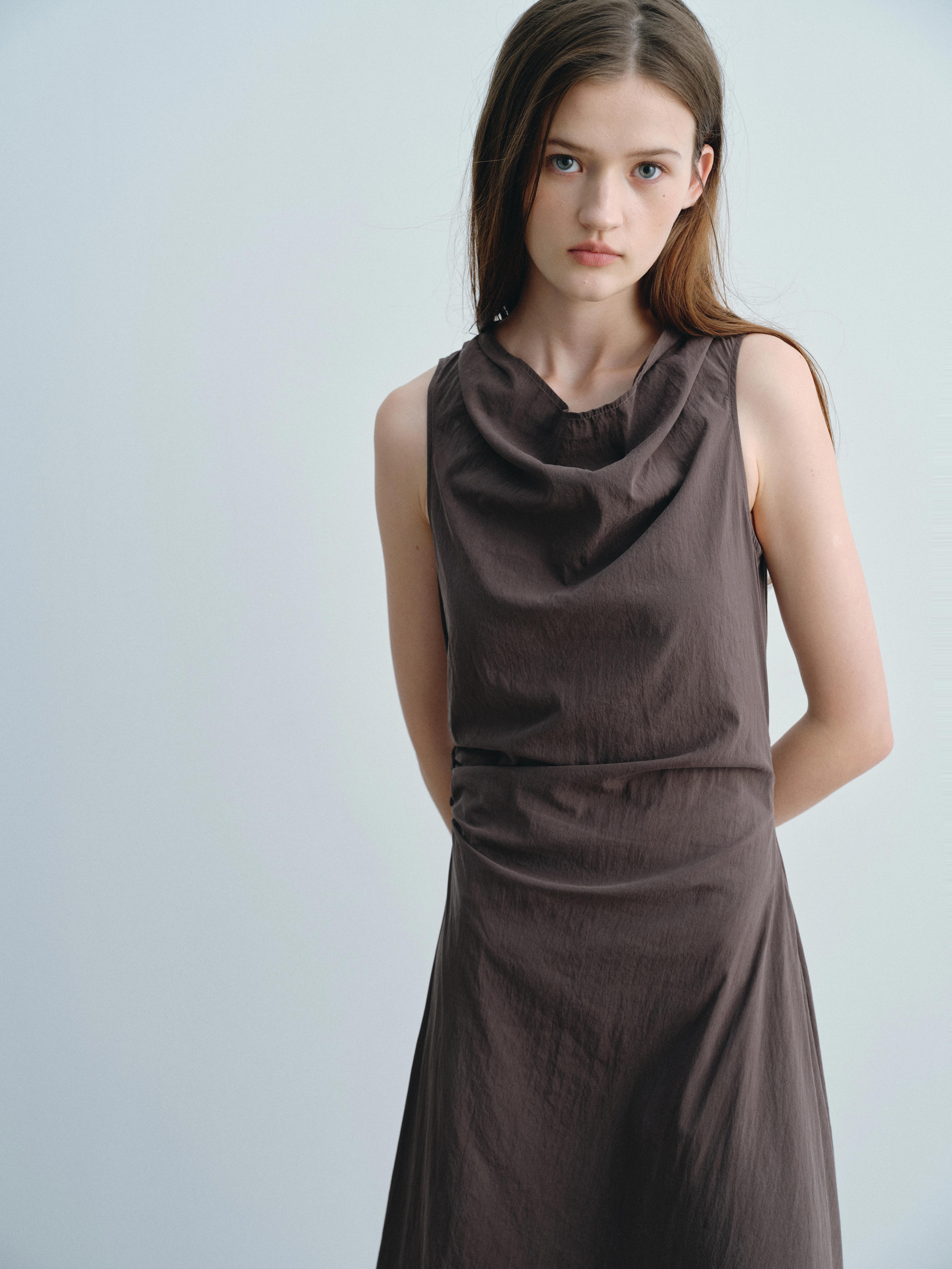 shyshystill/shy202404047/天丝轻盈空气感荡领无袖两色捏褶收腰连衣裙