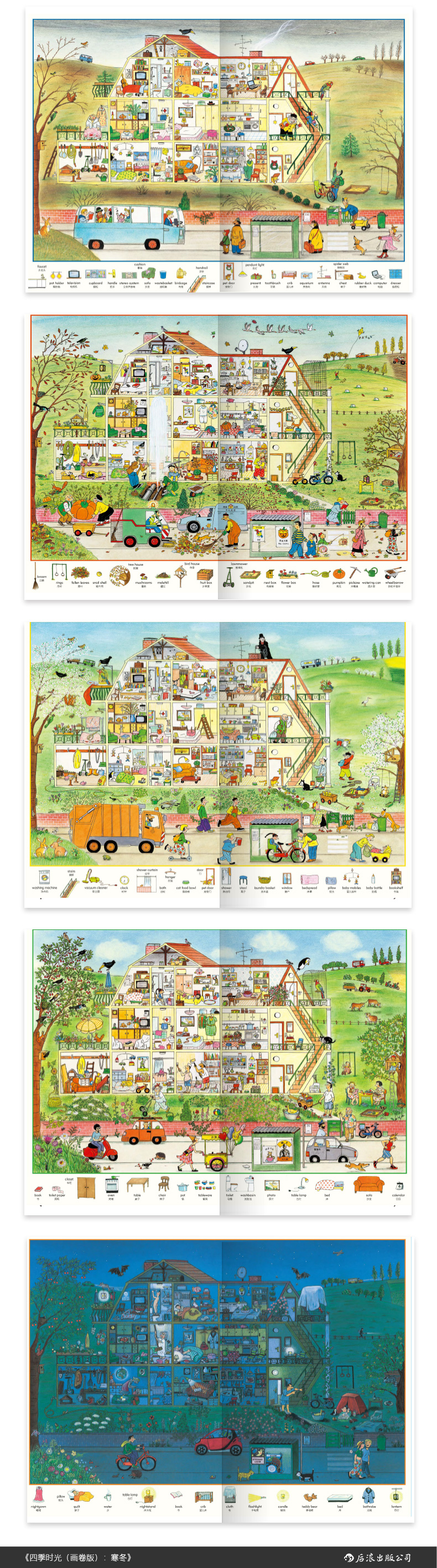 《四季时光·画卷版》与《四季时光·*具=**中英双语》相比,依然保留了中英双语词汇,但采用大开本的风琴折页装,每册展开长达4米,全套5册从上到下拼合则面积近8平米,便于孩子铺在地板上,一页一页对照观察,发现有趣的故事,爱上温暖的生活。