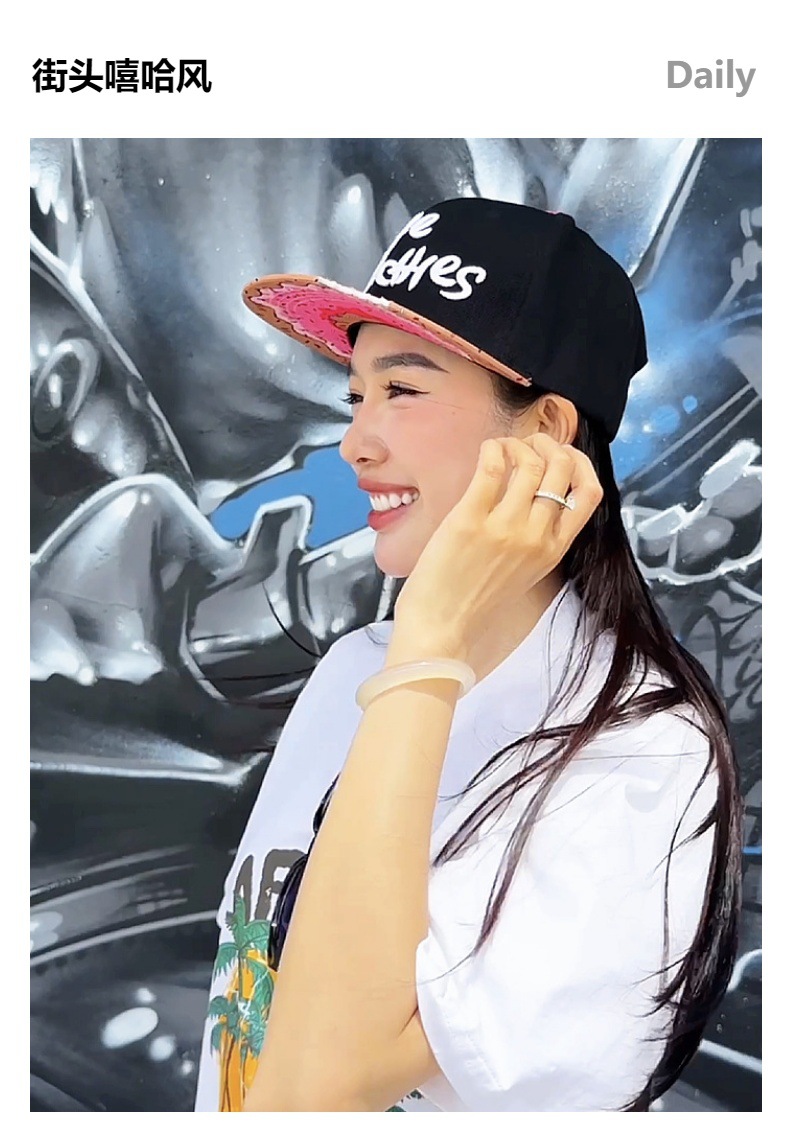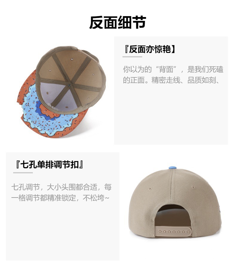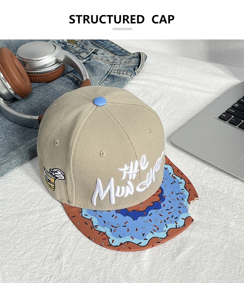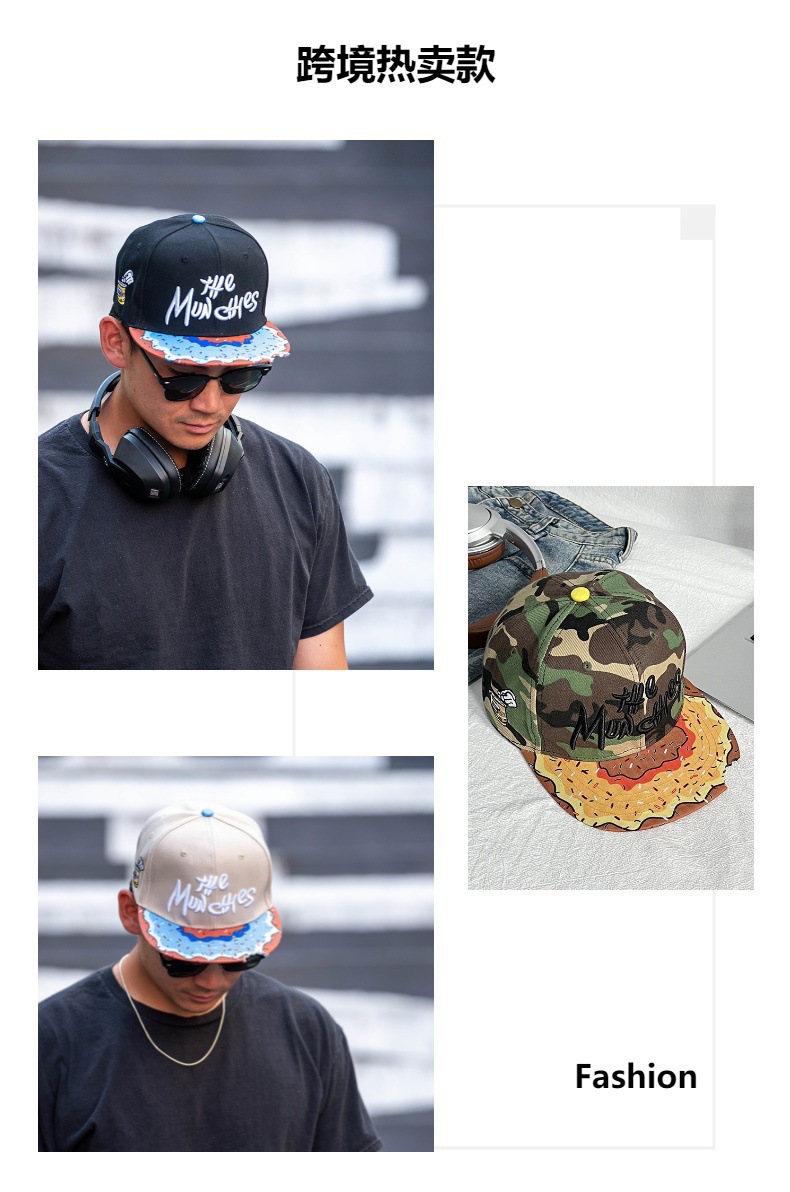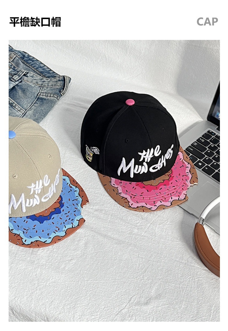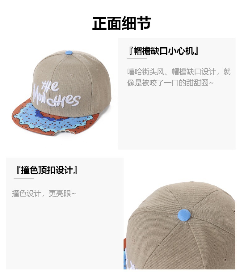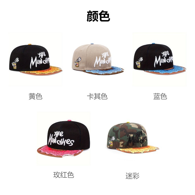 【美式嘻哈!百搭不挑人】MUNCHIES刺绣卡通零食平沿嘻哈帽帽檐缺口休闲街舞帽子棒球帽。xa