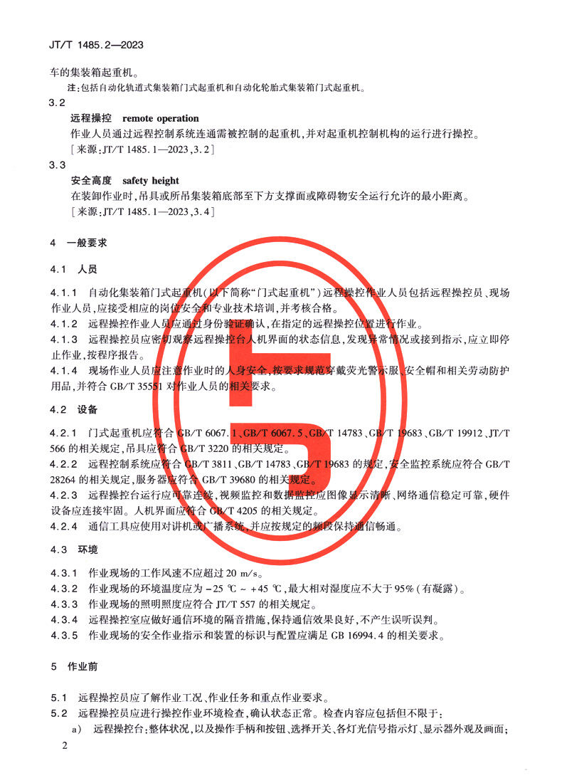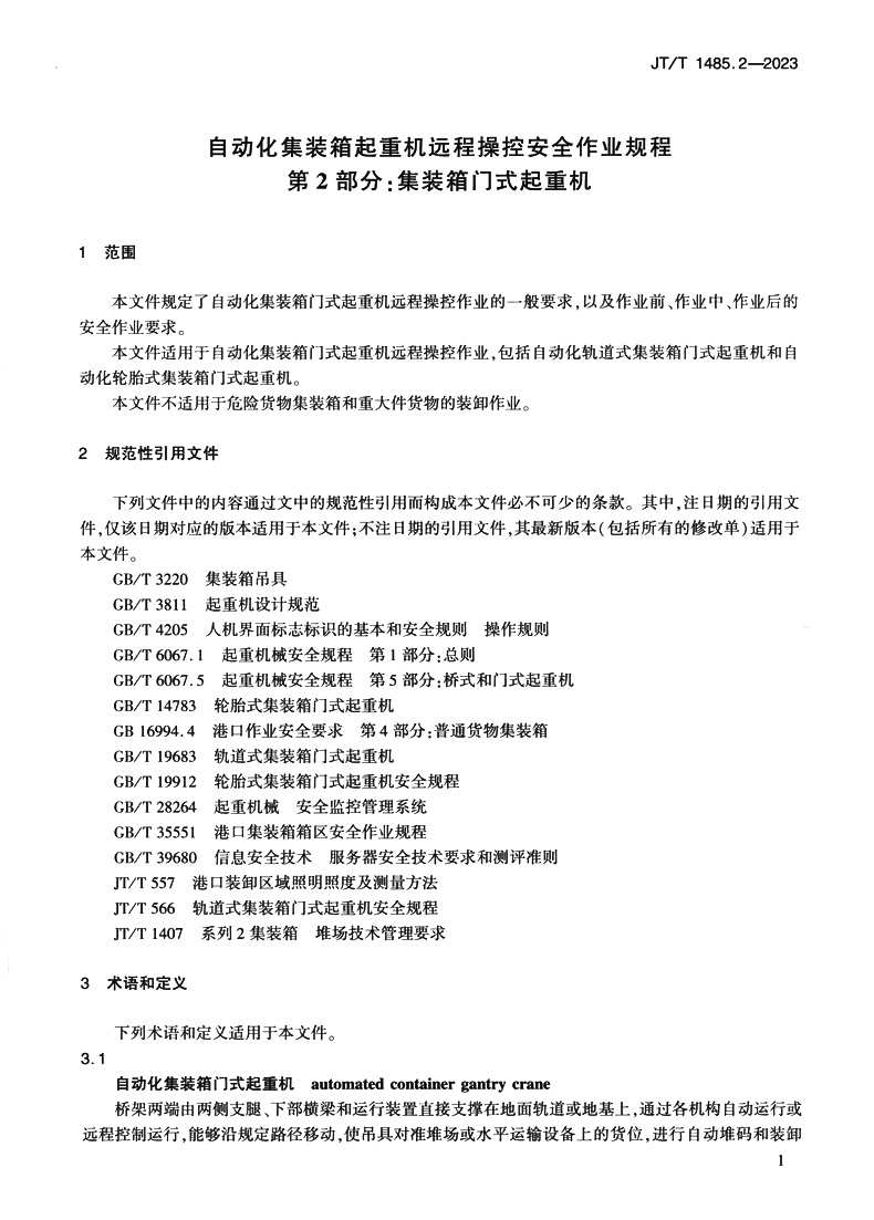 自动化集装箱起重机远程操控安全作业规程 第2部分:集装箱门式起重机(JT/T 1485.2—2023)